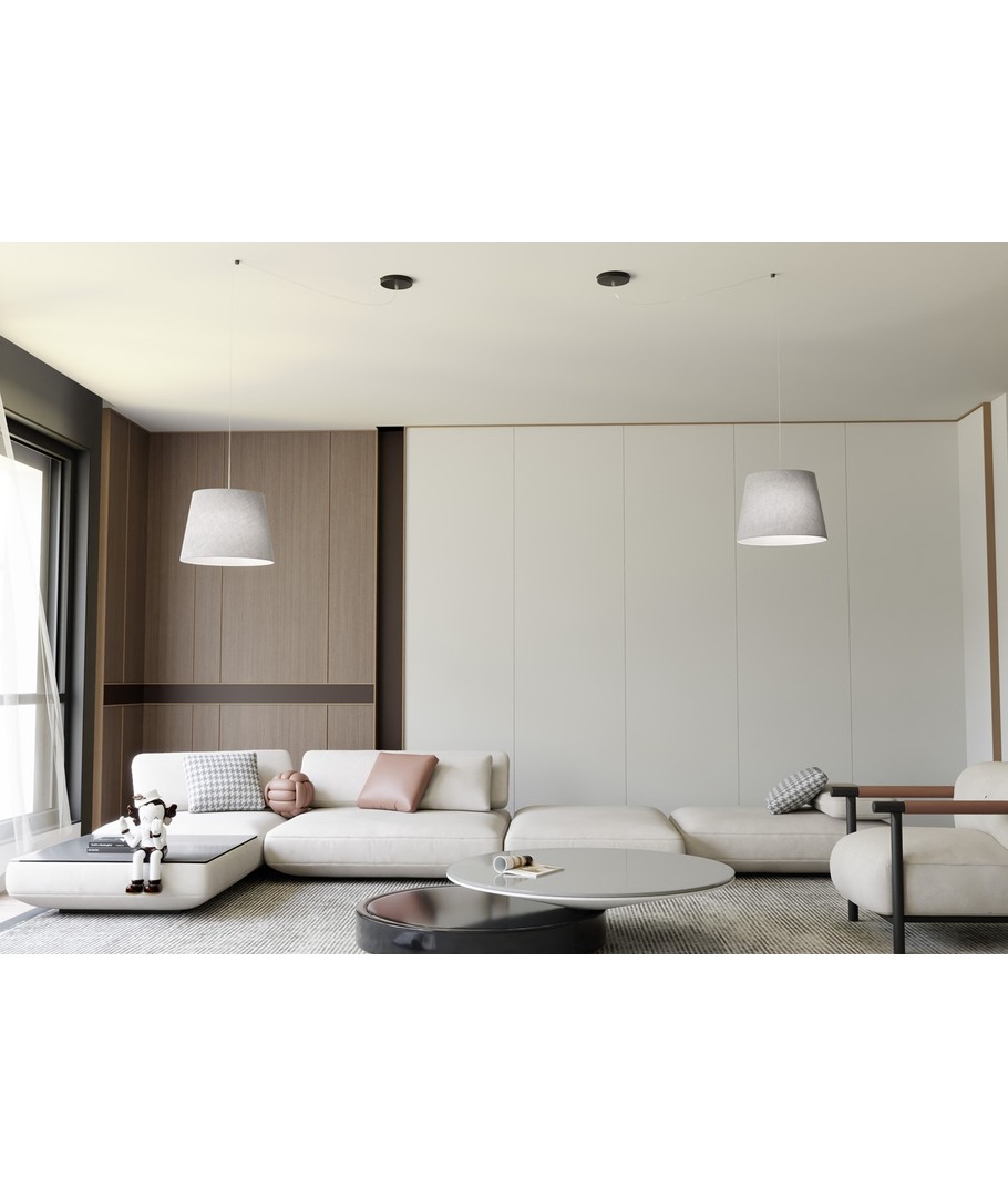 Ascot 1 Grå pendellampe tilbyr en elegant kombinasjon av minimalistisk design og moderne funksjonalitet. Med sin stoffskjerm i subtile grå nyanser, sender den ut et behagelig, diffust lys som skaper en varm atmosfære i ethvert rom.
