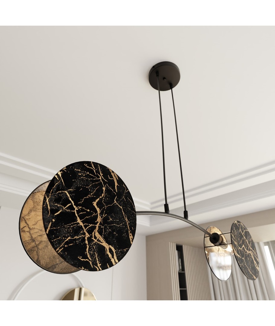 Den sømløse integrasjonen av moderne estetikk og praktiske funksjoner gjør denne lampen ideell for både stue og spisestue. Dens justerbare høyde gir fleksibilitet i plasseringen, og dens stilrene svarte og gullfarger passer perfekt inn i enhver moderne innredning.