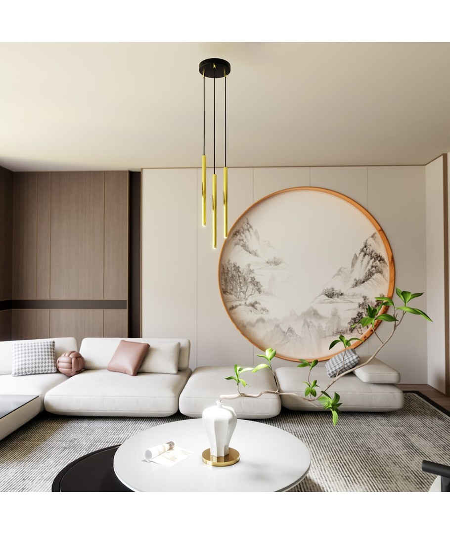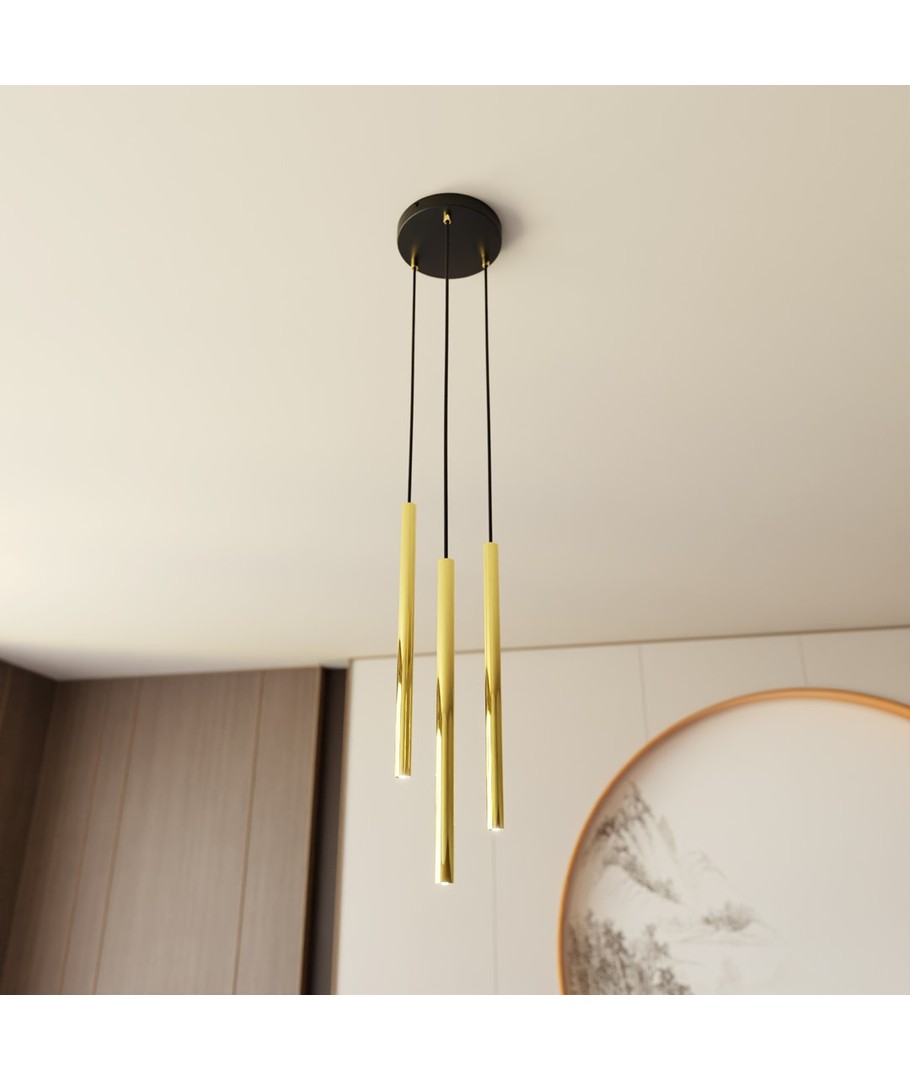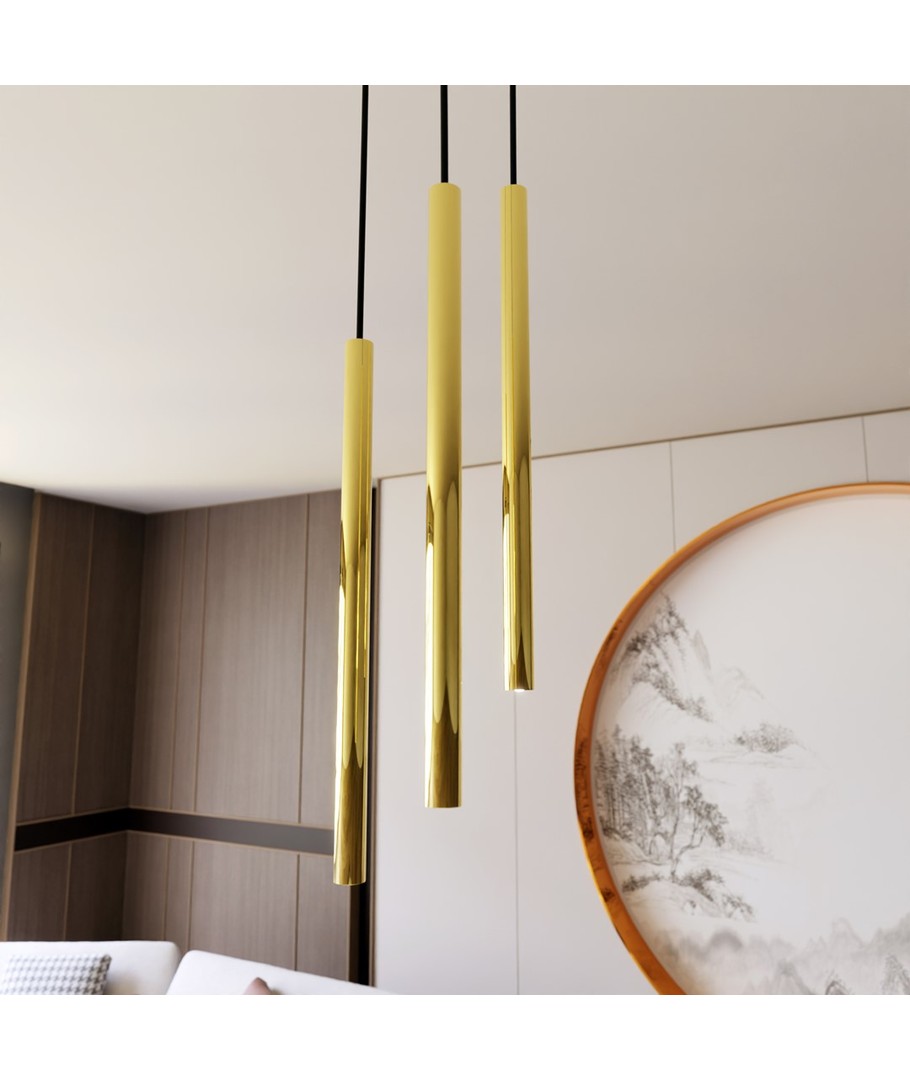 Selter 3 Premium Gull pendellampe er en elegant tillegg til ethvert hjem, hvor moderne design og glamour forenes i et unikt uttrykk. De gyldne rørene som utgjør lampens struktur, kaster et glitrende skjær og tilfører en luksuriøs aksent til ethvert rom. Denne lampen er ideell for de som ønsker å introdusere en raffinert sjarm og et subtilt glamorøst preg til interiøret. Med sitt justerbare design kan lampen tilpasses forskjellige romhøyder, noe som gjør den til en allsidig og stilfull belysningsløsning.