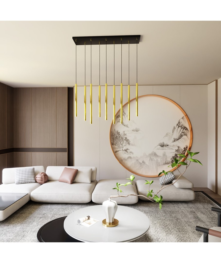 Selter 9 Gull pendellampe er det perfekte valget for dem som ønsker å legge til både klasse og moderne stil til sitt hjem. Med sine gyldne rør som elegant henger fra en sort ramme, bringer denne lampen ikke bare lys til ditt rom, men også en følelse av glamour og raffinement. Det unike designet fungerer som et luksuriøst fokuspunkt, som forvandler enhver stue eller spiseområde til en stilfull oase. Selter-serien er ideell for dem som ønsker et snev av subtil eleganse og tidløs skjønnhet.