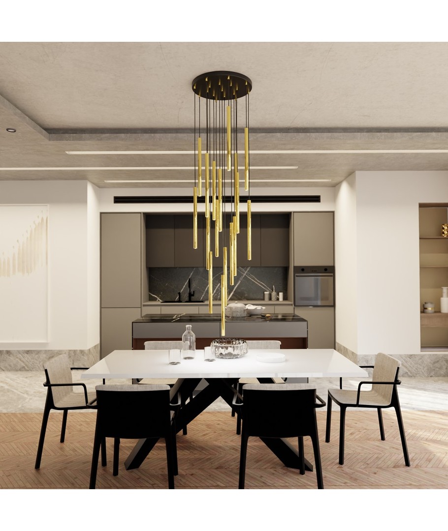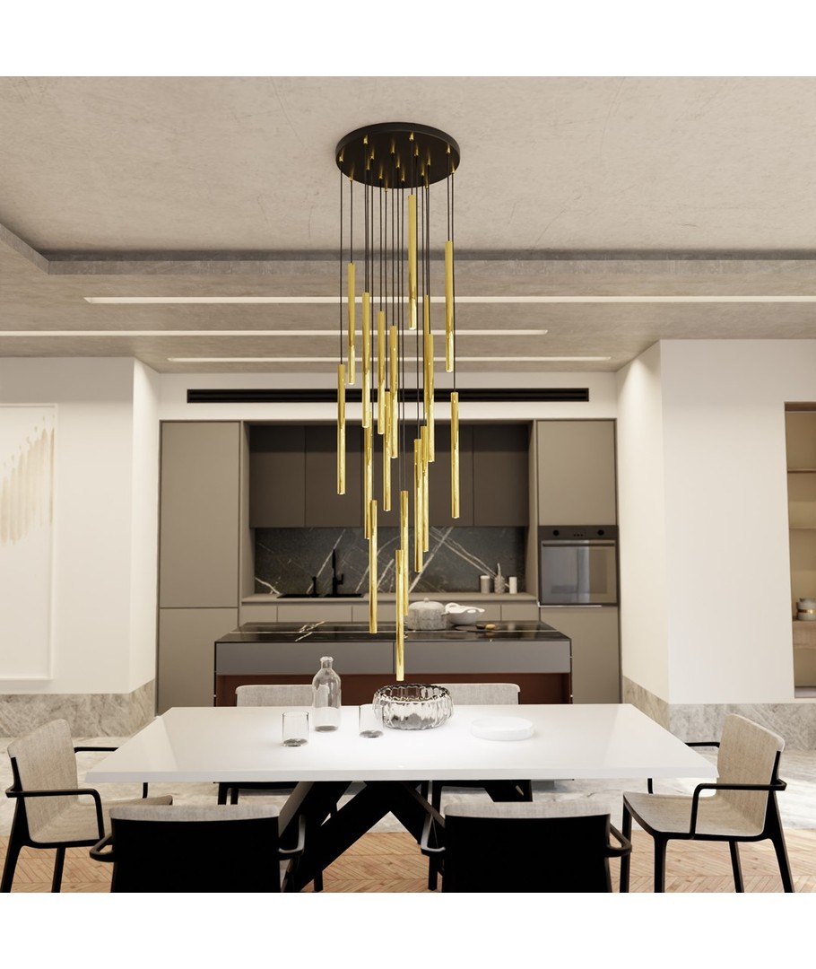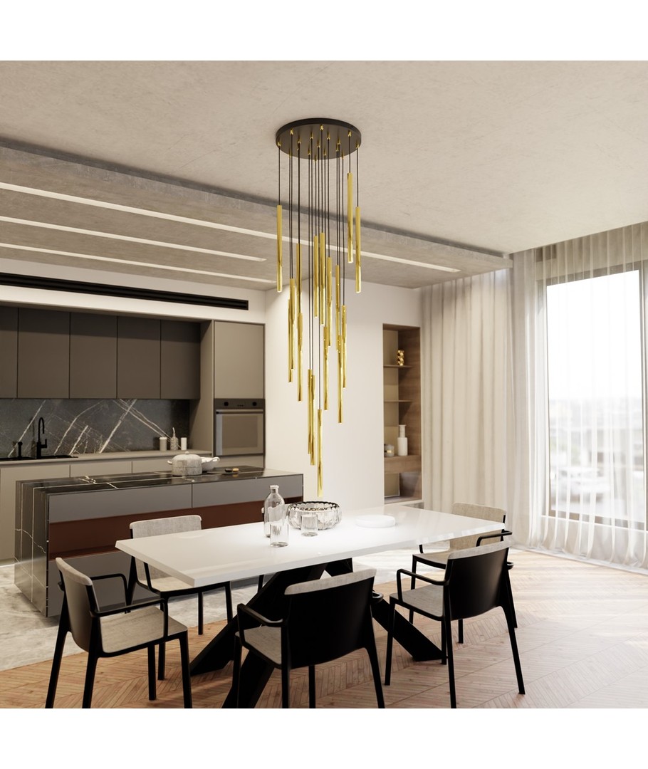 Opplev en unik kombinasjon av glamour og moderne design med Selter 17 Premium Gull pendellampe. Denne elegante lampen er bygget av gyldne rør, som stråler med en enestående glans og eleganse. Med sitt skinnende uttrykk blir denne lampen ikke bare en kilde til lys, men også et luksuriøst element i ethvert rom. Perfekt for de som ønsker å legge til raffinert sjarm og subtil glamour til interiøret. Selter-serien tilbyr justerbar høyde, noe som gjør det lett å tilpasse lampen etter dine behov og skape den perfekte atmosfæren i ditt hjem.
