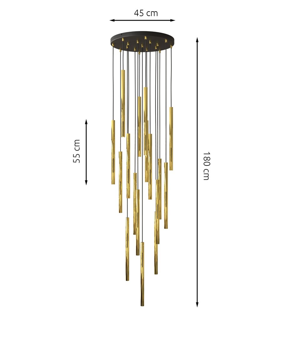 Lampen har et slankt design med en diameter på kun Ø20 mm, noe som gjør at den kan passe inn i selv de mest stilrene interiører uten å ta for mye plass. Den totale størrelsen er 450 x 1800 x 450 mm, noe som gir den en imponerende tilstedeværelse i ethvert rom.