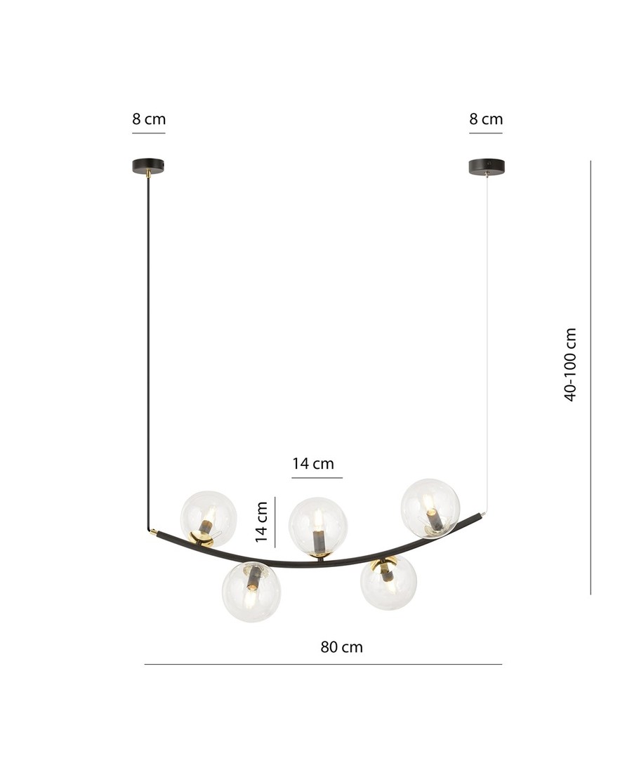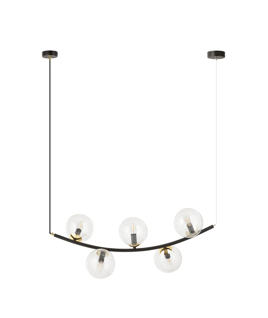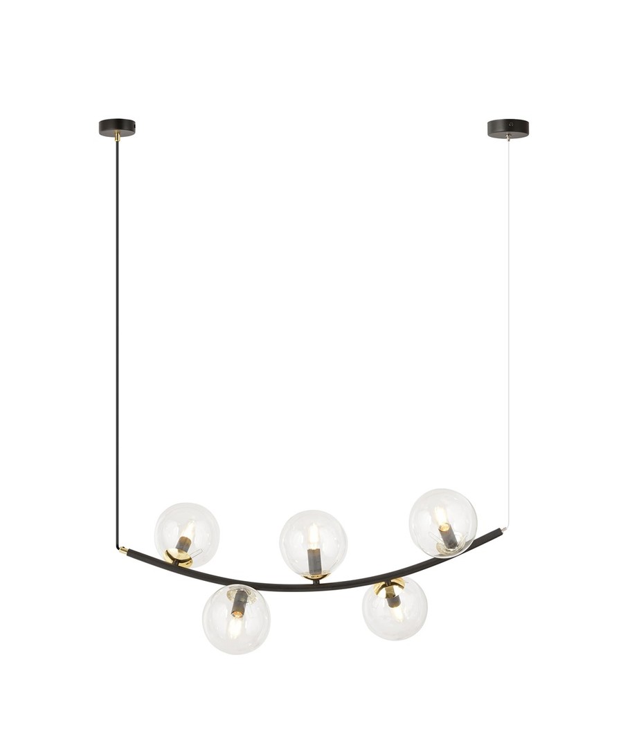 Ritz 5 Sort/Transparent pendellampe har et raffinert design med en kombinasjon av sort og transparent, som sørger for en nydelig lysfordeling og et strålende uttrykk. Denne lampen henger vakkert i enten stue, gang eller over spisebordet, hvor den vil fange alles oppmerksomhet.
