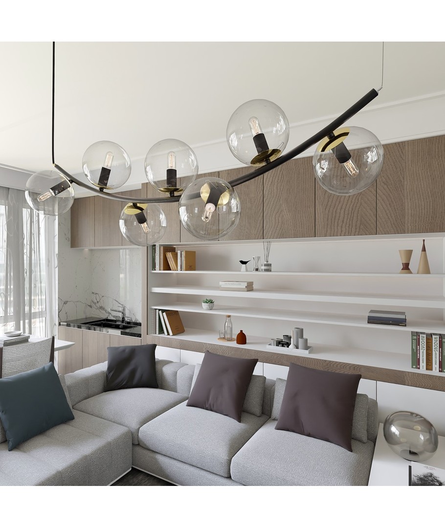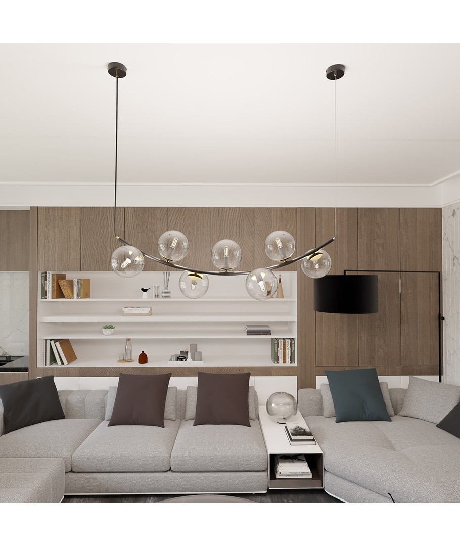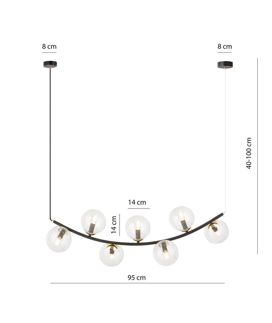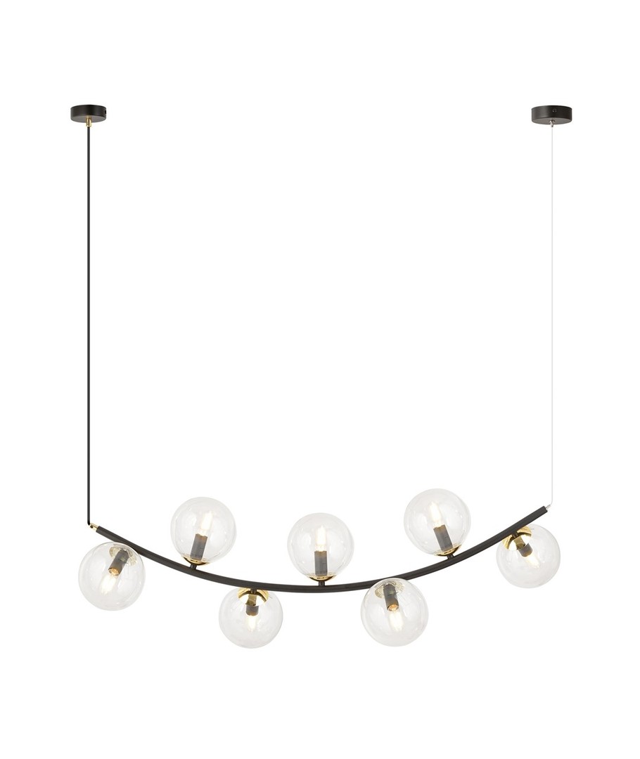 Opplev den perfekte kombinasjonen av moderne eleganse og funksjonell belysning med Ritz 7 Sort/Transparent pendellampe. Designet for å fremheve det minimalistiske uttrykket i ditt hjem, er denne lampen laget av pulverlakkert stål i sort, som harmonerer med de transparente lampeskjermene. Formen av en halvsirkel med ujevnt plasserte skjermer gir et unikt og sofistikert utseende. Ideell for ethvert rom som trenger en oppgradering, tilbyr Ritz pendellampe både estetisk appell og praktisk belysning.