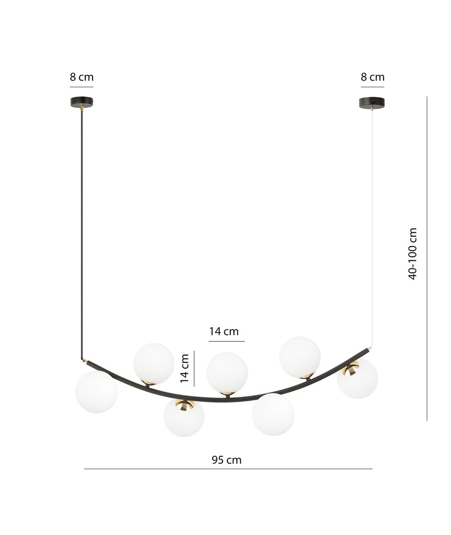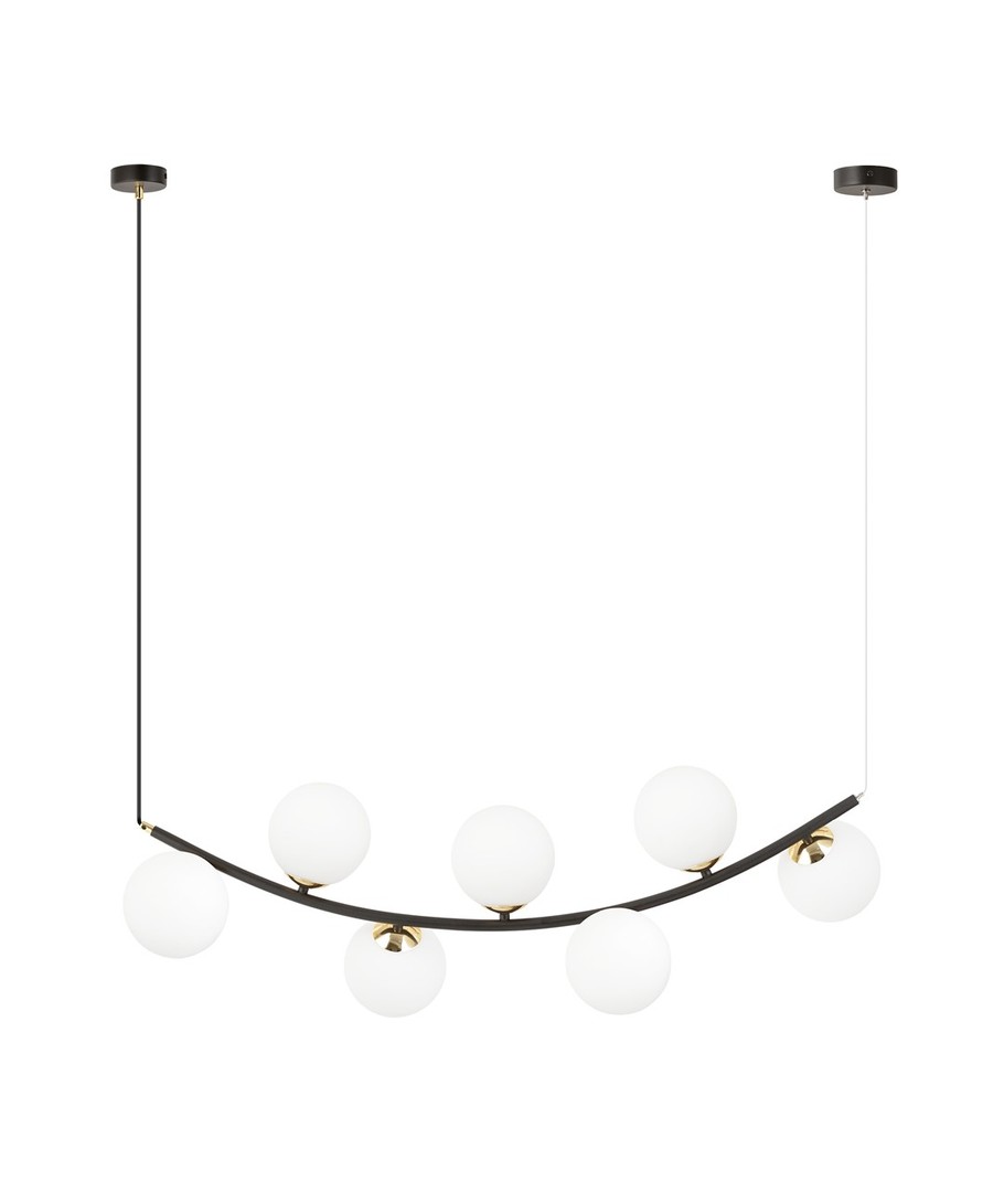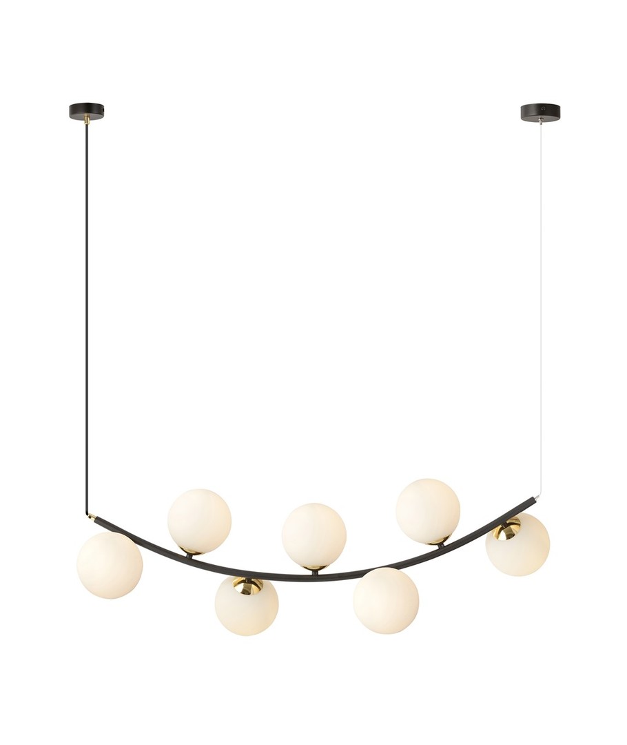 Opplev den enkle elegansen av minimalistisk design med Ritz 7 Sort/Opal pendellampen. Denne vakre lampen er laget av sort pulverlakkert stål og glass, og skaper en perfekt balanse mellom funksjon og estetikk. Lampens halvsirkelformet design, med uregelmessig plasserte skjermer, tilfører en unik karakter til ditt interiør og understreker en moderne og sofistikert stil. Ideell for å gi nytt liv til ditt hjem, tilbyr denne pendellampen en både praktisk og stilfull belysningsløsning som vil fremheve skjønnheten i dine rom.