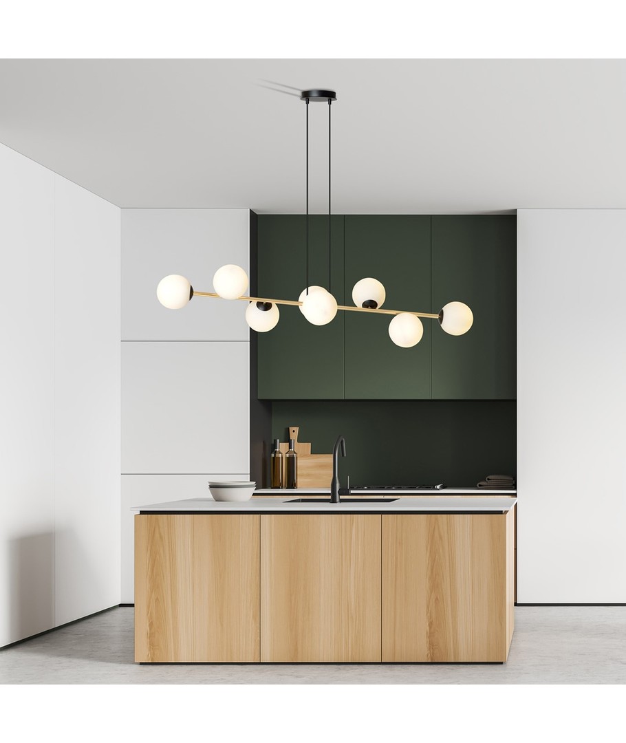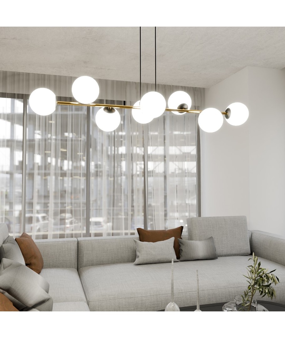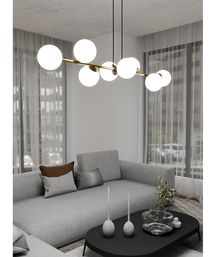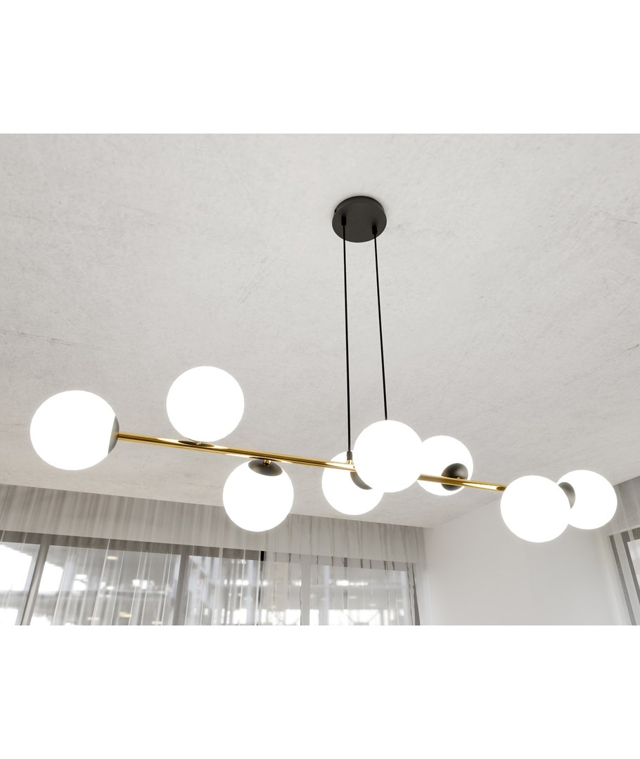 Gravity 8 sort/opale pendellampe er en perfekt kombinasjon av minimalistisk design og glamorøse detaljer i gull, som gir et unikt preg av eleganse og sjarm til ethvert rom. Lampen er ideell for både moderne og klassiske interiører og tilfører karakter og en atmosfære av eksklusivitet. Laget av materialer av høyeste kvalitet, sikrer Gravity pendellampe både holdbarhet og et vakkert utseende over tid. De gylne detaljene skaper en vakker kontrast til det minimalistiske designet, noe som gir interiøret liv med strålende stil.