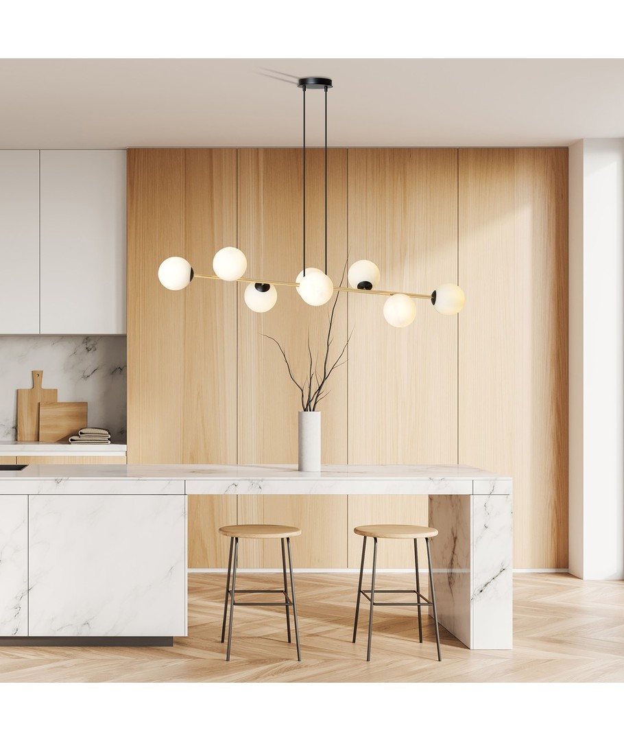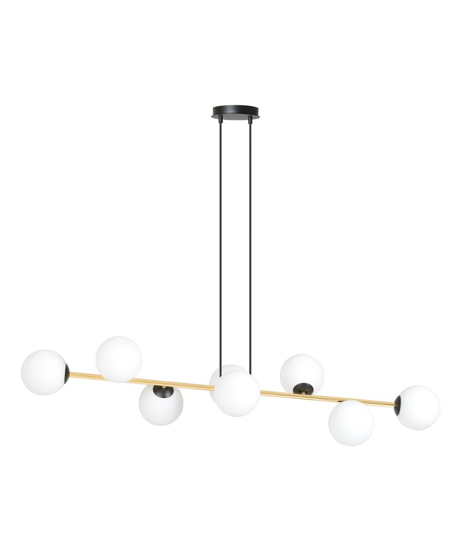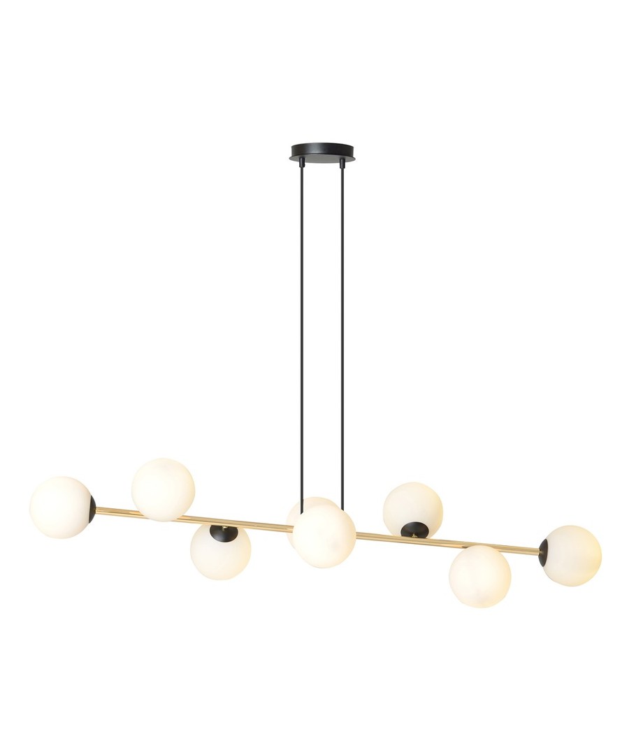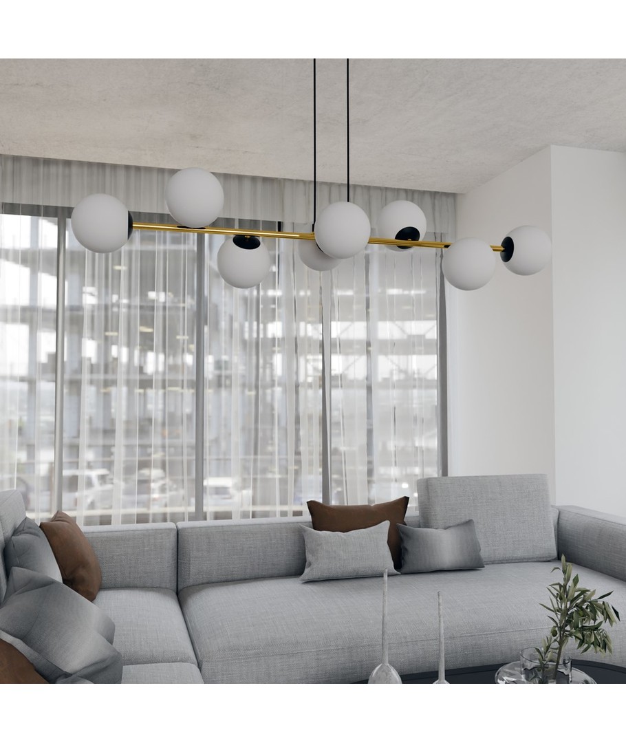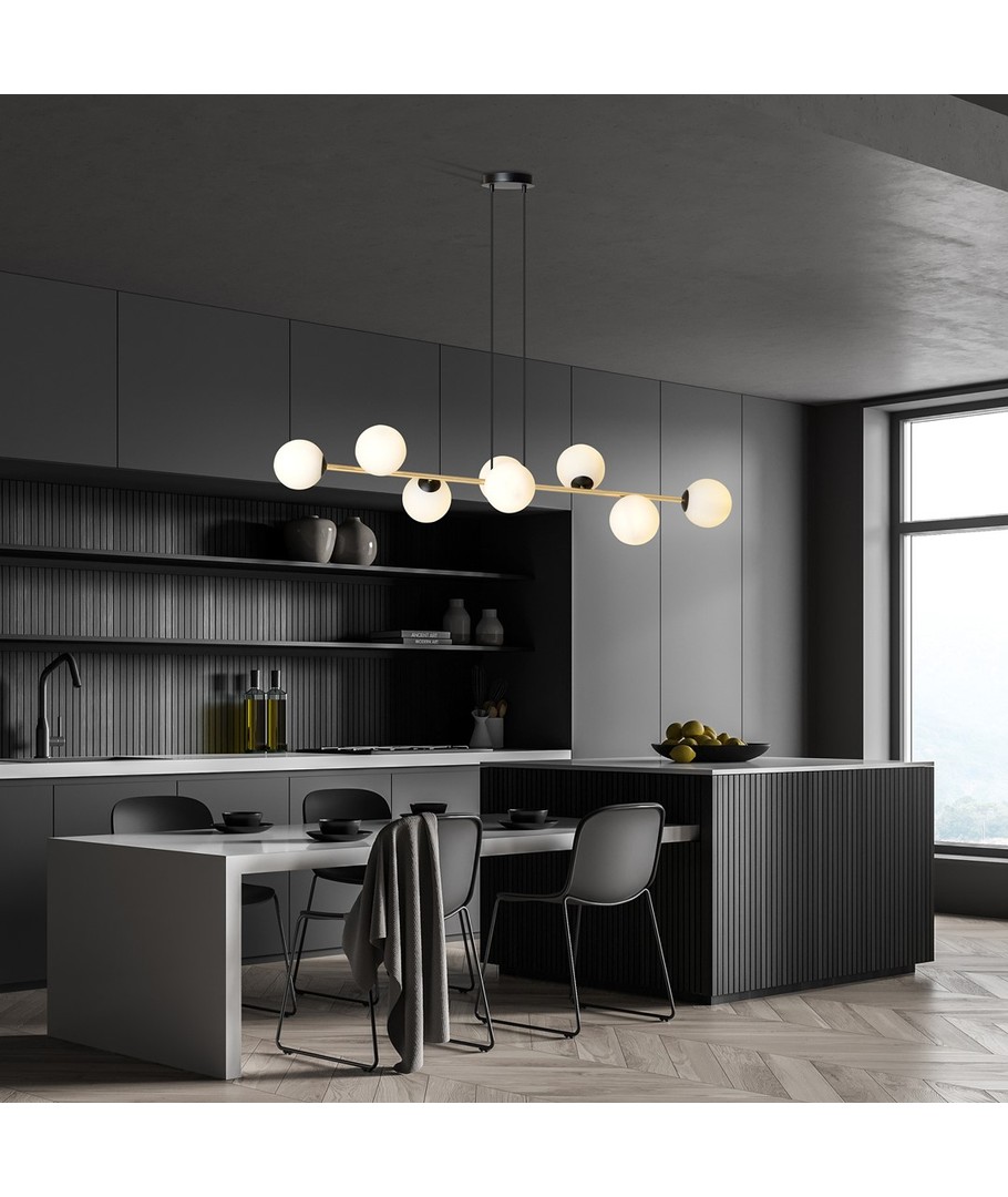 Gravity 8 sort/opale pendellampe er en perfekt kombinasjon av minimalistisk design og glamorøse detaljer i gull, som gir et unikt preg av eleganse og sjarm til ethvert rom. Lampen er ideell for både moderne og klassiske interiører og tilfører karakter og en atmosfære av eksklusivitet. Laget av materialer av høyeste kvalitet, sikrer Gravity pendellampe både holdbarhet og et vakkert utseende over tid. De gylne detaljene skaper en vakker kontrast til det minimalistiske designet, noe som gir interiøret liv med strålende stil.