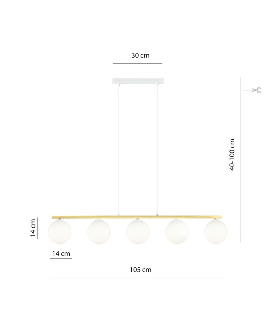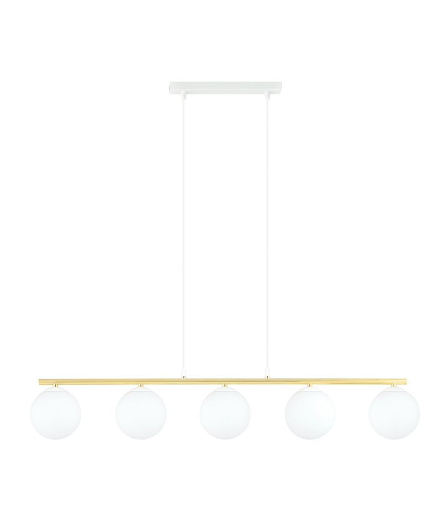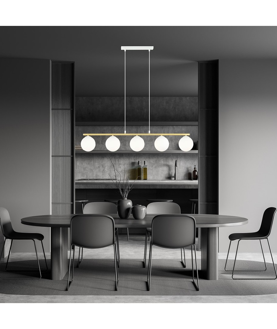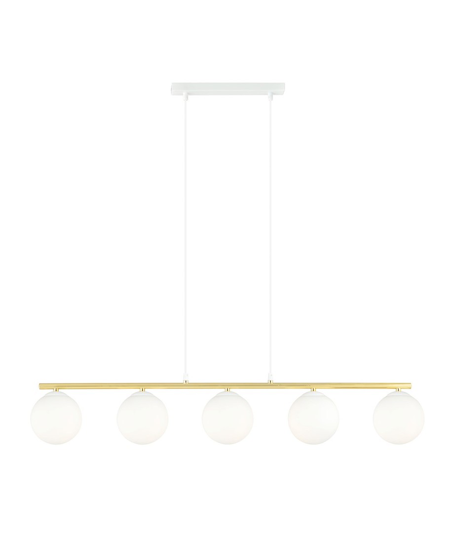 Allora 5 Hvit/Opal pendellampe er et perfekt valg for de som ønsker å legge til en sofistikert stil til sitt hjem. Med sitt moderne design kombinert med et snev av glamour, er denne lampen ideell for både moderne og tradisjonelle interiører. Den subtile formen og elegante gullaksentene gjør lampen unik og karakteristisk. Heng den over spisebordet eller i stuen for å skape en elegant atmosfære som imponerer. Lampen er designet med kvalitet i tankene og vil være et varig element i din boliginnredning.