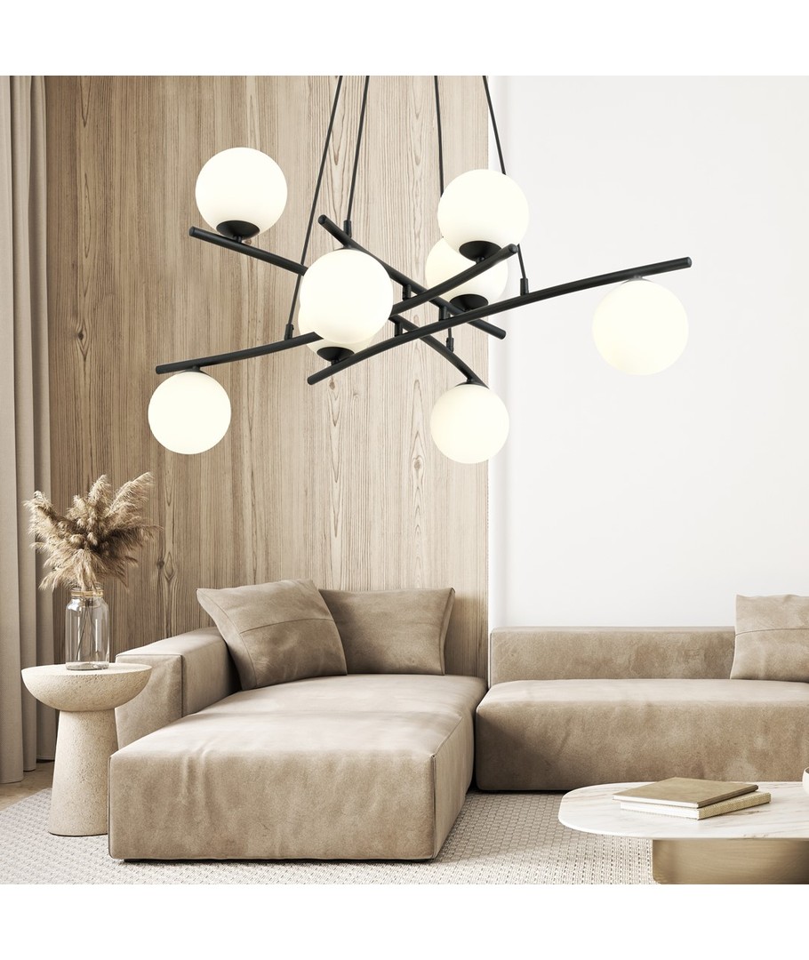 Essa 8 Opal pendellampe er en del av en spesiell serie taklamper som imponerer med sin enestående og originale form. Denne lampen tiltrekker oppmerksomhet med sin ekspansive konstruksjon og passer perfekt i stuen, hvor den tilfører unikt karakter og stil. Med sine glasslampeskjermer fremstår Essa lampen lett og elegant, noe som bidrar til en grasiøs belysning av selv store rom. Det er en funksjonell lyskilde som vakkert lyser opp dine omgivelser og tilfører en unik sjarm til innredningen.