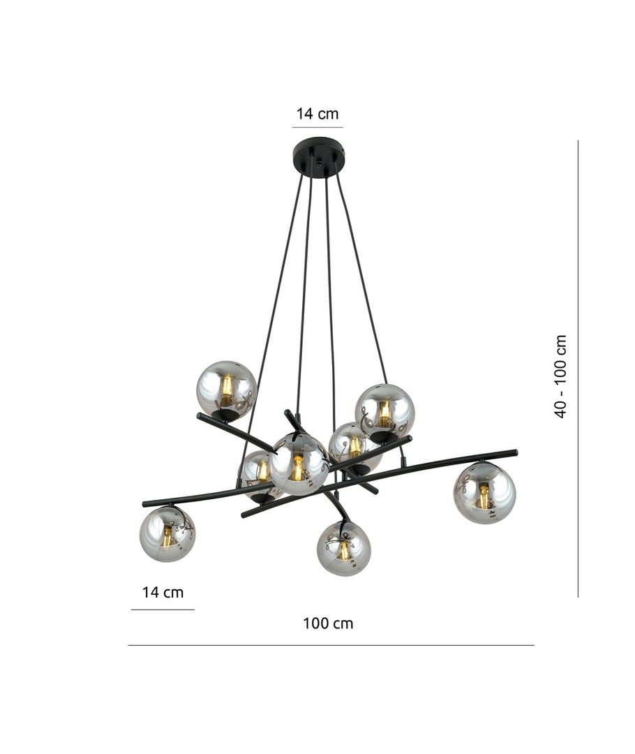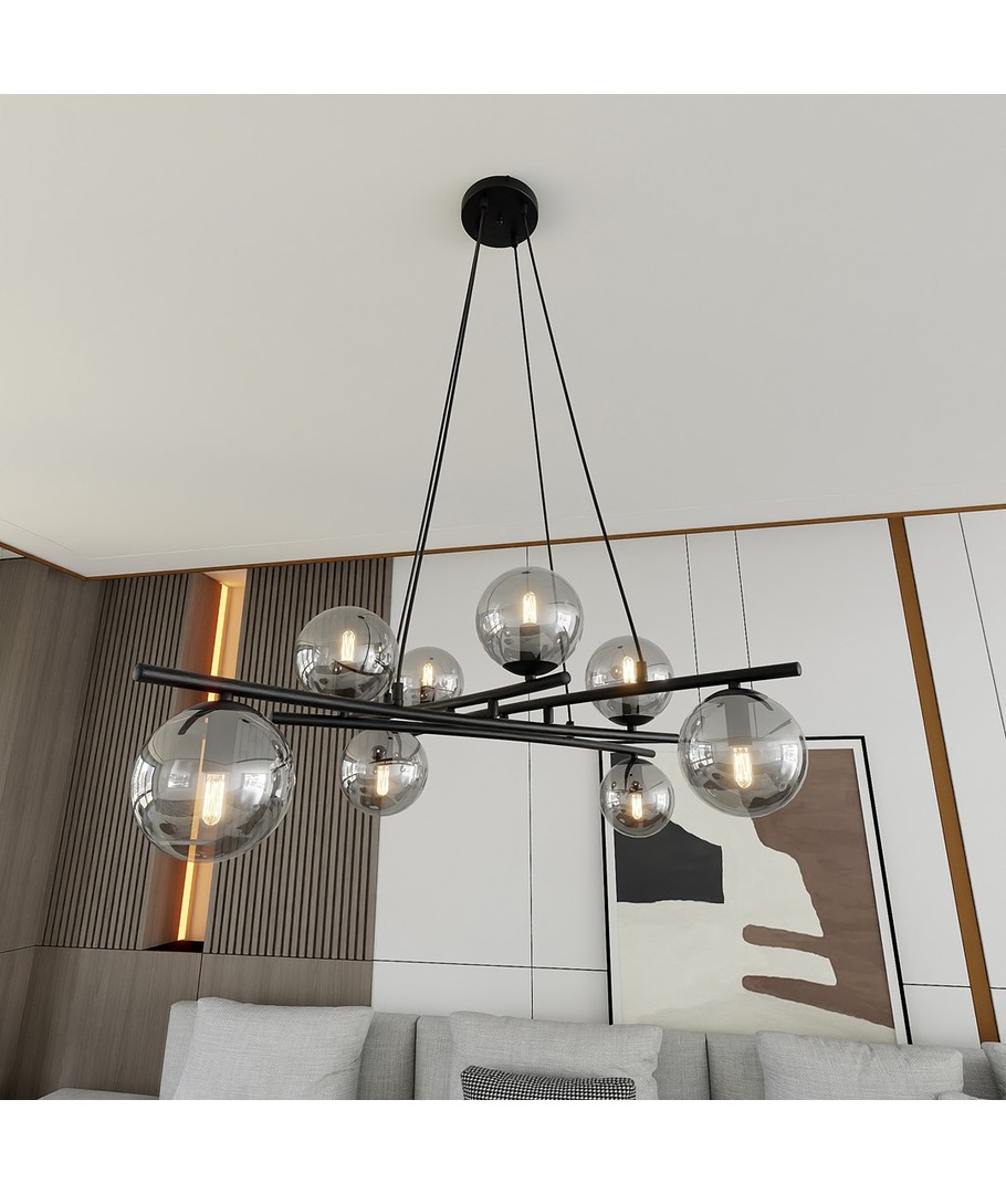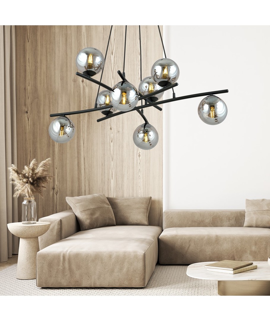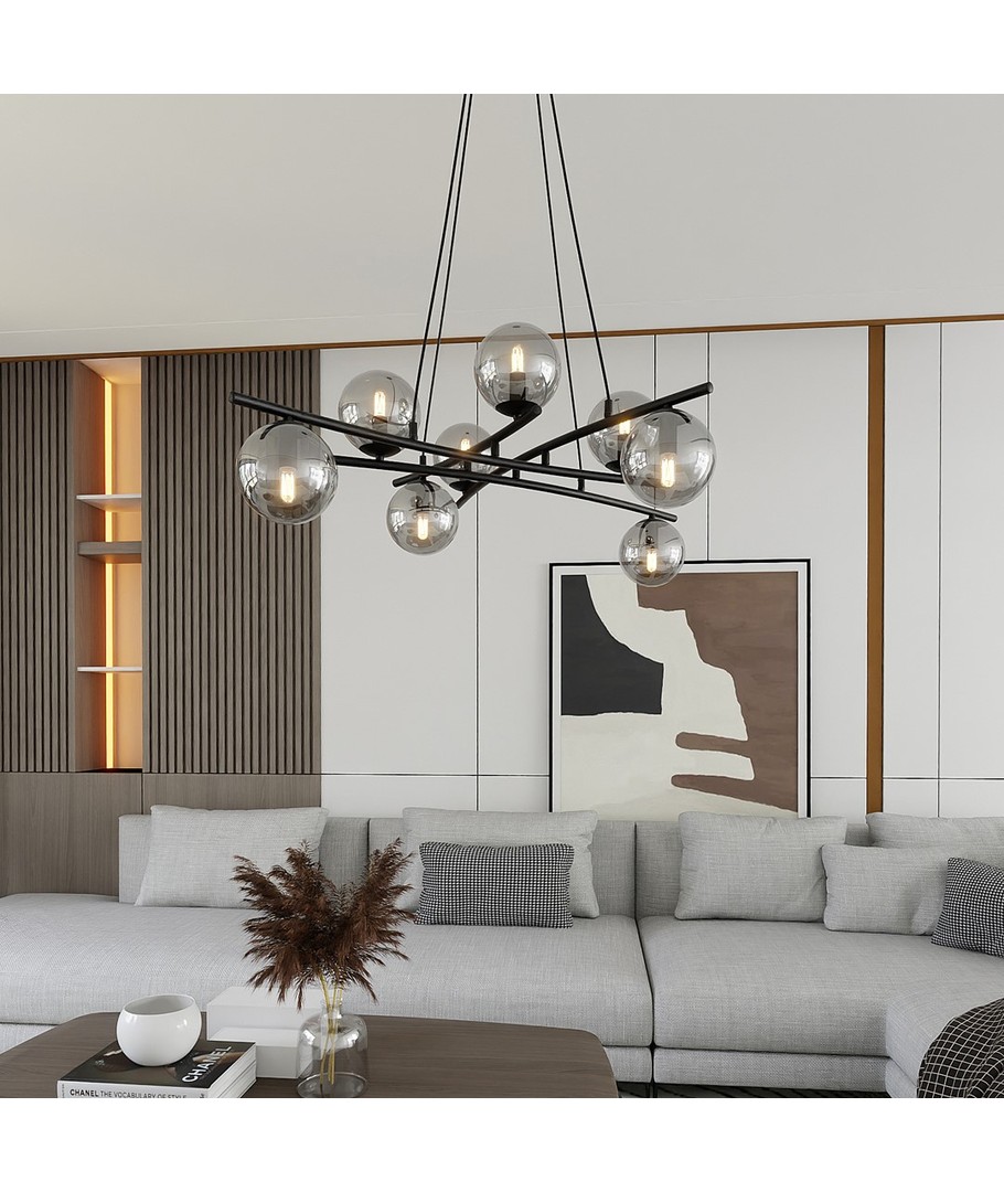 Essa 8 Grafitt pendellampe bringer eleganse og moderne design inn i ditt hjem. Med sin unike og iøynefallende form tilfører den en særpreget stil til stuen. Denne lampen er ikke bare en funksjonell lyskilde, som lyser opp store rom, men også en estetisk gjenstand som tilfører et snev av unik sjarm. De elegante glasskjermene får lampen til å fremstå lett og grasiøs, noe som gjør Essa til et ideelt valg for dem som ønsker stil og funksjonalitet kombinert.