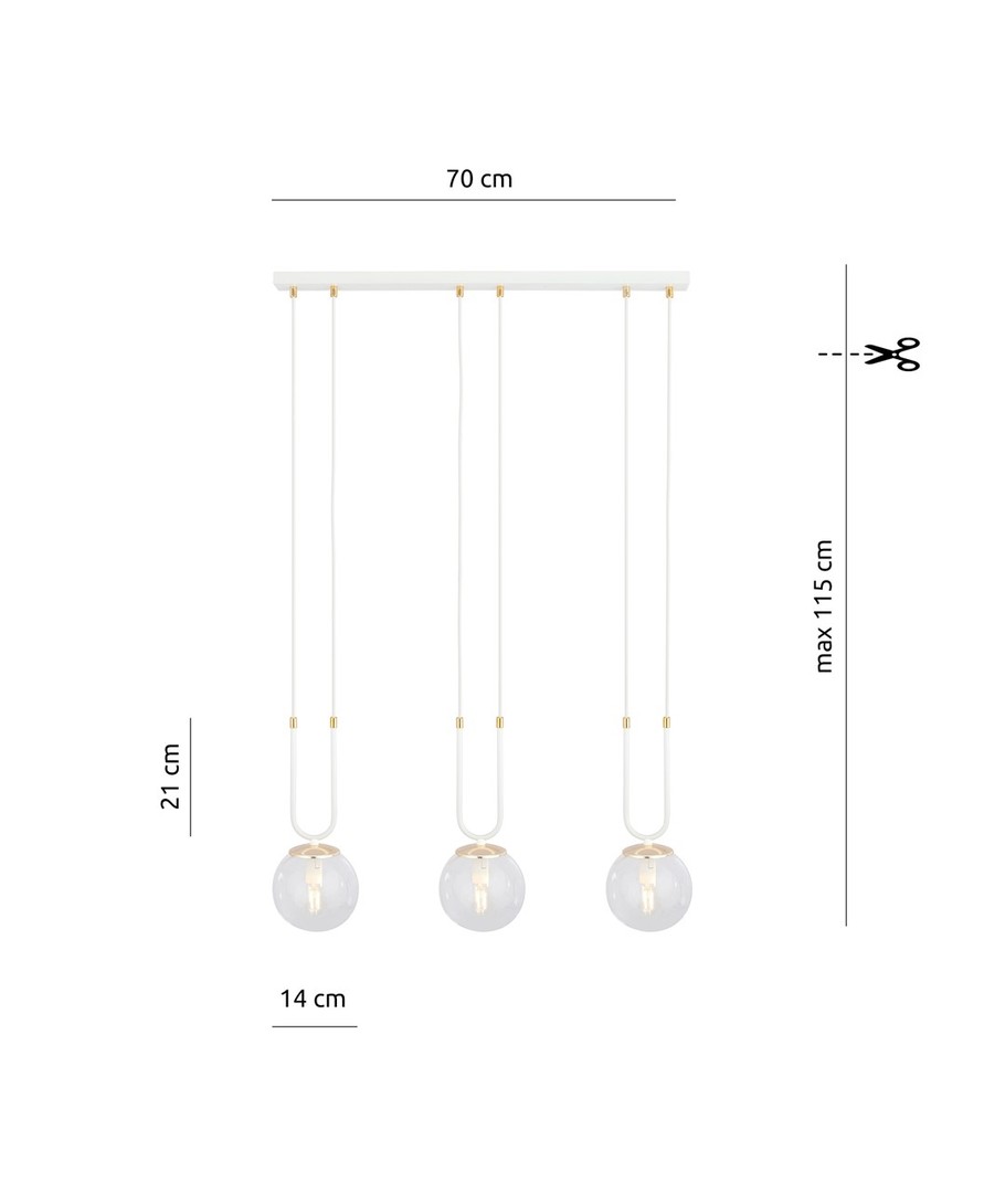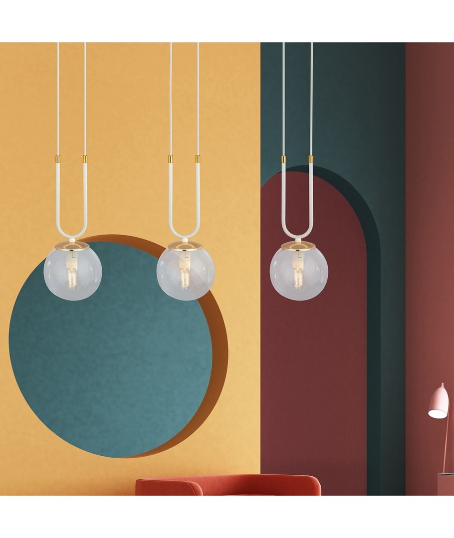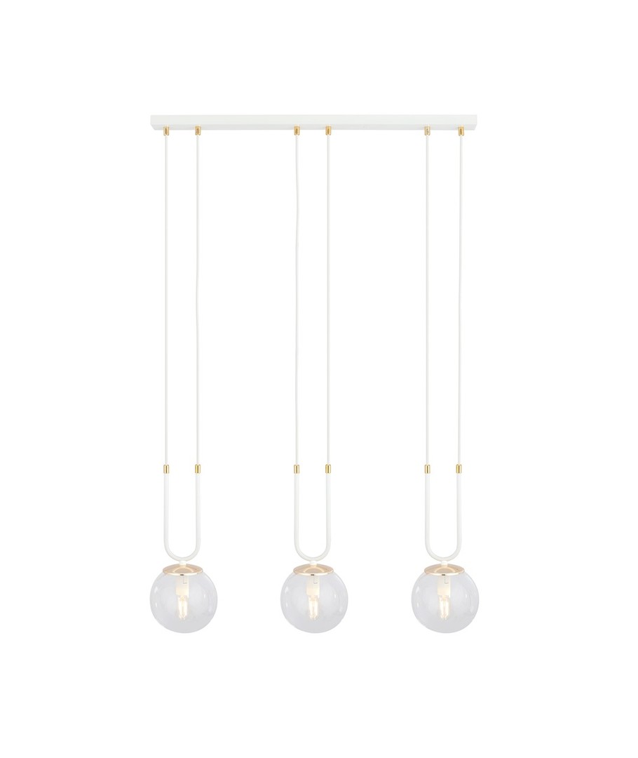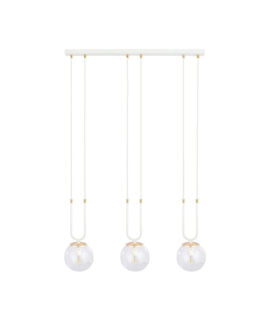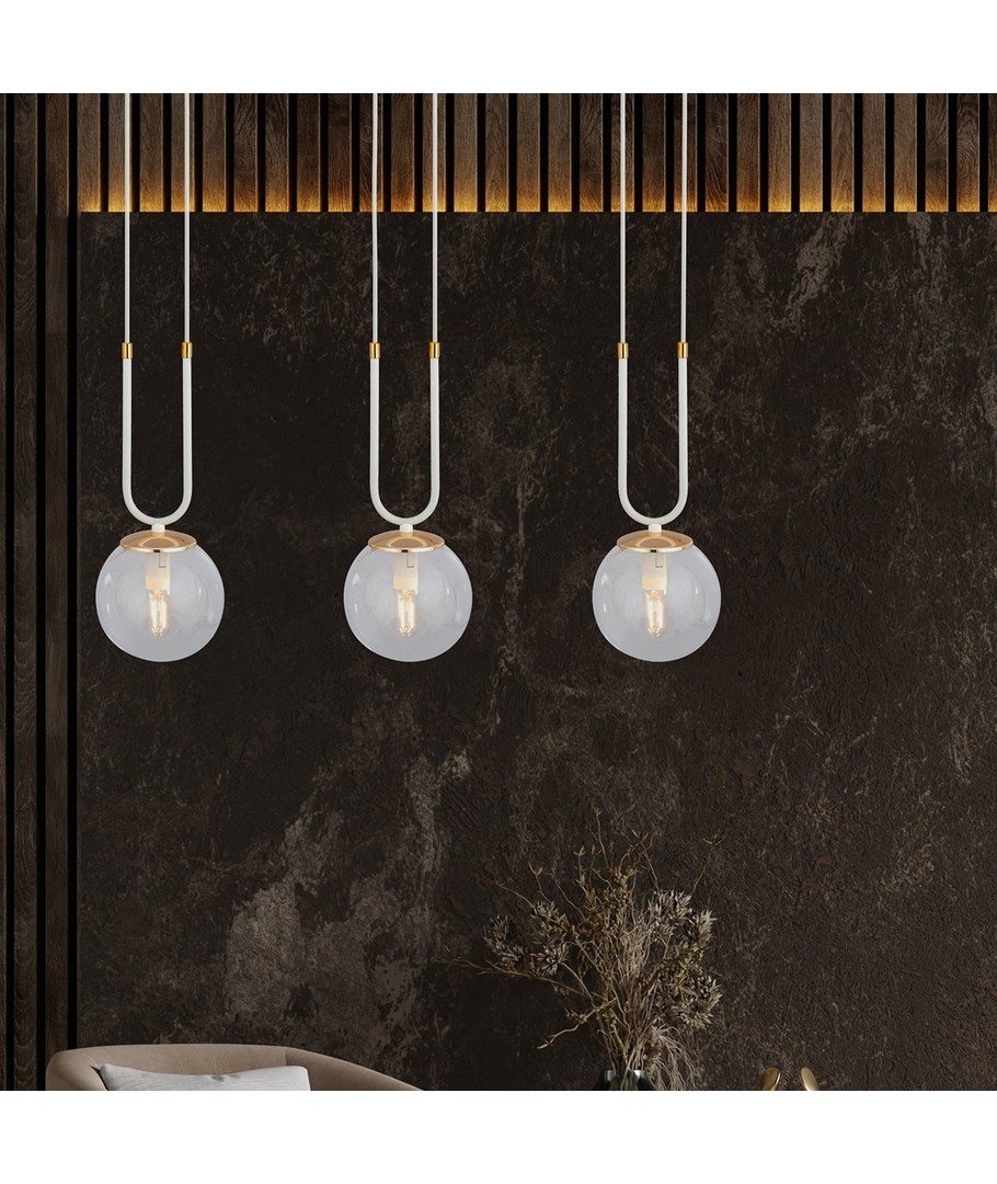 Opplev den sofistikerte elegansen med vår Glam 3 pendellampe i hvitt og transparent design. Denne moderne lampen fra GLAM-serien er inspirert av den glamorøse stilen og tilfører en enestående atmosfære til ditt hjem. De delikate glasskupplene i kombinasjon med gyldne detaljer skaper en følelse av luksus og skjønnhet. Lampens design er ideelt for dem som ønsker å tilføre deres interiør en stilfull og eksklusiv estetikk.