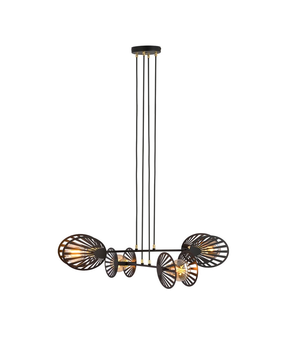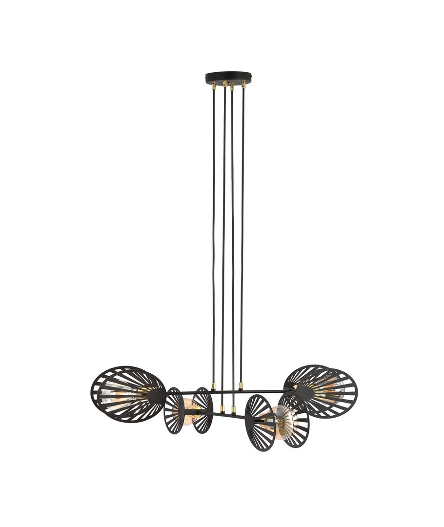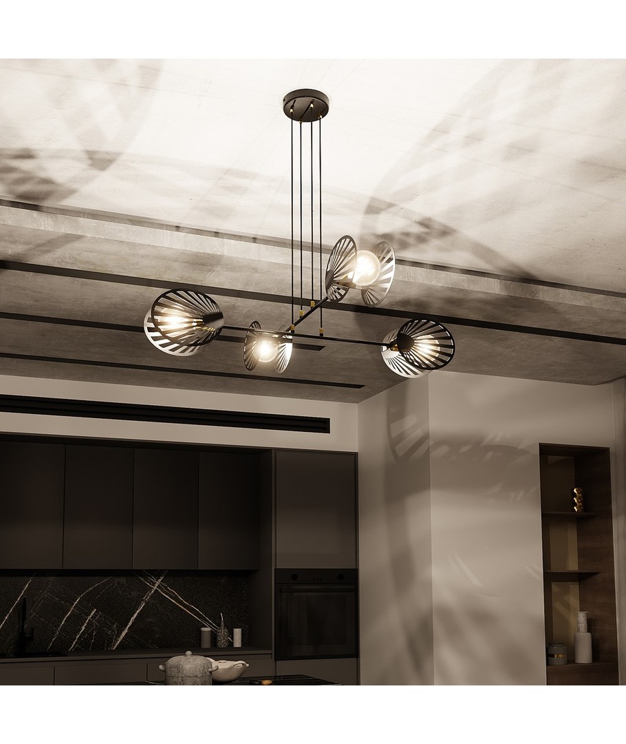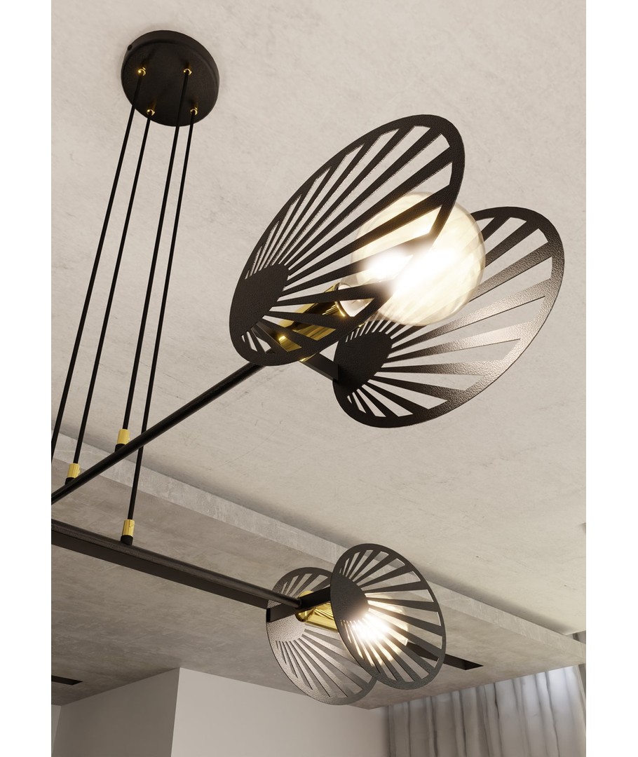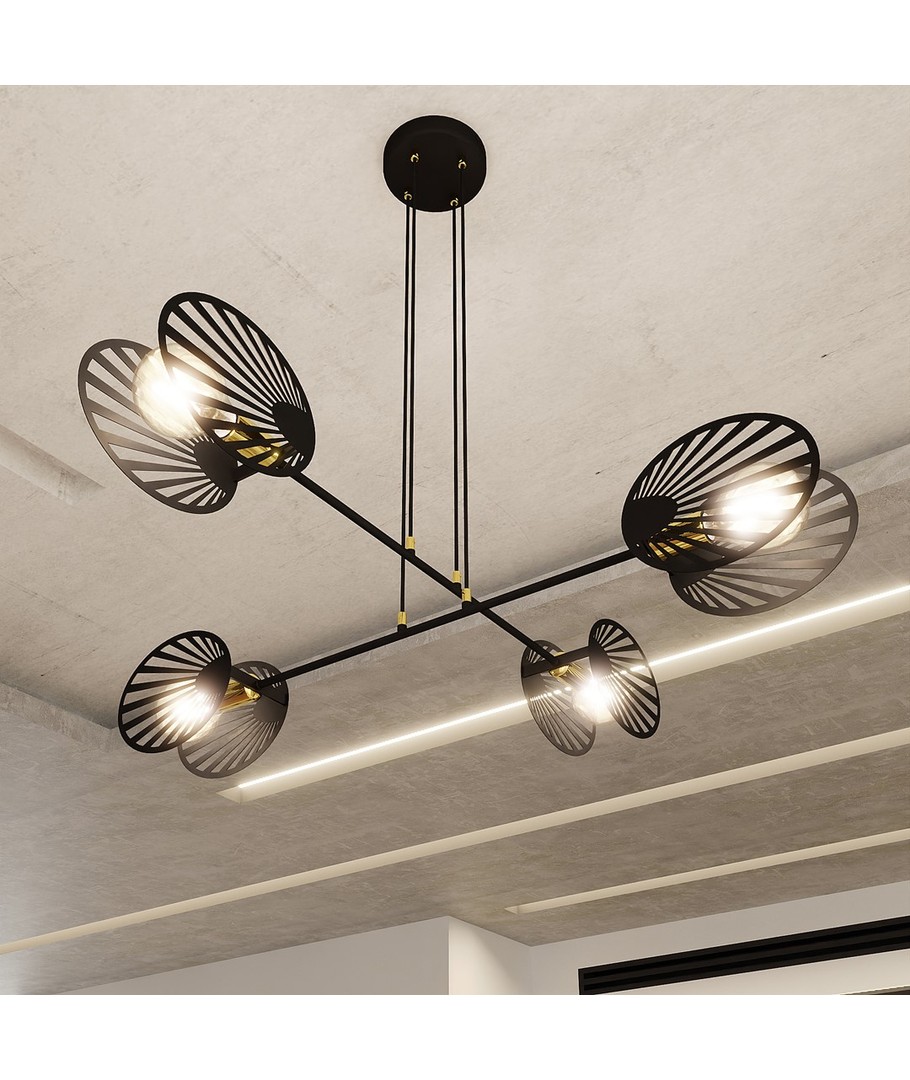 Opplev eleganse med Playa 4 Sort pendellampe, et imponerende stykke belysning som forvandler ethvert rom. Denne moderne lampe er designet med gulldetaljer og unike lampeskjermer formet som palmeblader, som tilfører et snev av luksus og stil. Playa-lampen er spesielt egnet for rom med høyt til taket, hvor den kan fungere som det sentrale blikkfanget og fremheve rommets dominerende stil.