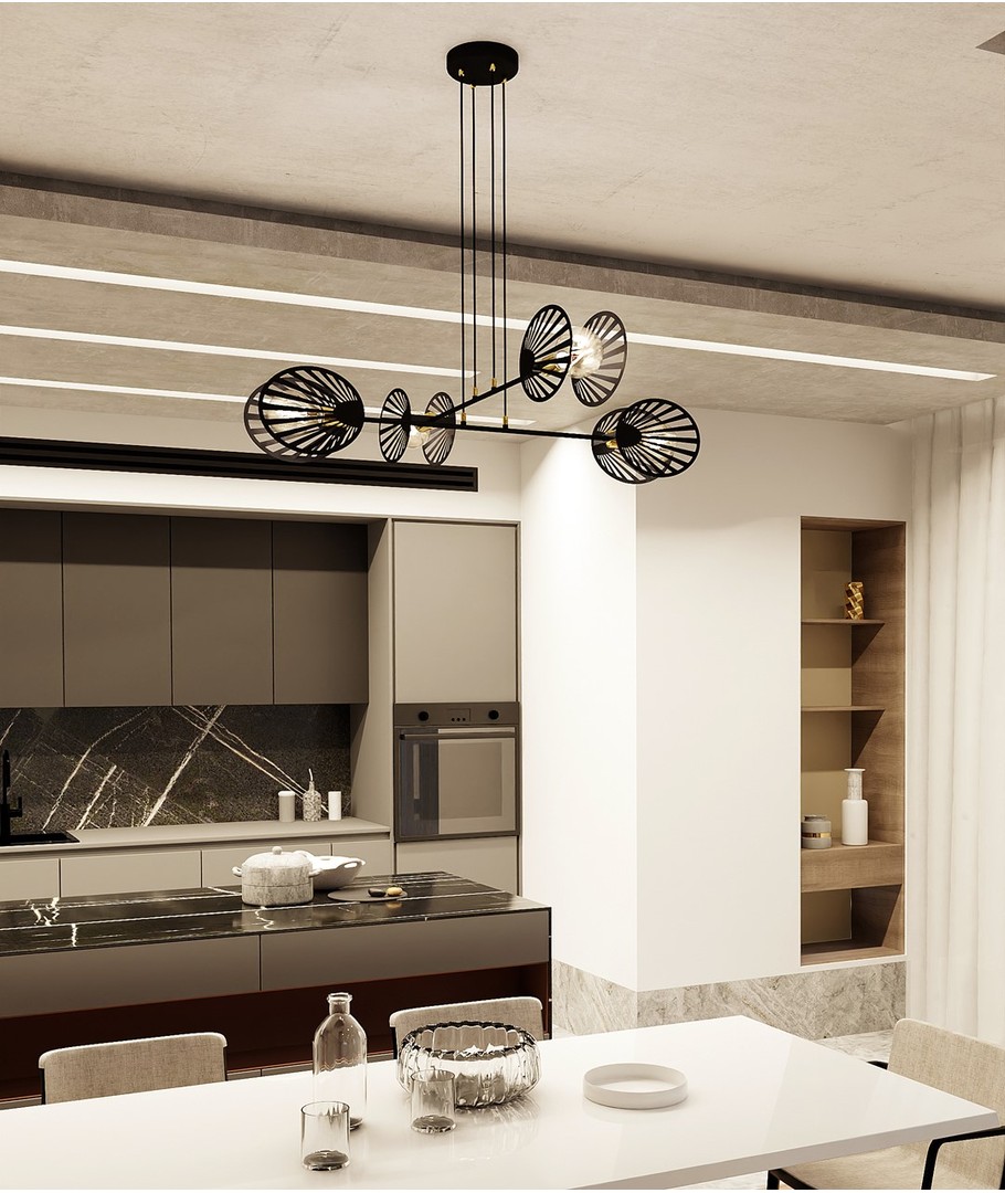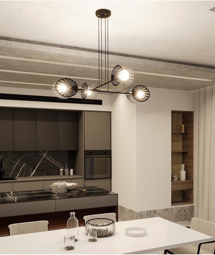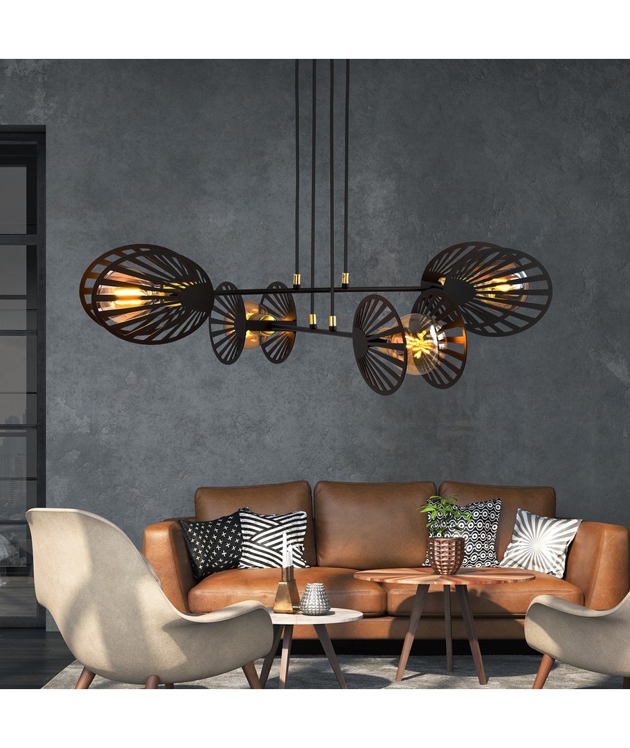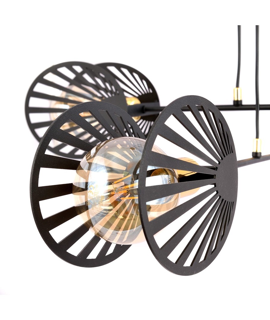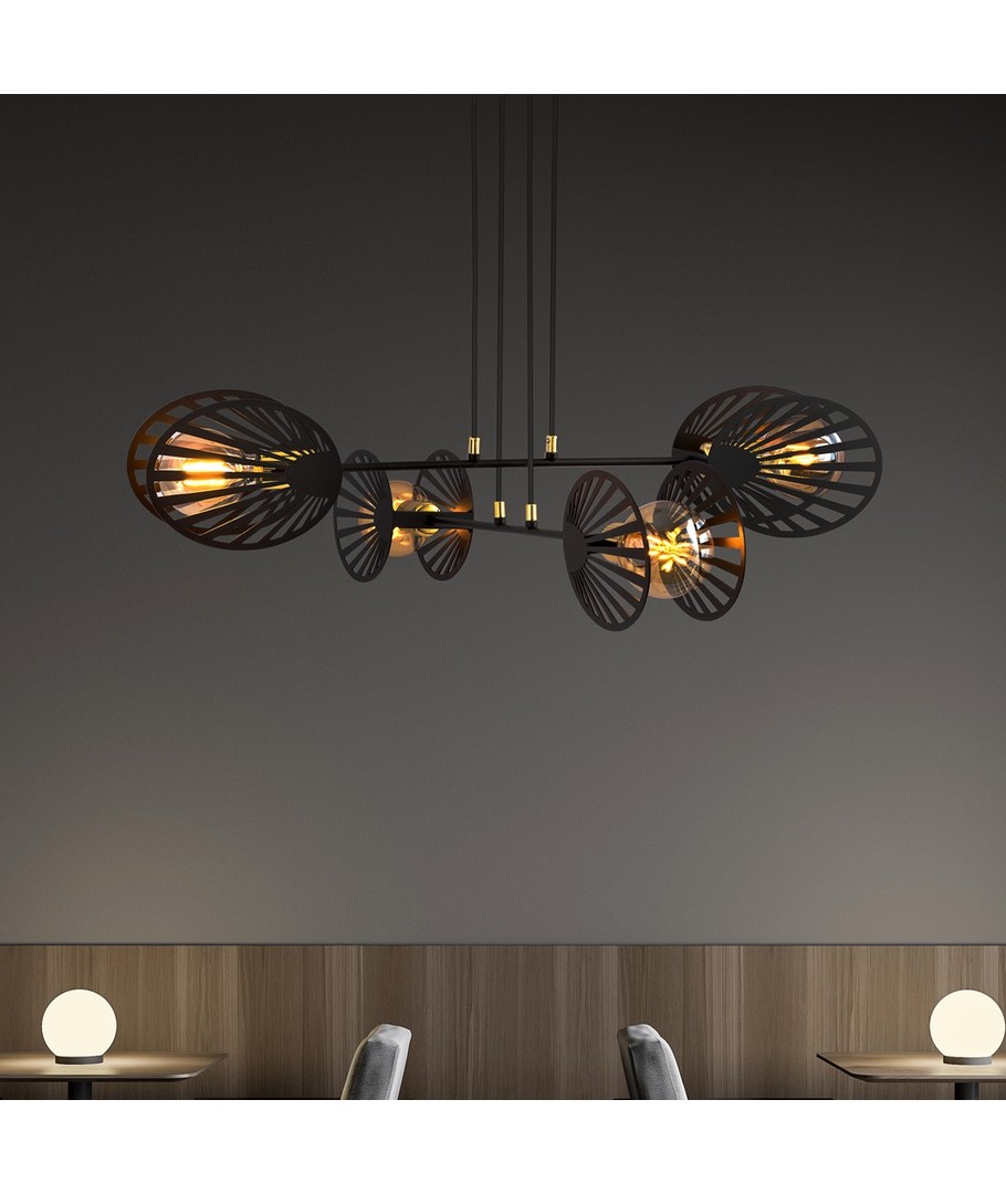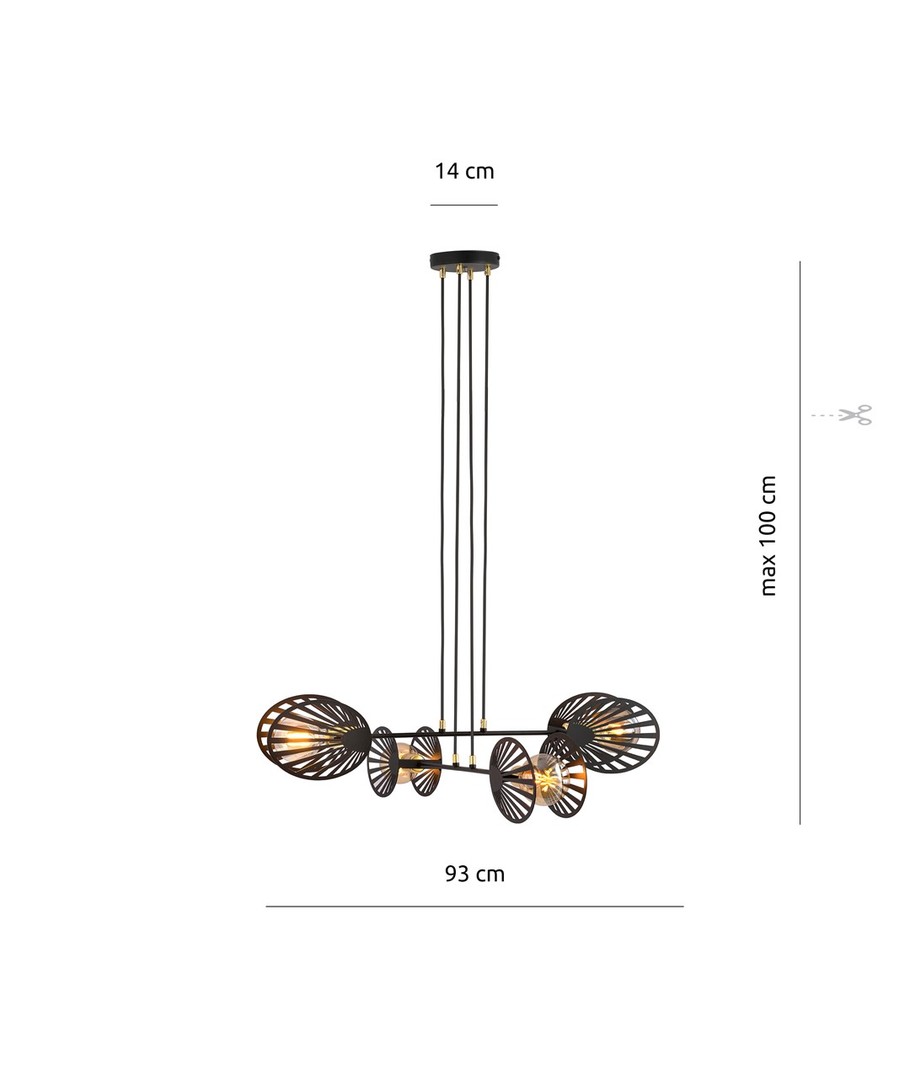 Opplev eleganse med Playa 4 Sort pendellampe, et imponerende stykke belysning som forvandler ethvert rom. Denne moderne lampe er designet med gulldetaljer og unike lampeskjermer formet som palmeblader, som tilfører et snev av luksus og stil. Playa-lampen er spesielt egnet for rom med høyt til taket, hvor den kan fungere som det sentrale blikkfanget og fremheve rommets dominerende stil.