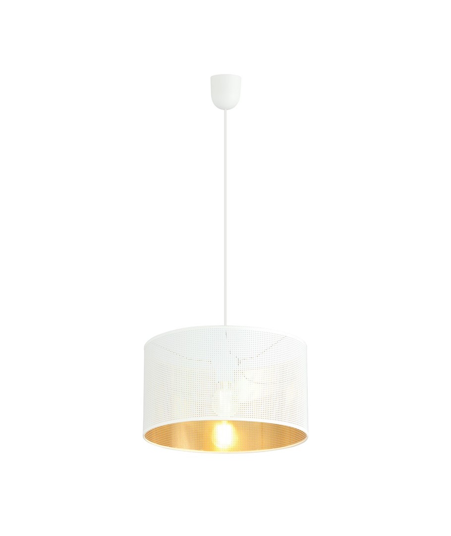 Aston 1 pendellampe i Hvit/Gull er den perfekte kombinasjon av klassisk eleganse og moderne design. Denne dekorative belysningsløsningen er skapt for å komplementere både tradisjonelle og moderne interiørstiler. Med sin enkle og minimalistiske estetikk tilfører Aston-lampen en stilfull dimensjon til ethvert rom, samtidig som den sikrer en myk og behagelig belysning. Lampen er fremstilt av pulverlakkert stål og har en stoffskjerm som gir en kvalitetsfinish. Den er ideell for stuen, soverommet eller spisestuen, og med sin justerbare høyde kan du tilpasse den til dine spesifikke behov.