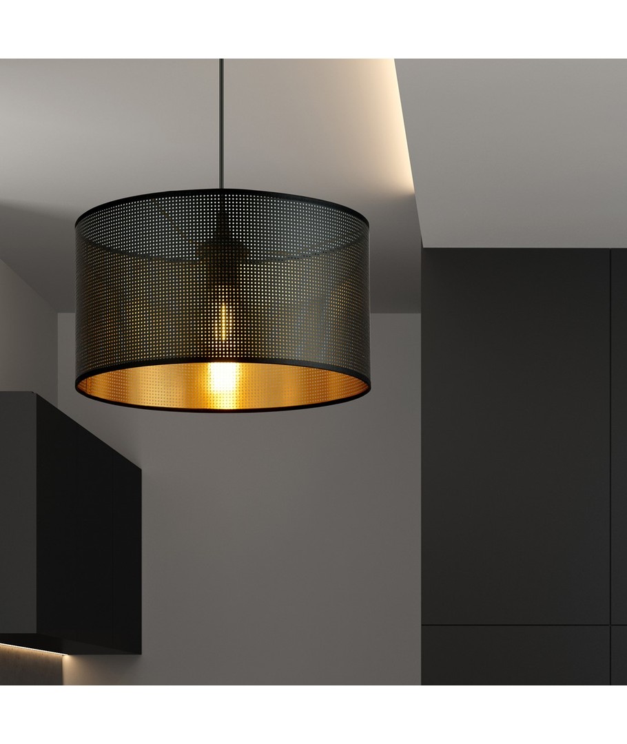 Gi rommet ditt et stilig preg med denne elegante pendellampen. Designet er både moderne og tidløst, noe som gjør den til et perfekt valg for ethvert interiør. Med en sort og gull finish vil denne lampen garantert fange oppmerksomheten og bli et blikkfang i rommet ditt.