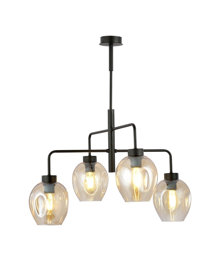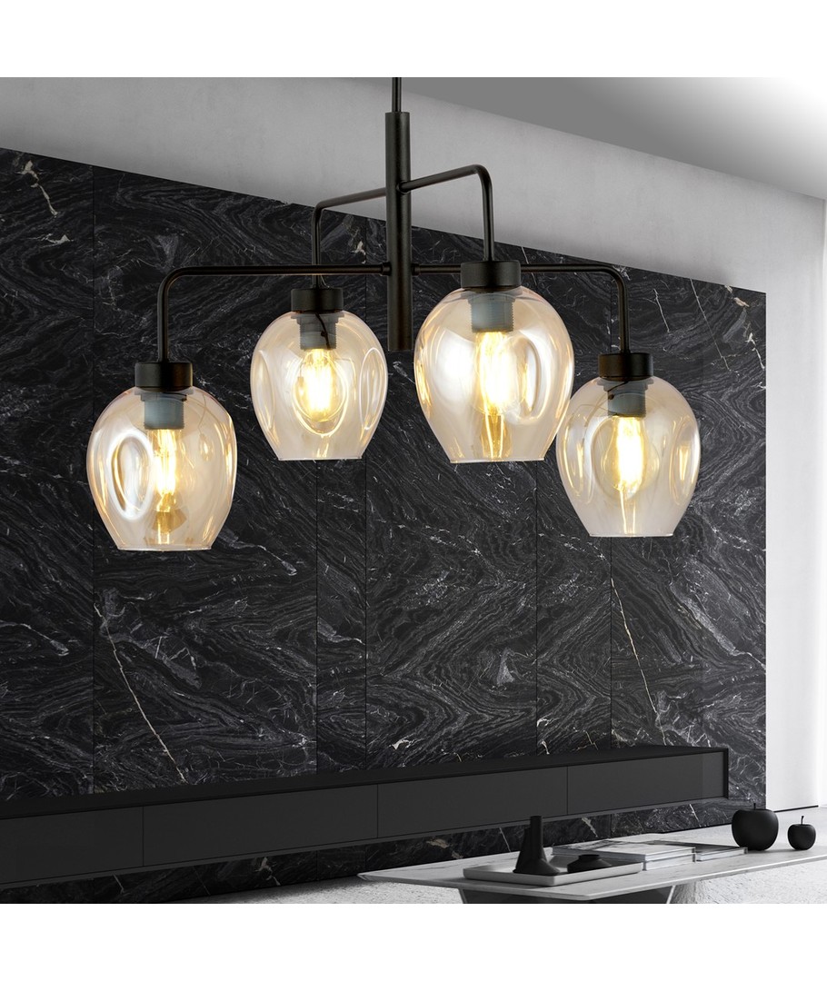 Lukka 4 Sort/Rav pendellampe er et vakkert eksempel på moderne design, som ubesværet fusjonerer eleganse med funksjonalitet. Med sin minimalistiske stil passer lampen perfekt inn i både moderne og tradisjonelle interiører. De elegante glasskjermene i rav tilfører en spesiell letthet og raffinement til lampens uttrykk. Lukka-serien er kjent for sin evne til å belyse større områder effektivt, samtidig som den smelter harmonisk inn i hjemmets varierte innredninger. Det originale designet tiltrekker seg oppmerksomhet og fremstår som svært stilrent.