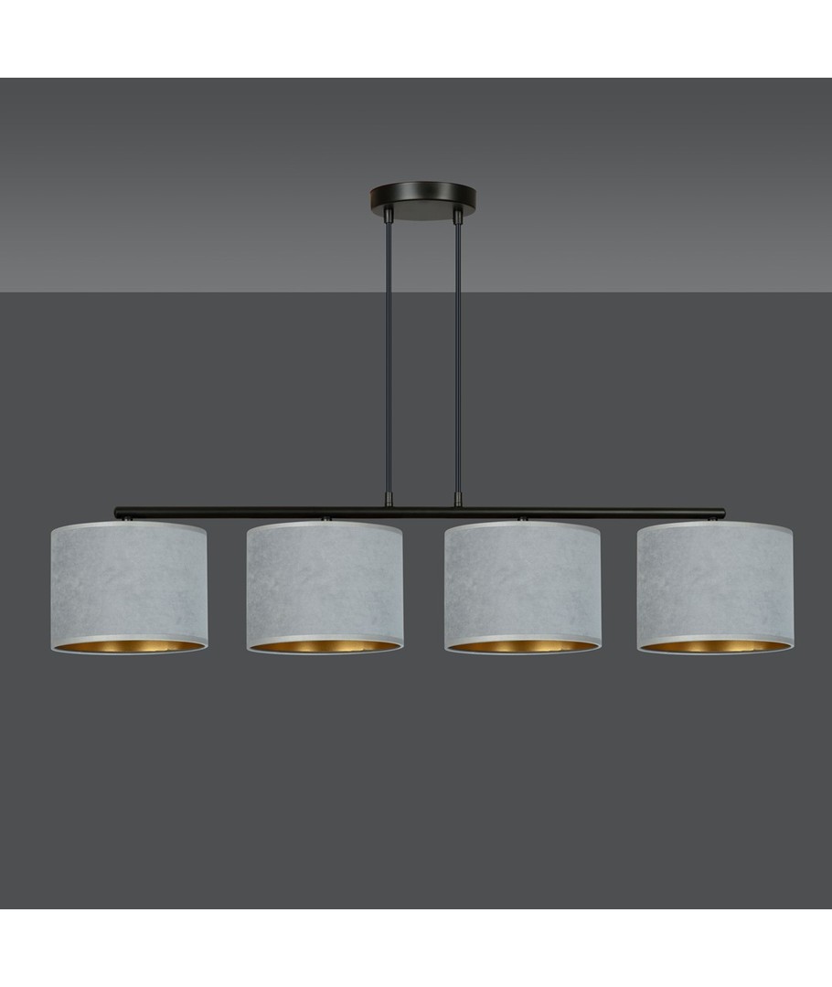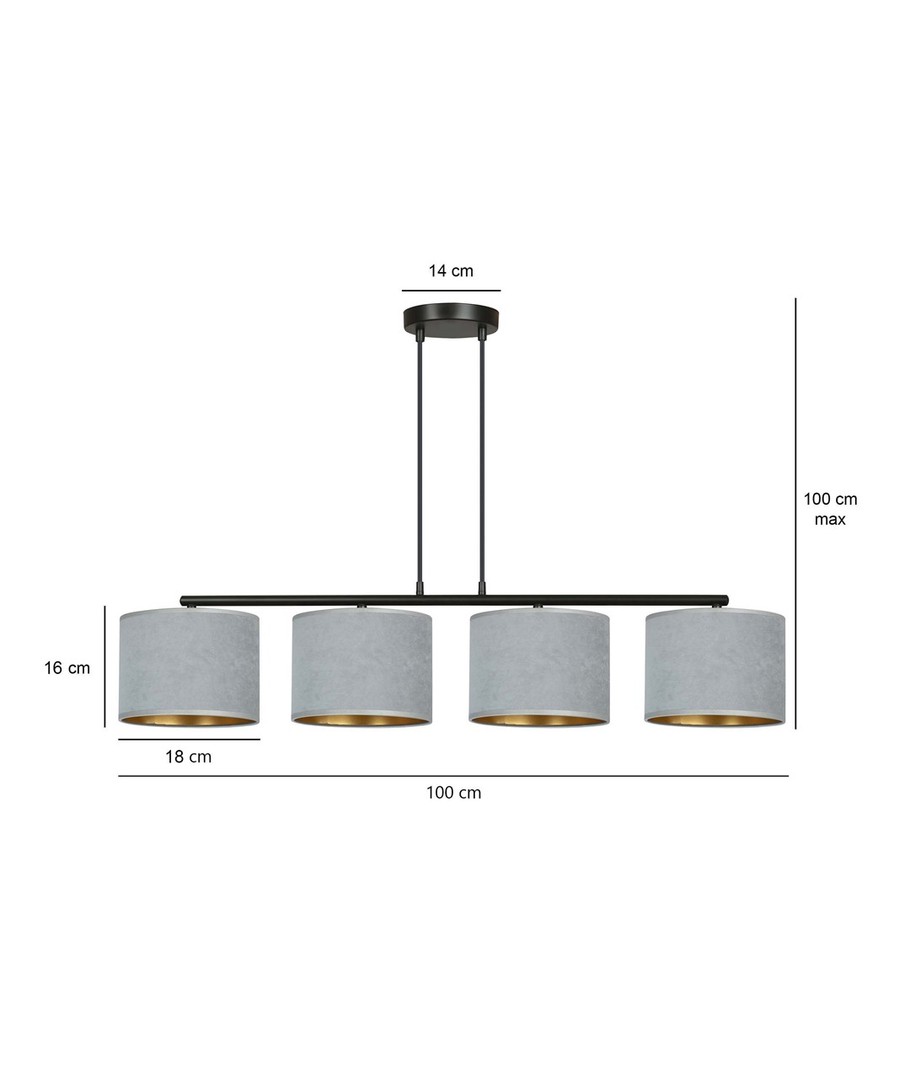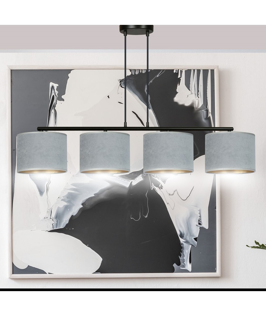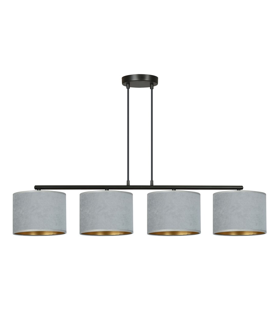 Hilde 4 Svart/Grå pendellampe kombinerer moderne eleganse med funksjonell fleksibilitet. Denne lampen er perfekt for både moderne og klassiske interiører og tilbyr en justerbar høyde som kan tilpasses individuelle behov. De fire stoffskjermene har en luksuriøs, fløyelsaktig overflate og en gyllen innside som gir et varmt og innbydende lys. Det enkle og elegante designet i svart og grå farge gjør lampen ideell for forskjellige rom i hjemmet. Med sine holdbare materialer er Hilde-lampen en stilig og praktisk belysningsløsning.
