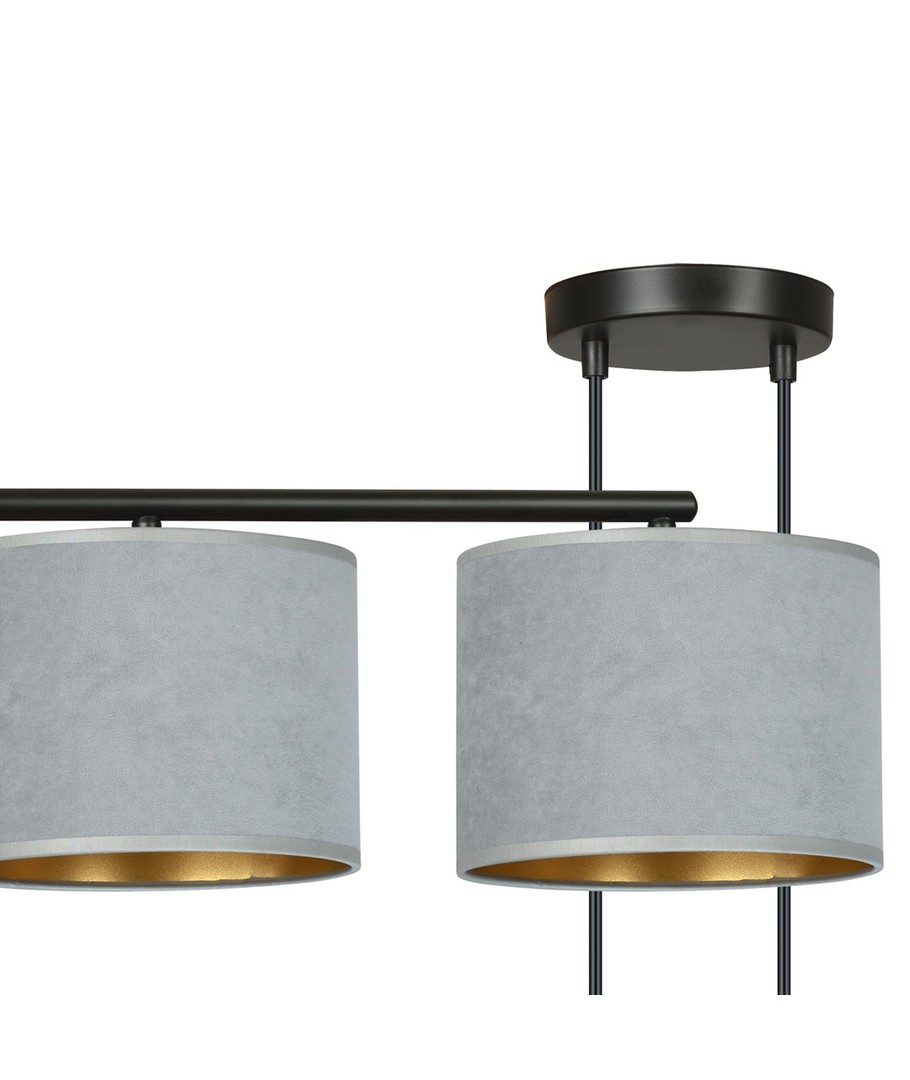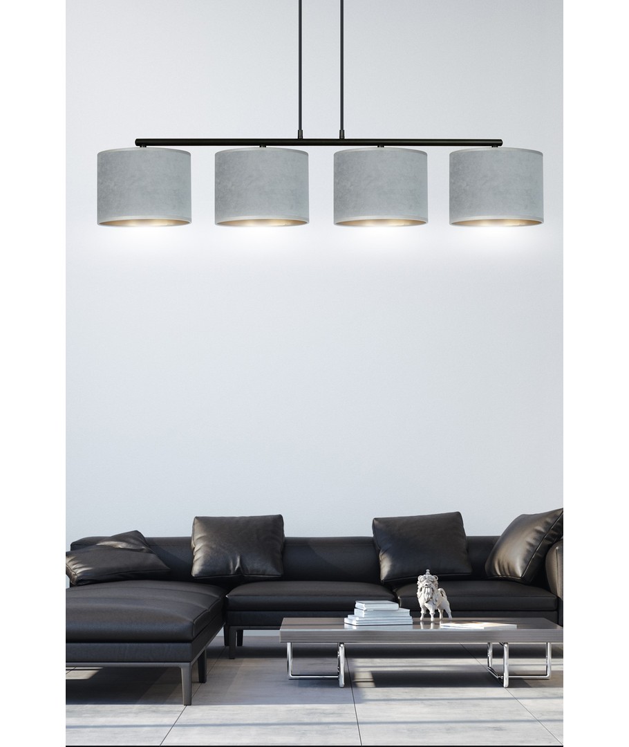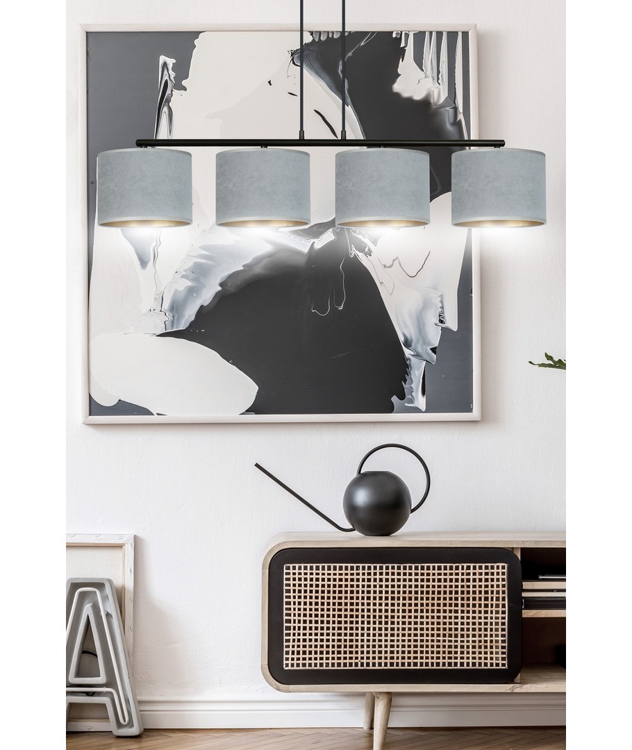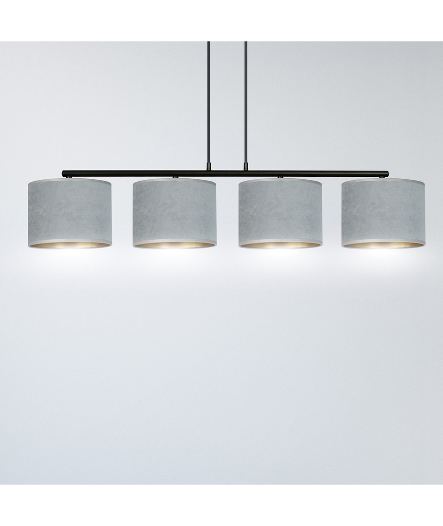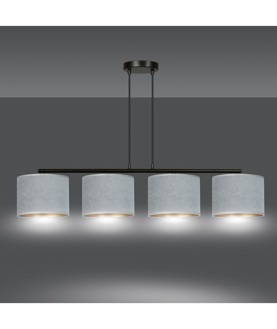 Hilde 4 Svart/Grå pendellampe kombinerer moderne eleganse med funksjonell fleksibilitet. Denne lampen er perfekt for både moderne og klassiske interiører og tilbyr en justerbar høyde som kan tilpasses individuelle behov. De fire stoffskjermene har en luksuriøs, fløyelsaktig overflate og en gyllen innside som gir et varmt og innbydende lys. Det enkle og elegante designet i svart og grå farge gjør lampen ideell for forskjellige rom i hjemmet. Med sine holdbare materialer er Hilde-lampen en stilig og praktisk belysningsløsning.