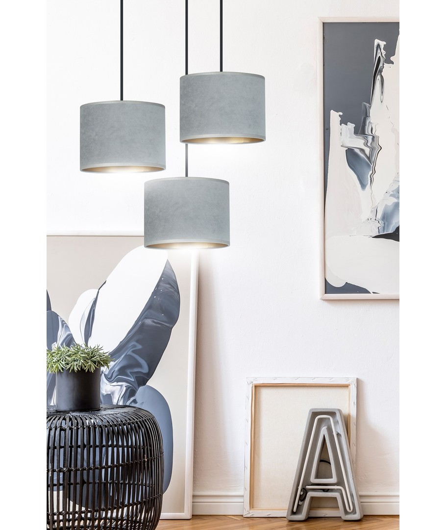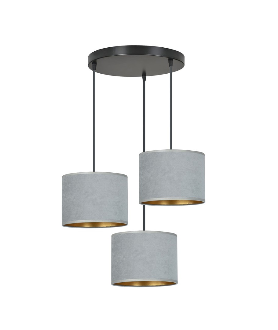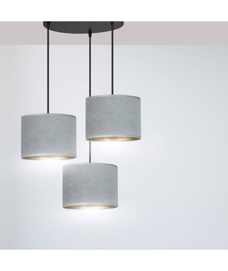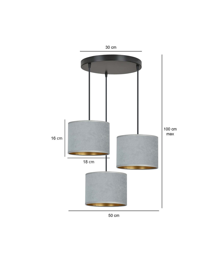 Hilde 3 Sort Premium Grå pendellampe er en elegant og tidløs belysningsløsning, som passer perfekt til både moderne og klassiske interiører. De justerbare ledningene gjør det mulig å tilpasse lampen til individuelle behov, noe som sikrer optimal plassering og lysfordeling i rommet. Lampeskjermene er laget i slitesterkt materiale med en myk fløyelslignende overflate og en gyllen innvendig finish, som sprer en varm glød. Kombinasjonen av det enkle designet og de elegante fargene skaper en allsidig lampe som passer perfekt inn i forskjellige miljøer.
