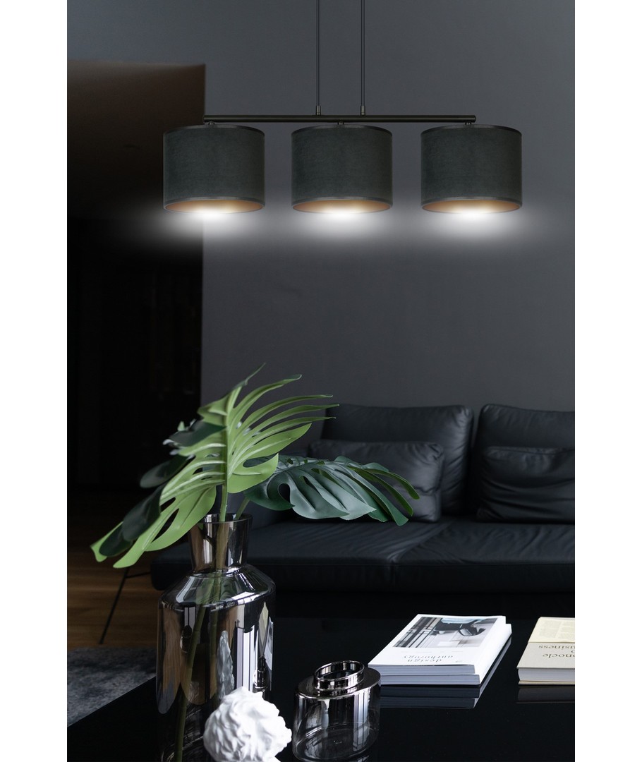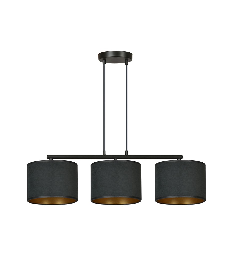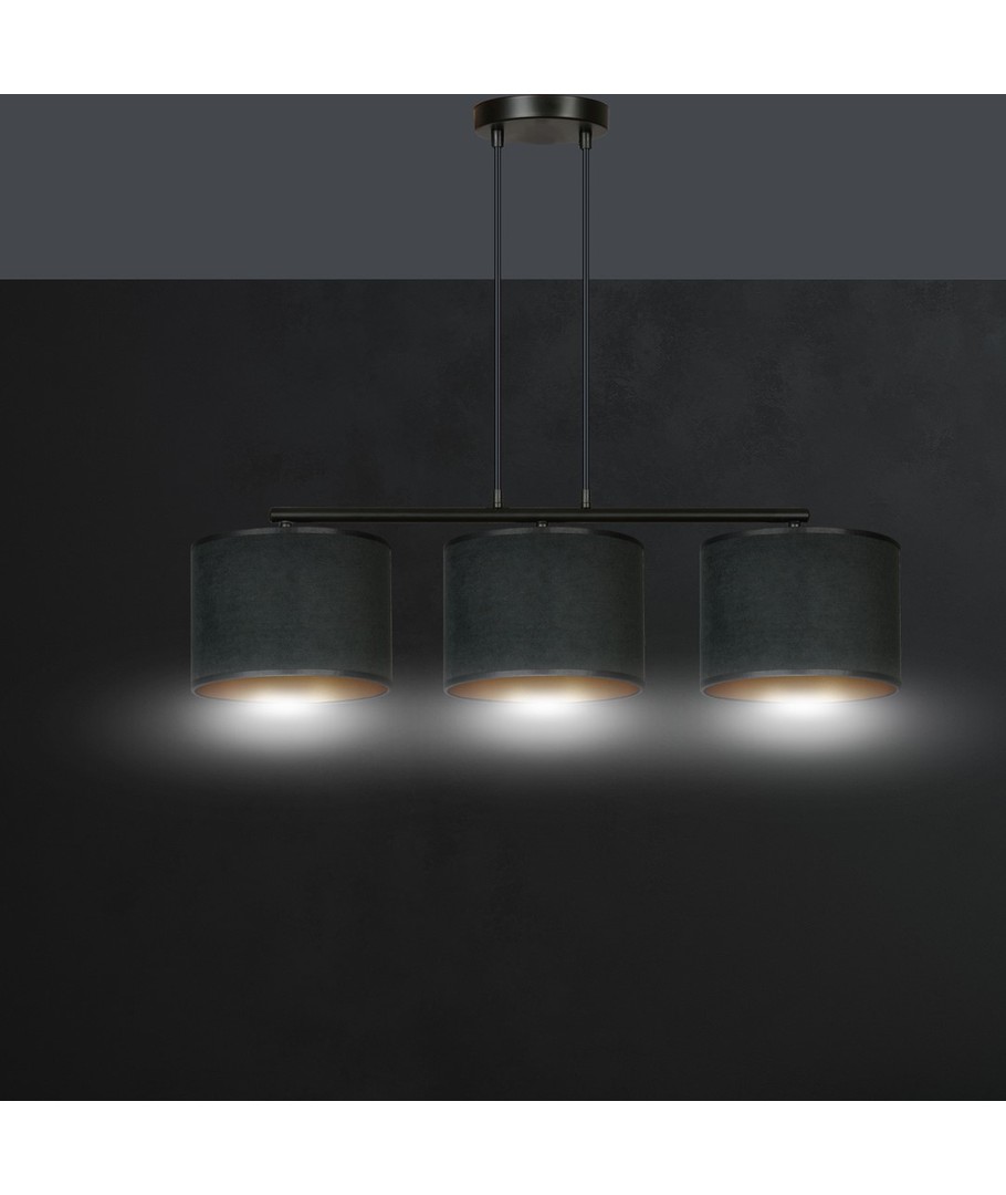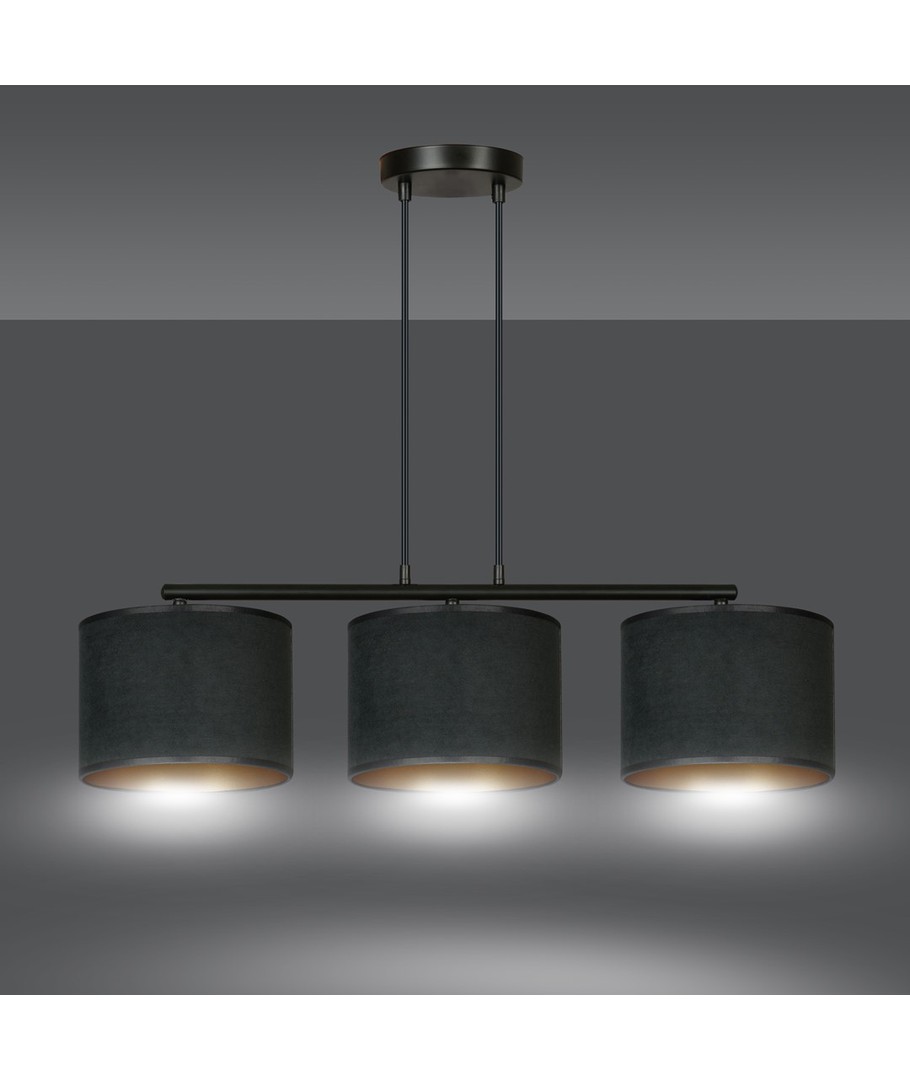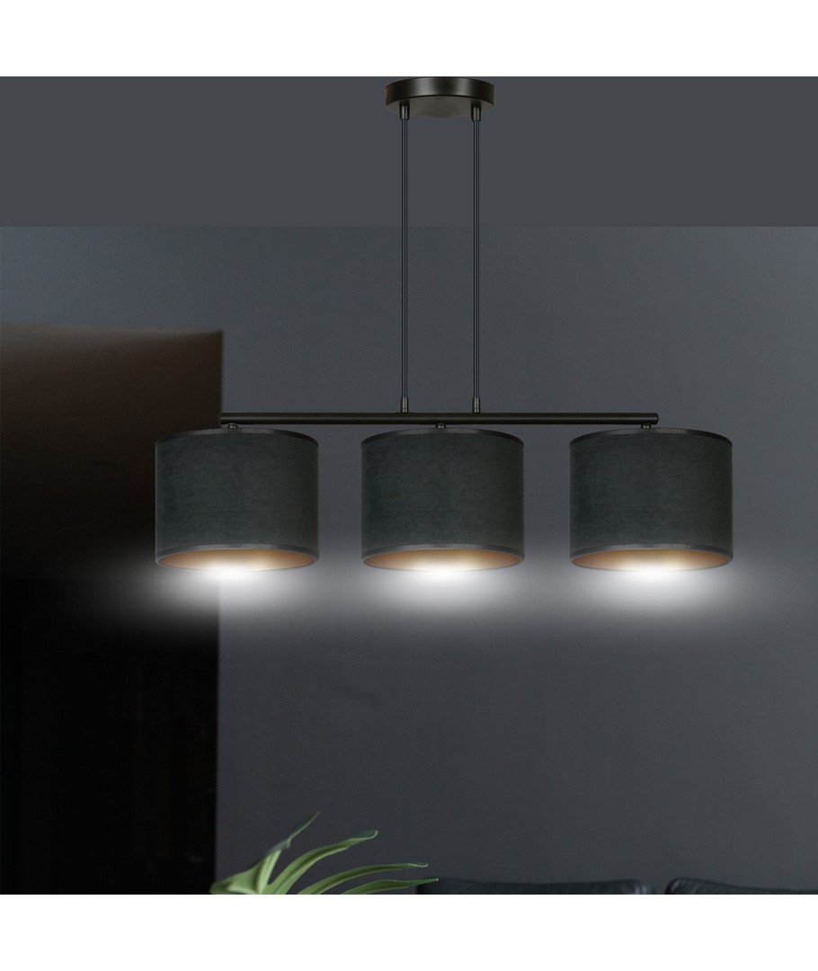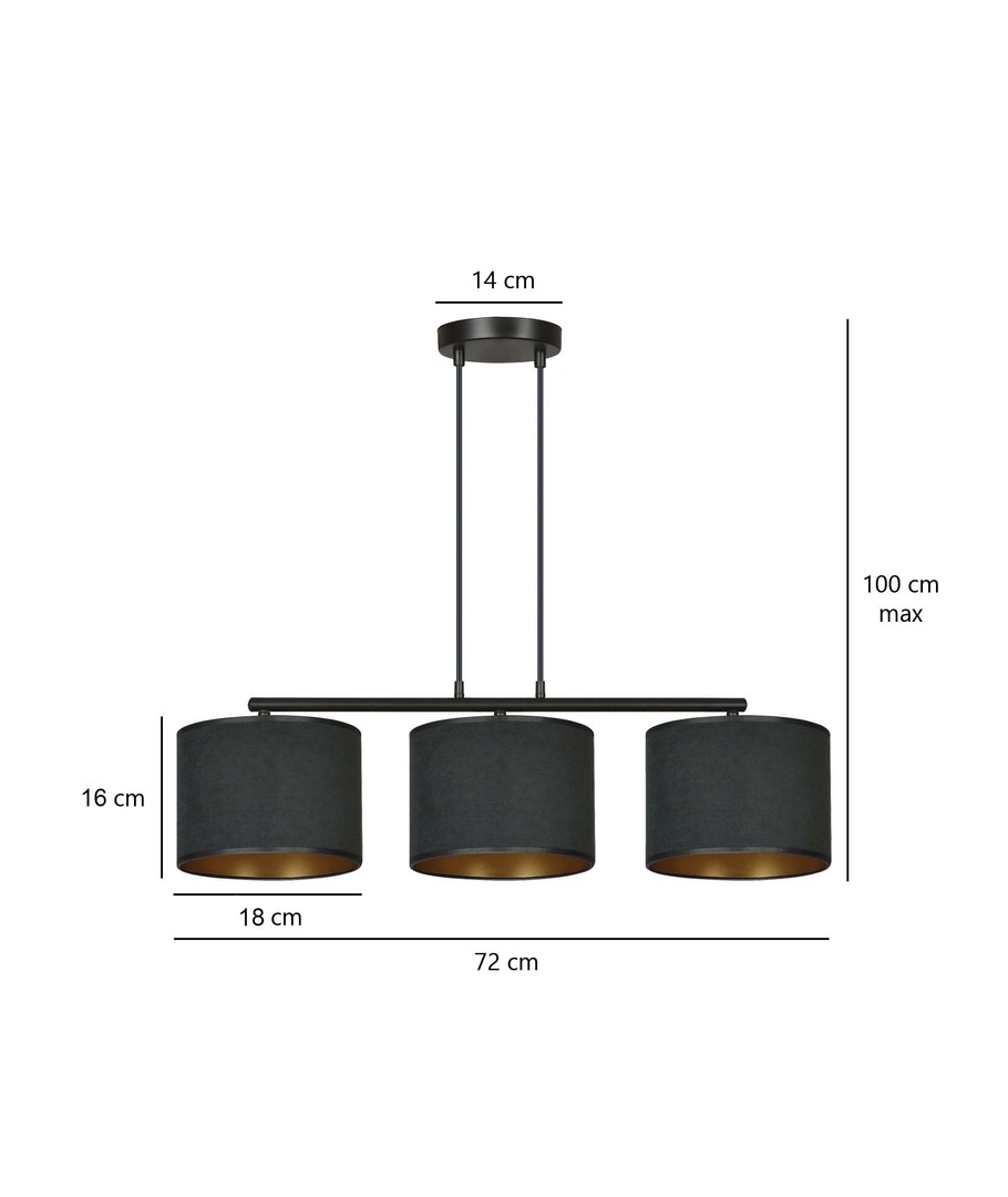 Hilde 3 Sort pendellampe er den perfekte kombinasjon av moderne design og klassisk eleganse. Denne allsidige lampen passer perfekt inn i både moderne og klassiske interiører. Med sine justerbare ledninger kan du tilpasse høyden, slik at den passer til dine individuelle behov. Lampeskjermene er fremstilt av holdbart materiale og presenterer en fløyelsmyk overflate med en gyllen innside, som gir en varm og innbydende belysning. Den enkle konstruksjonen og elegante fargeskjema gjør lampen til et opplagt valg for ethvert rom.