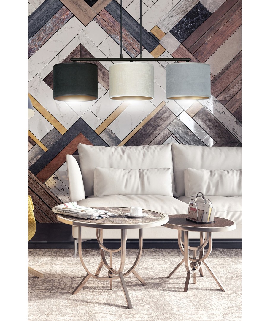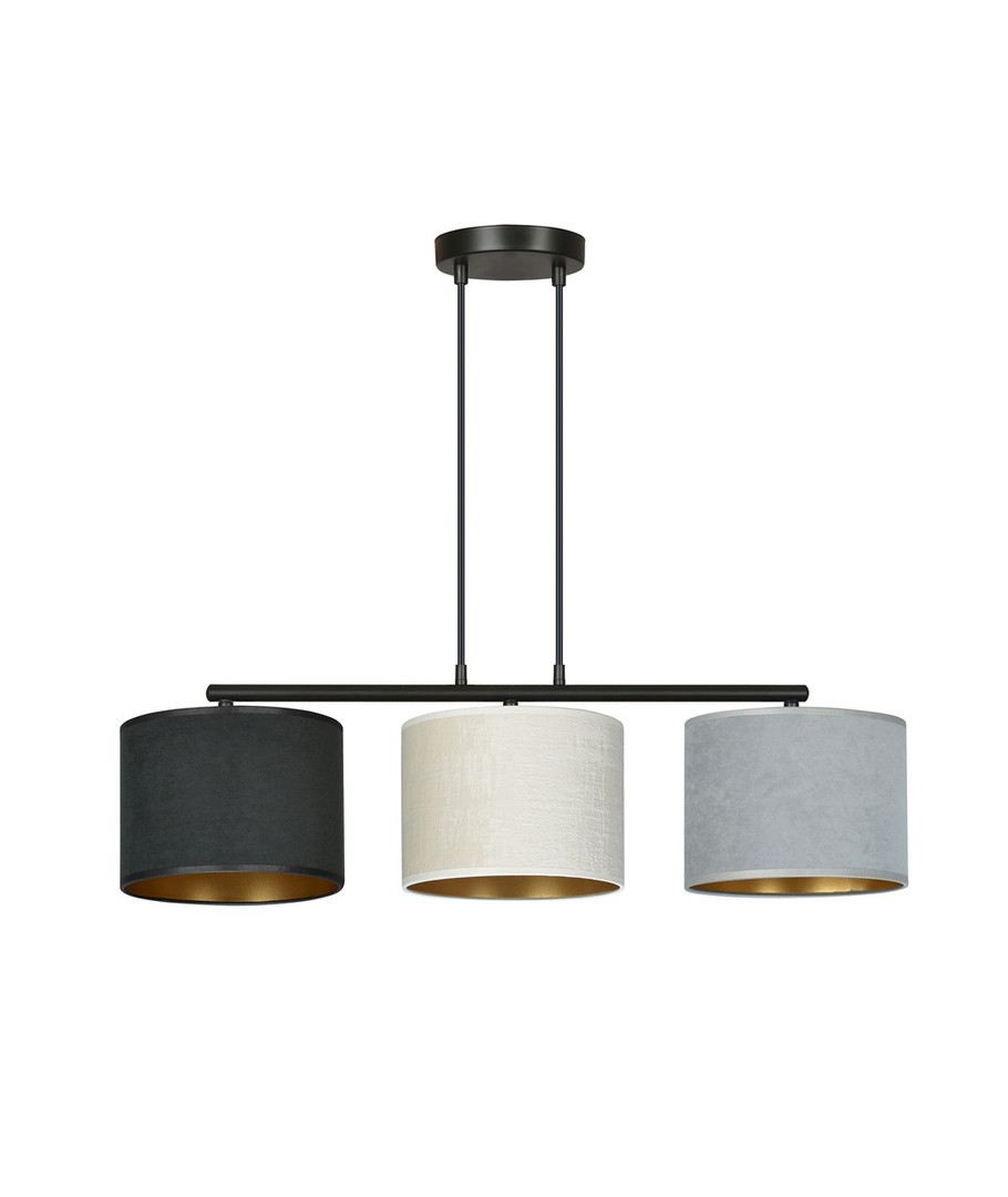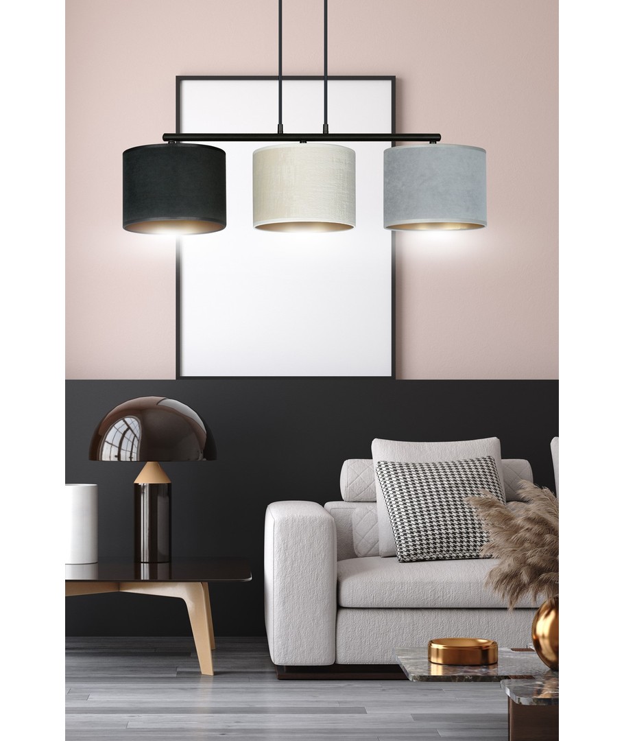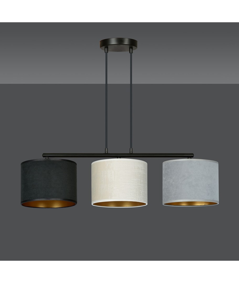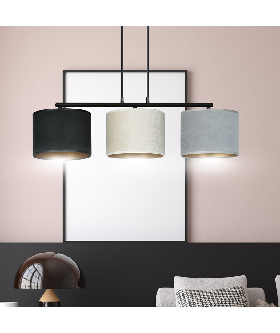 Opplev eleganse og funksjonalitet med Hilde 3 Sort Mix pendellampe. Denne lampen er perfekt for både moderne og klassiske interiører, med sitt justerbare ledningslengde-design, som gjør det enkelt å tilpasse lampen til dine spesifikke behov. De tre stoffskjermene har en fløyelsaktig tekstur og en gull innside, som tilfører en luksuriøs touch til ethvert rom. Med enkel konstruksjon og et raffinert fargevalg er Hilde-lampen et allsidig valg som tilfører stil og atmosfære til ditt hjem.