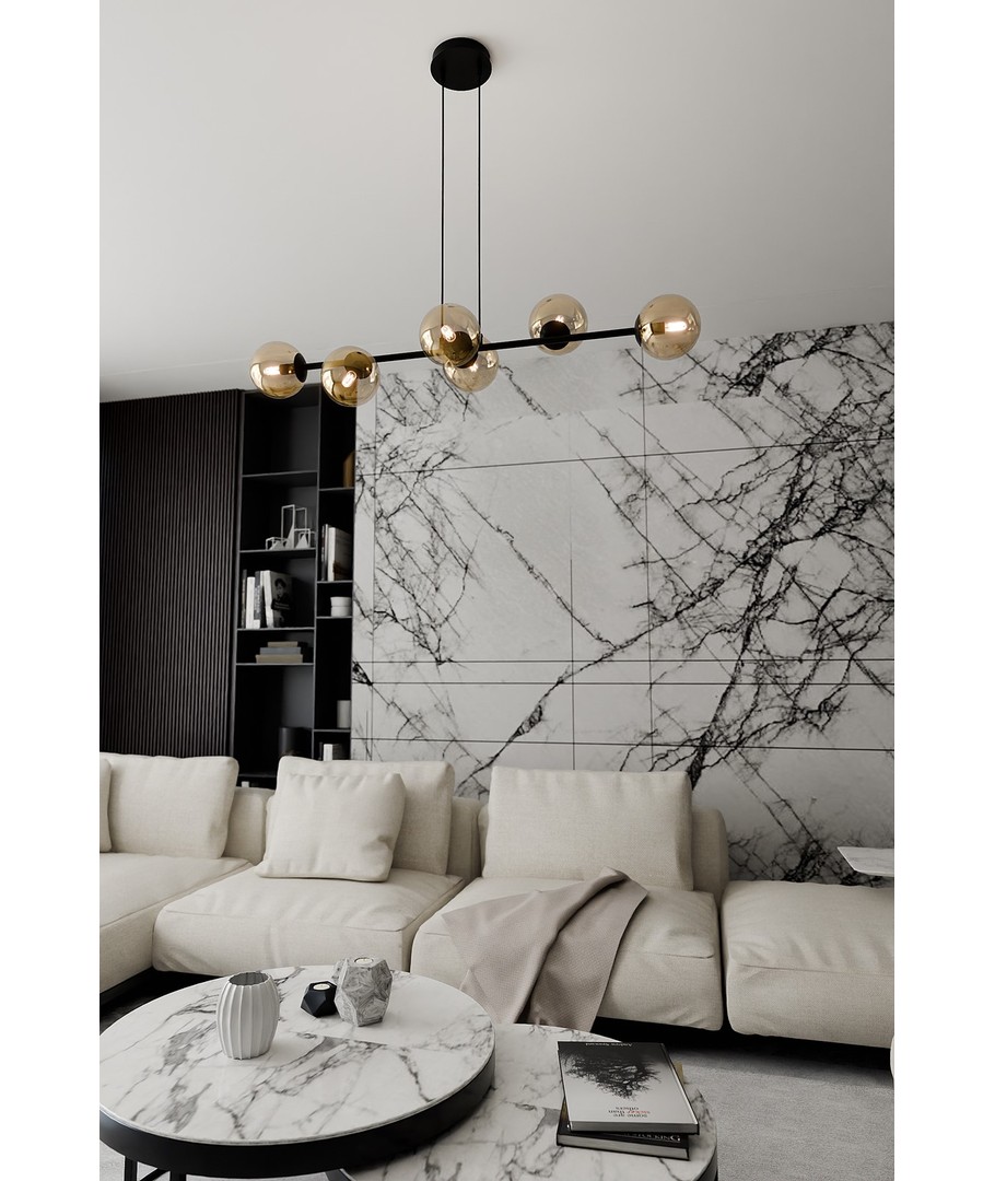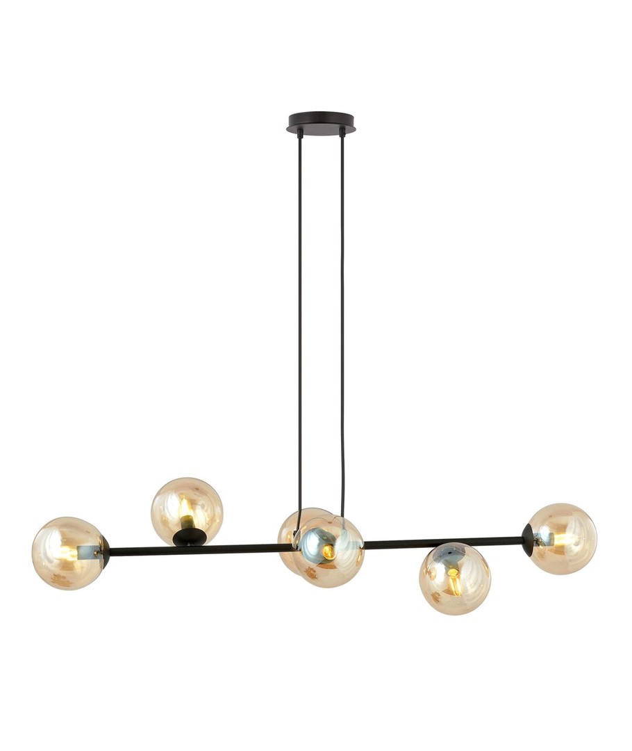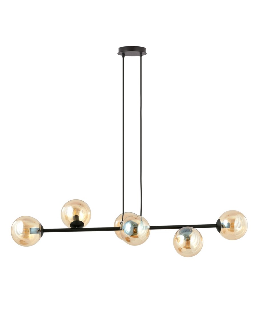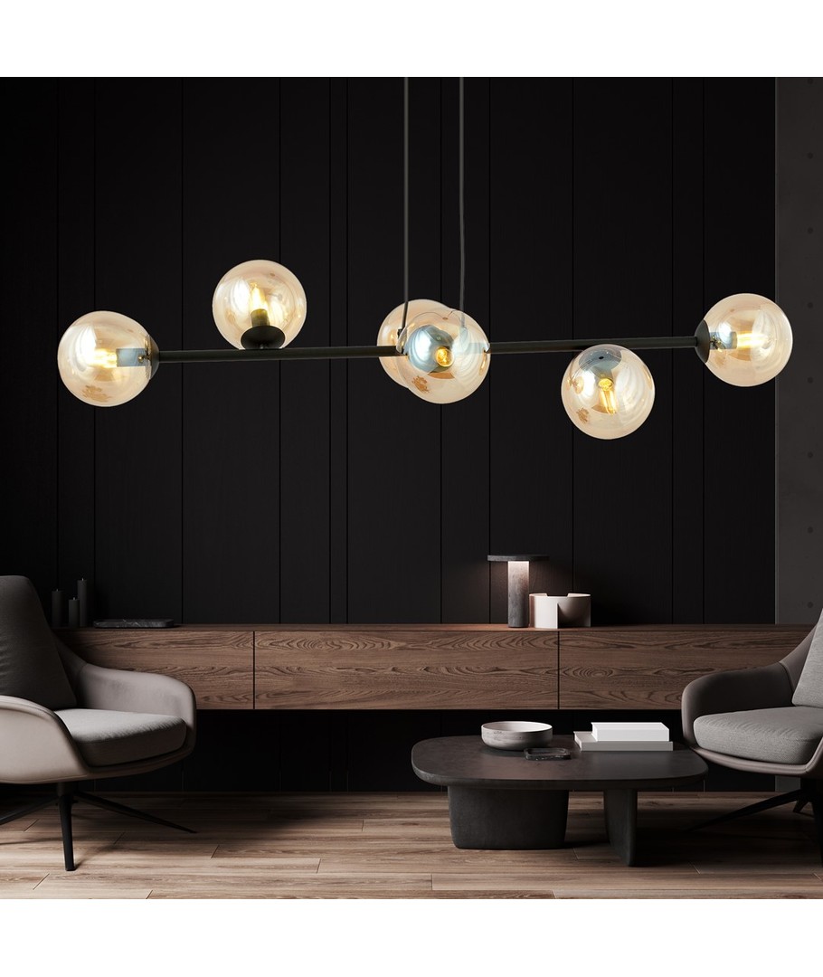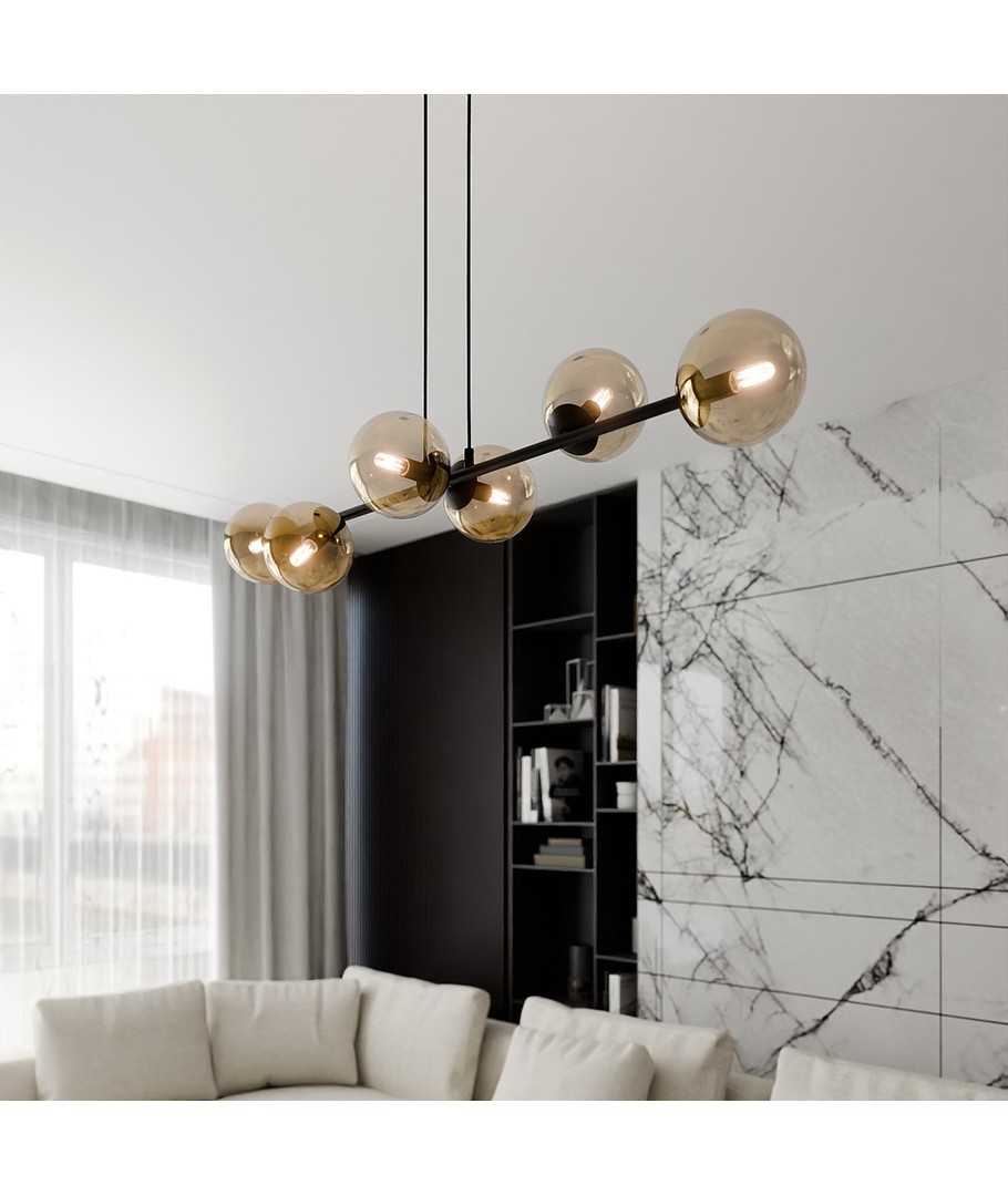 Rossi 6 pendellampen er designet for å være både funksjonell og estetisk tiltalende. Dens justerbare høyde gjør det enkelt å finne den perfekte plasseringen over spisebordet eller i stuen. Med sin elegante kombinasjon av svart stål og ravfarget glass gir den et raffinert og moderne uttrykk som passer inn i ethvert interiør.