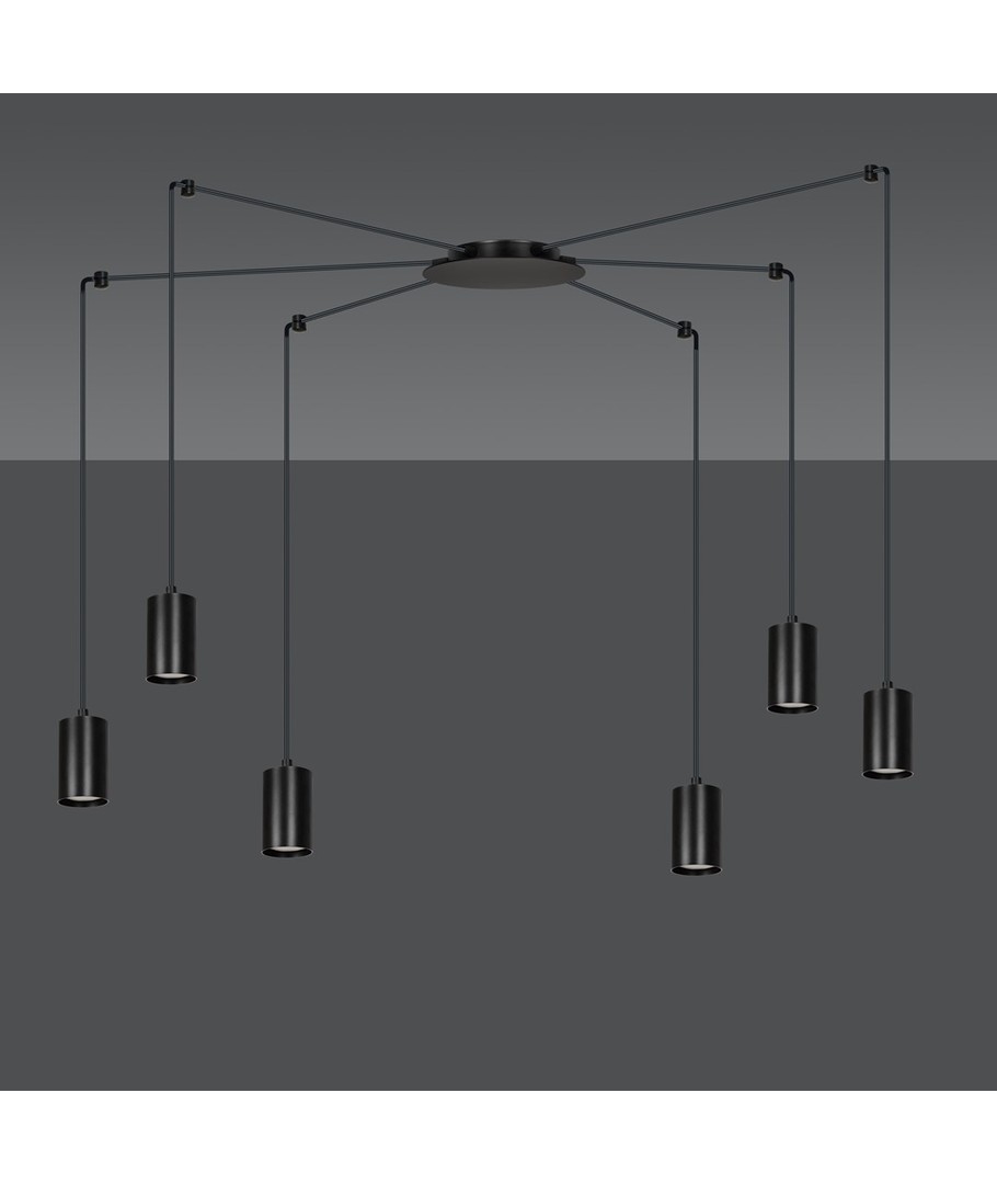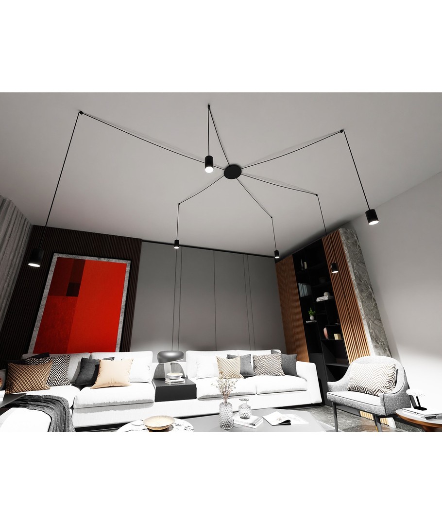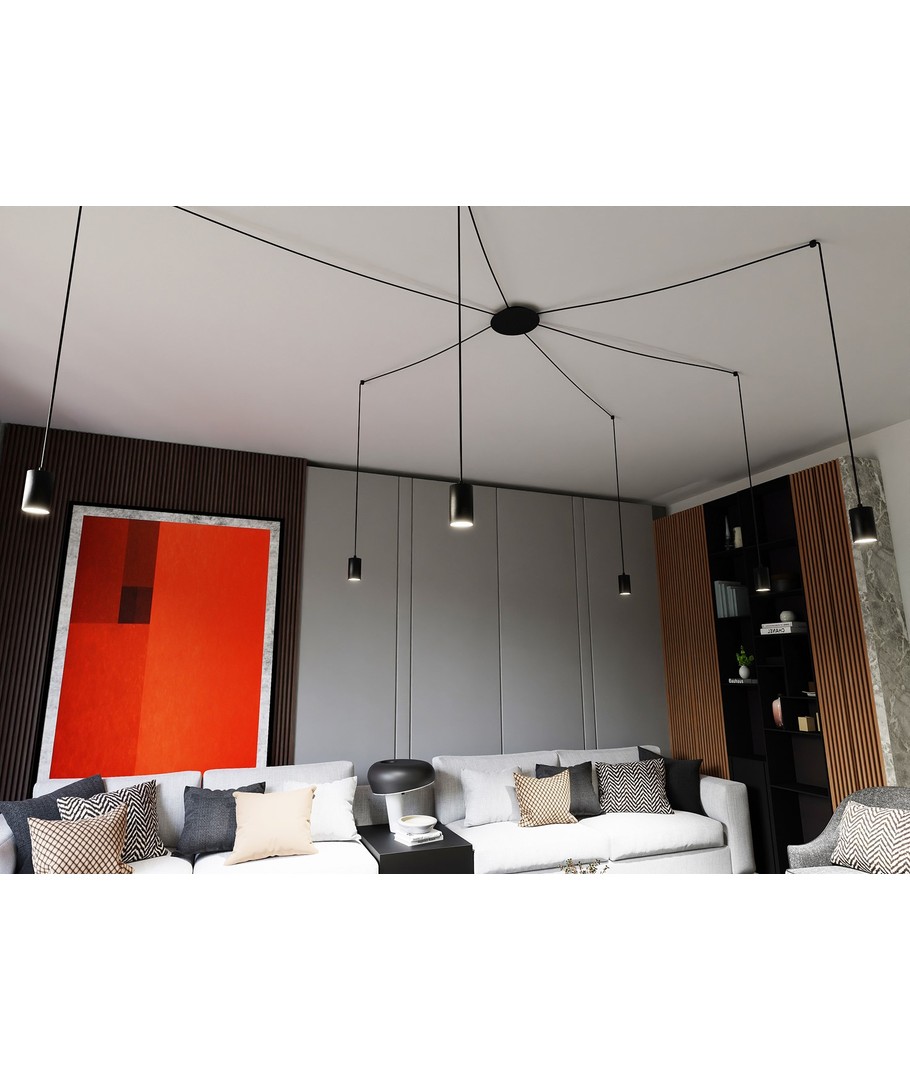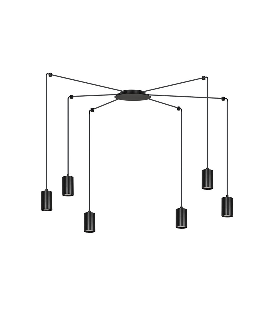 Traker 6/Sort pendellampen er et elegant og moderne valg til ditt hjem eller kontor. Designet som en spindelvev-type taklampe, utnytter den lange ledninger til å skape mange kreative oppsett. Denne lampen er ideell for høye takrom, hvor den vakkert fremhever rommet og gir en imponerende belysning. Den stilfulle svarte fargen og de metalrør i pulverlakkert stål bidrar til et enkelt, men originalt design, som passer perfekt inn i moderne interiør.