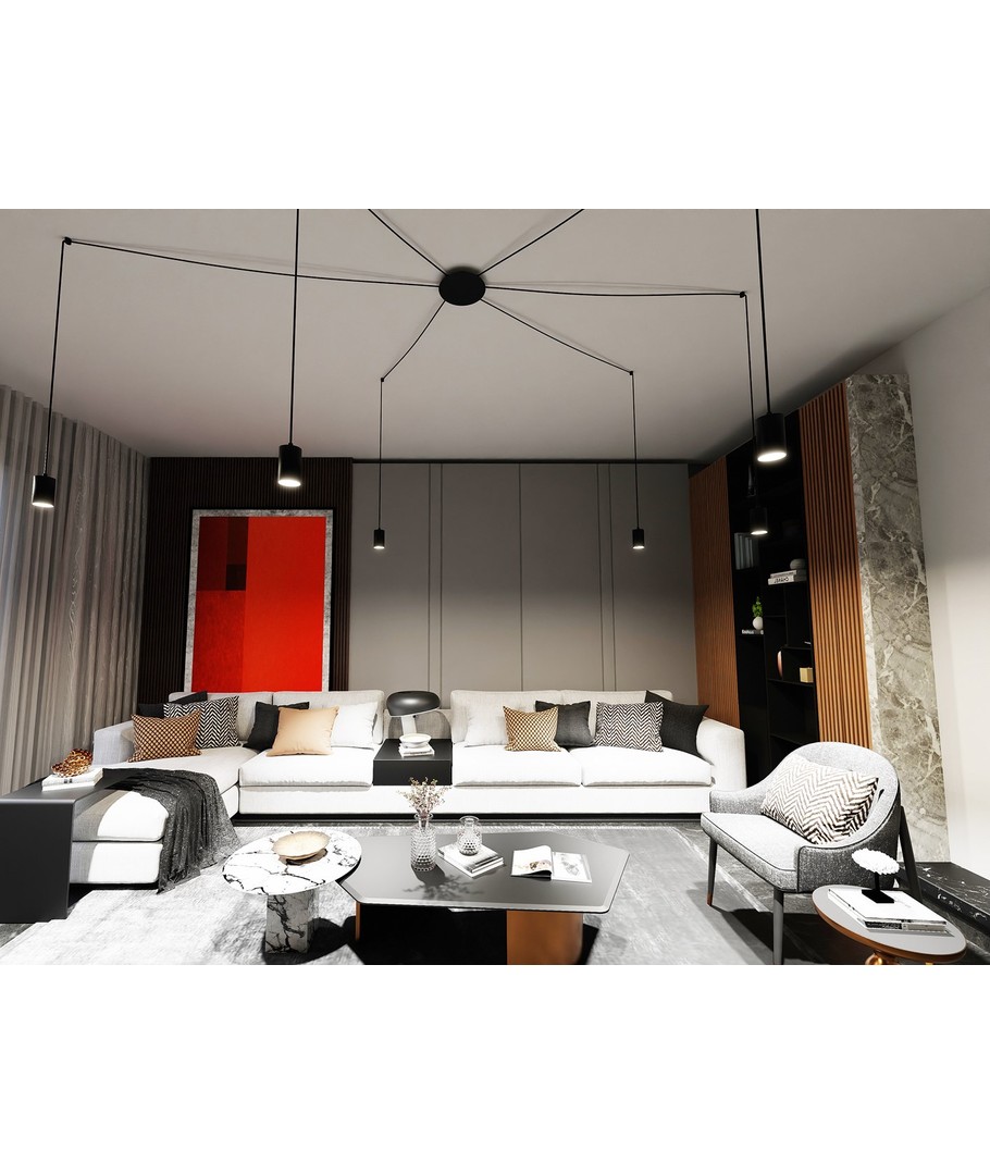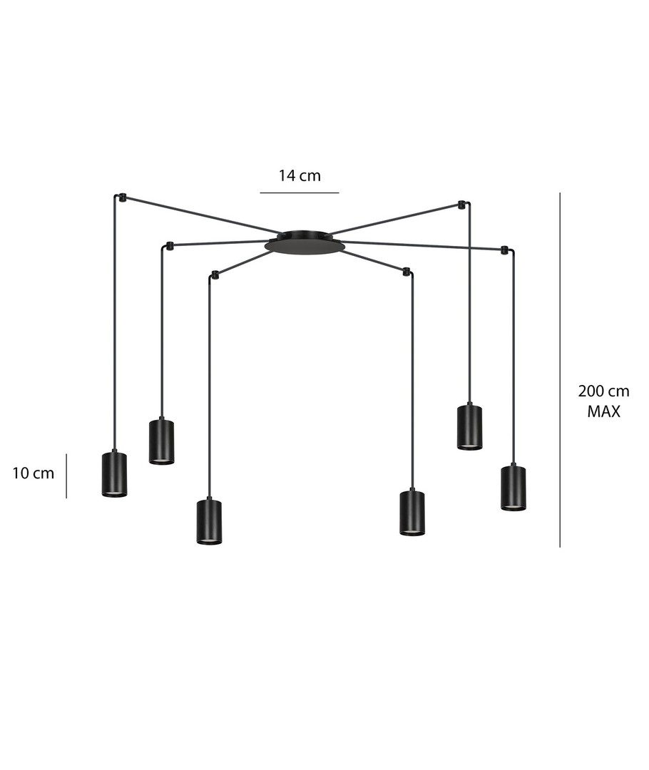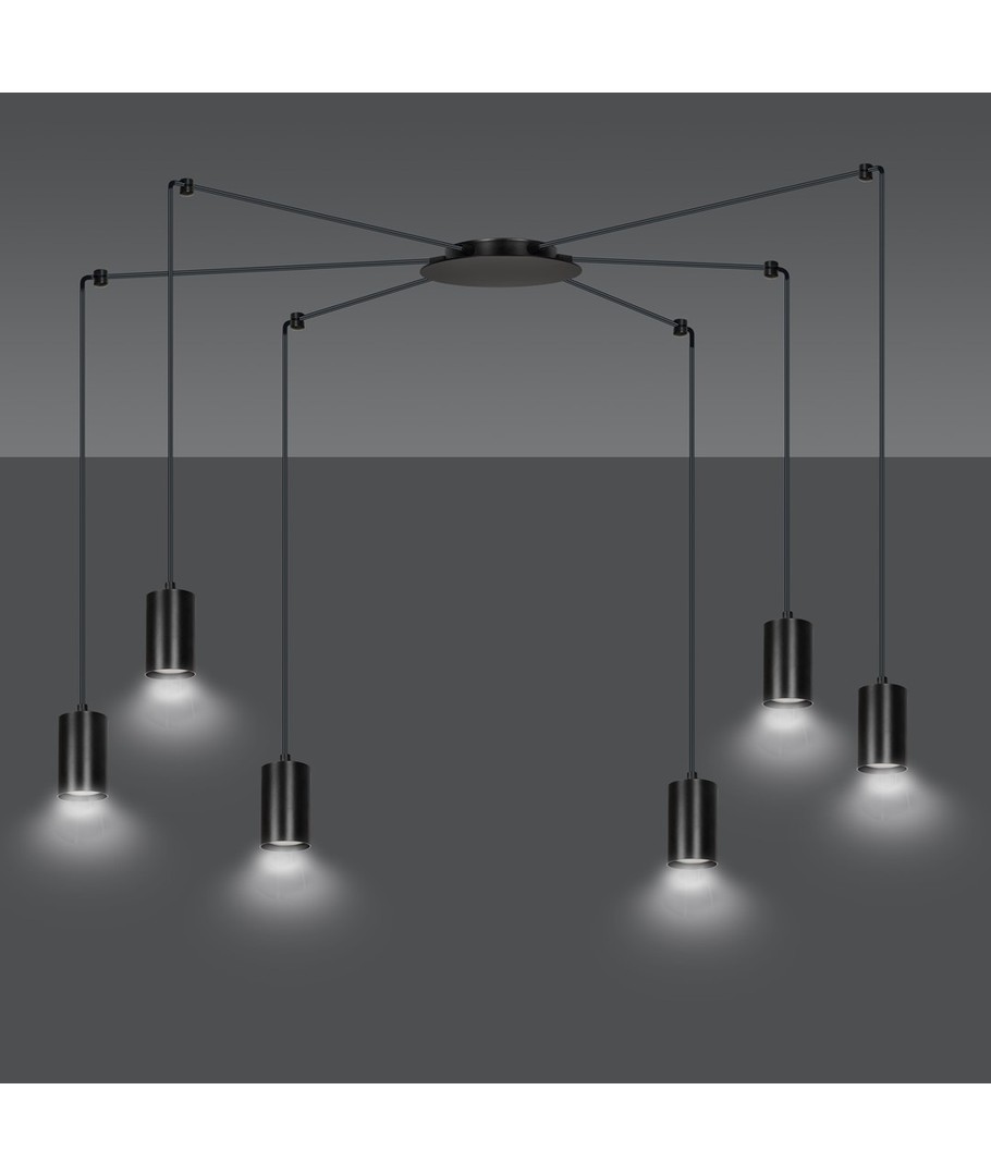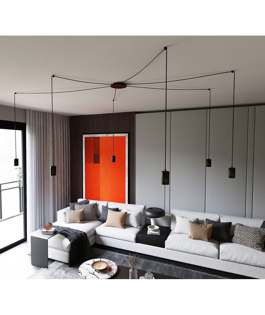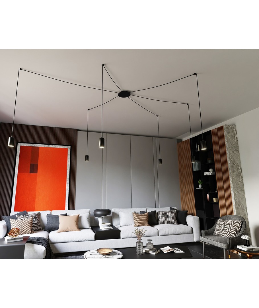 Traker 6/Sort pendellampen er et elegant og moderne valg til ditt hjem eller kontor. Designet som en spindelvev-type taklampe, utnytter den lange ledninger til å skape mange kreative oppsett. Denne lampen er ideell for høye takrom, hvor den vakkert fremhever rommet og gir en imponerende belysning. Den stilfulle svarte fargen og de metalrør i pulverlakkert stål bidrar til et enkelt, men originalt design, som passer perfekt inn i moderne interiør.