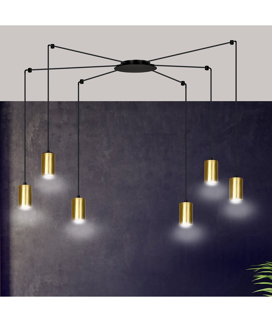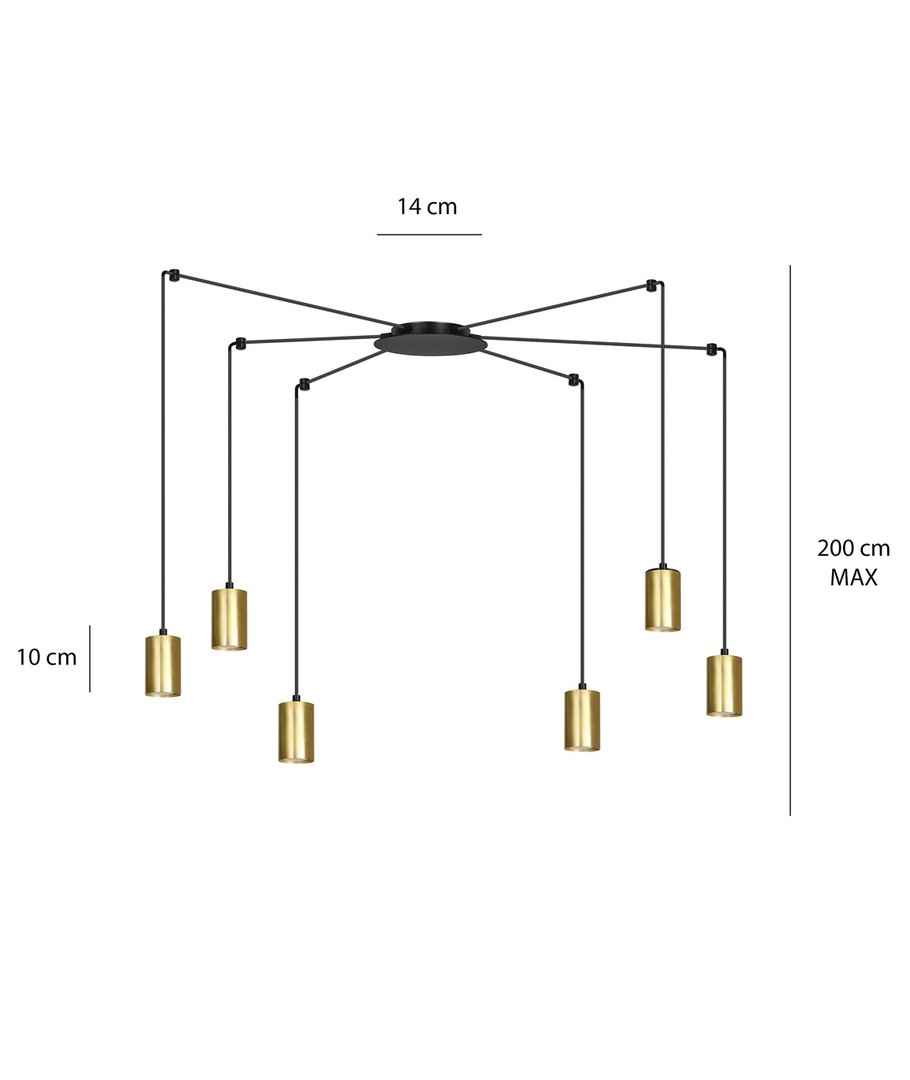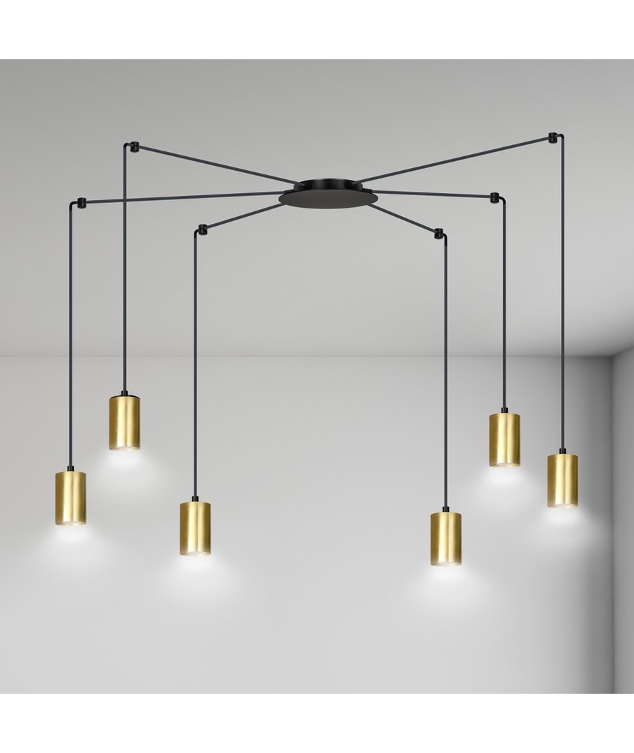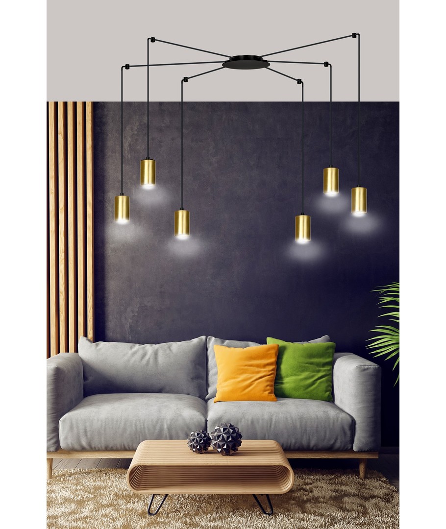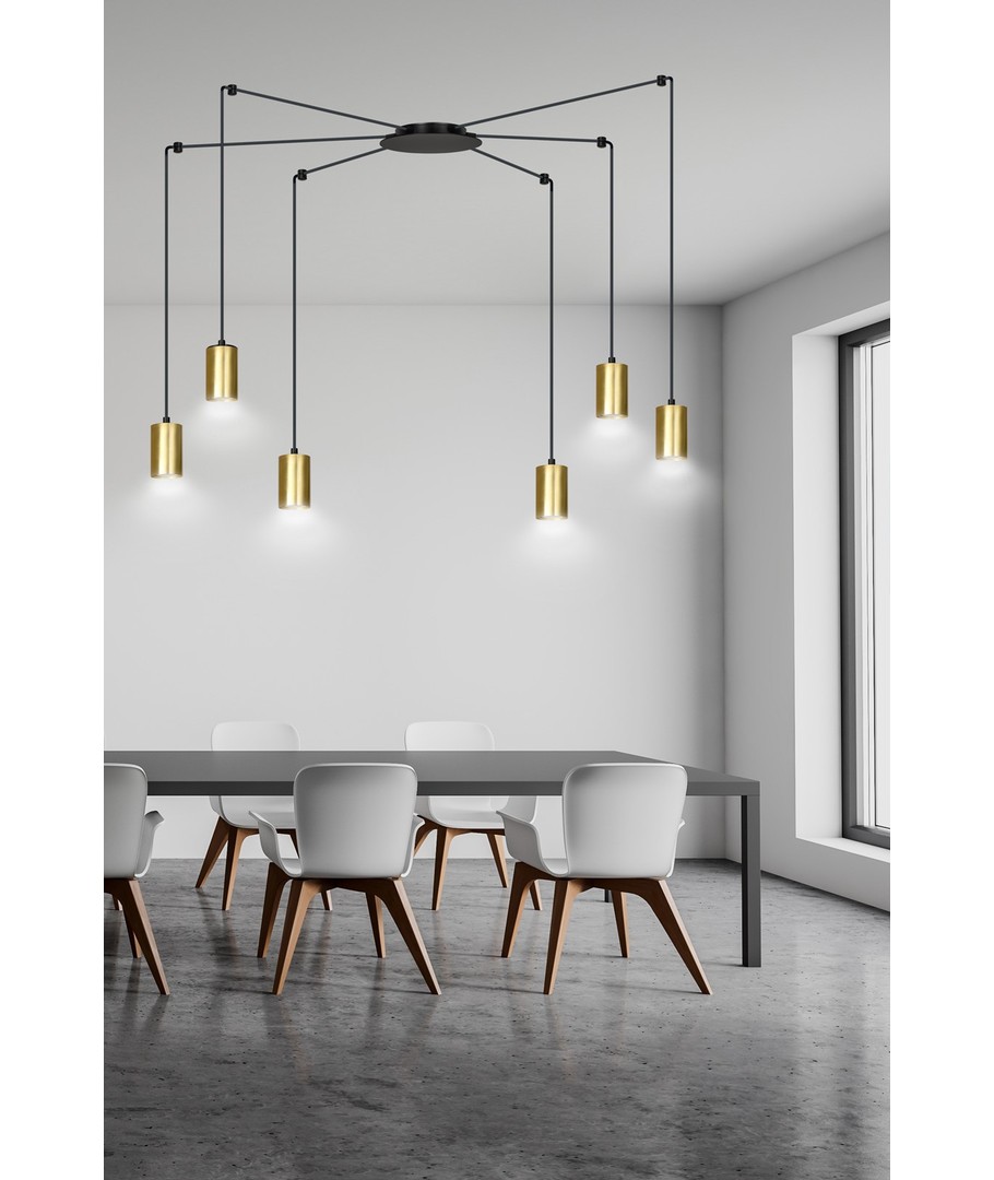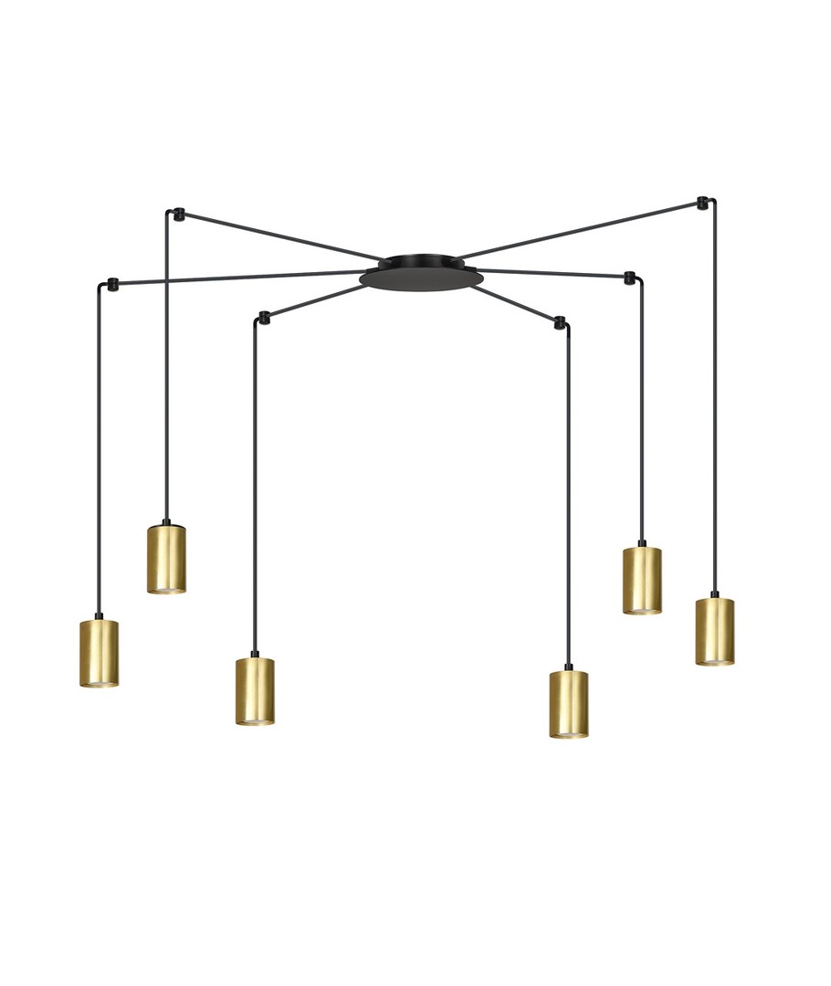 Traker 6 Sort/Gull pendellampe er en elegant og unik taklampe designet for moderne hjem med høyt under taket. Med sin edderkopp-lignende struktur og lange ledninger gir lampen en rekke opphengsmuligheter som fremhever rommets karakter. Dens stilfulle metallerør i sort og gull tilfører et sofistikert preg til enhver innredning. Den enkle, men iøynefallende utformingen sikrer en imponerende belysning som skaper en behagelig atmosfære i rommet. Perfekt for dem som ønsker både funksjonalitet og stil.