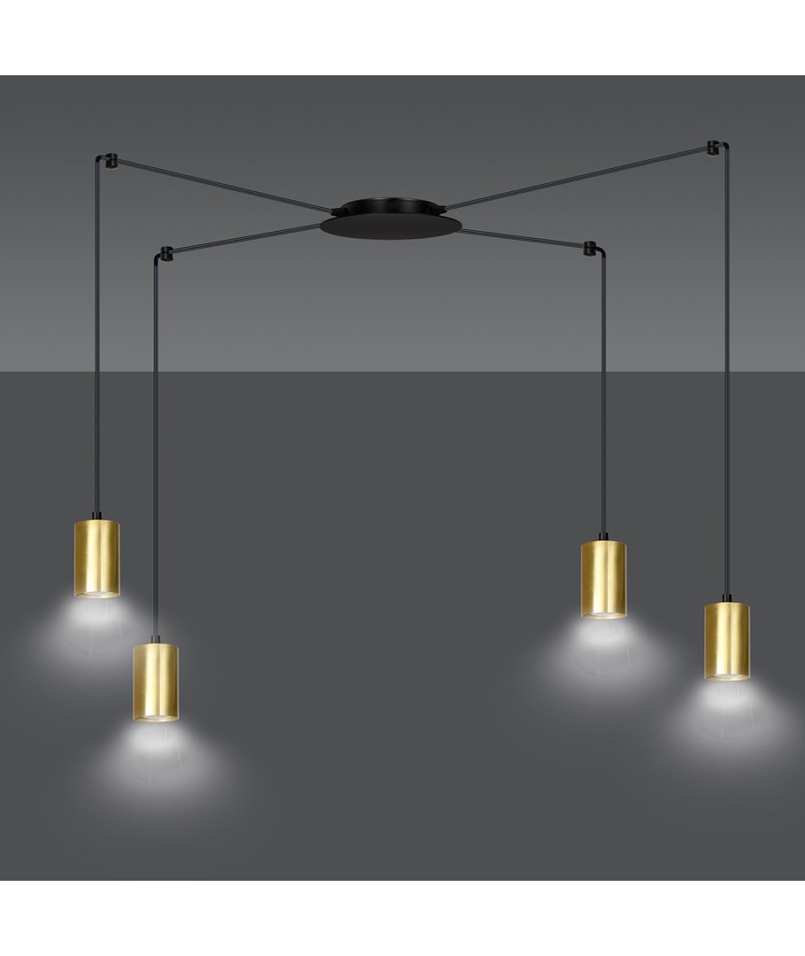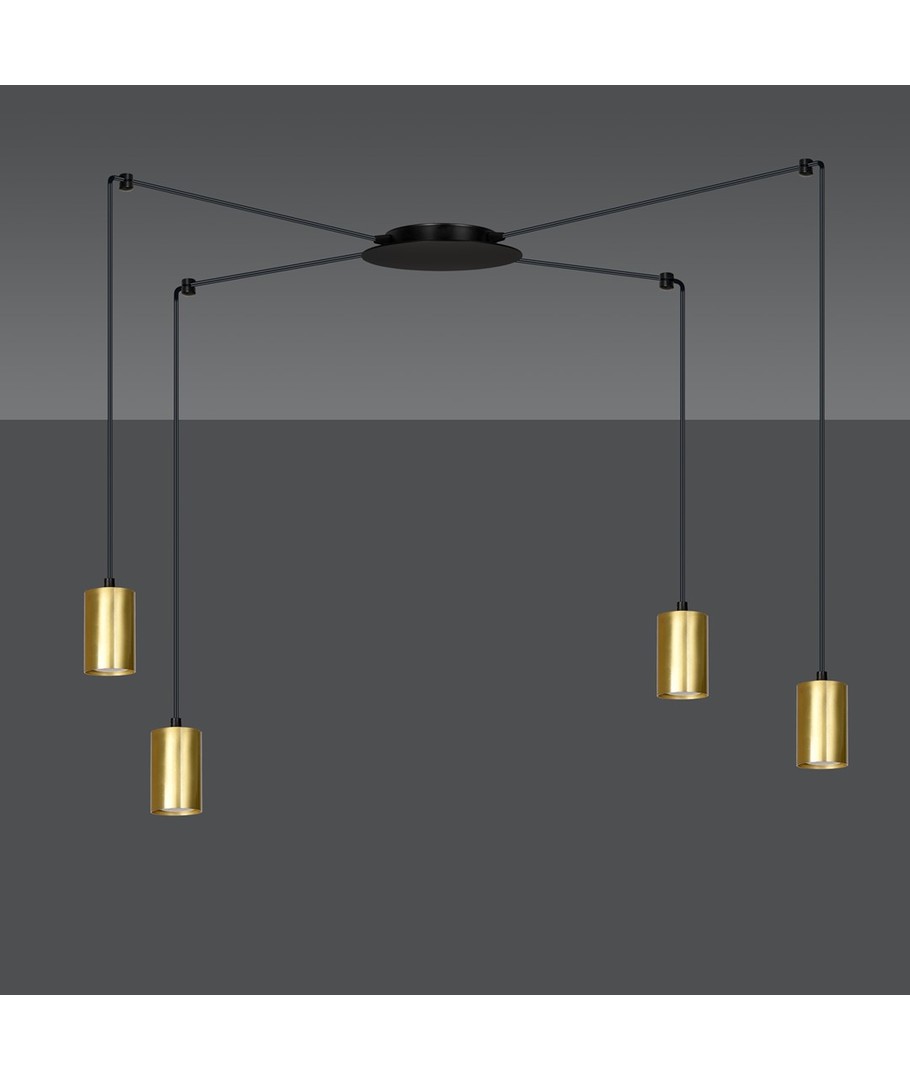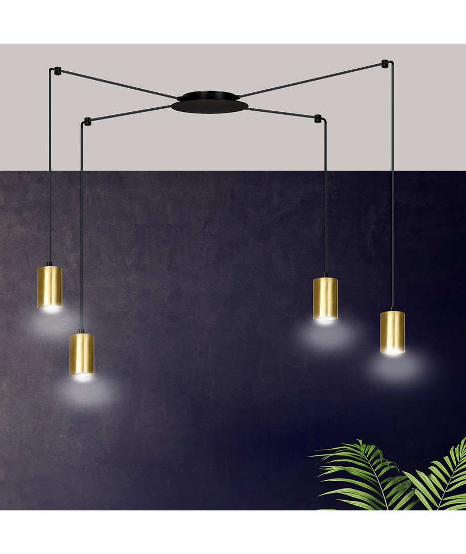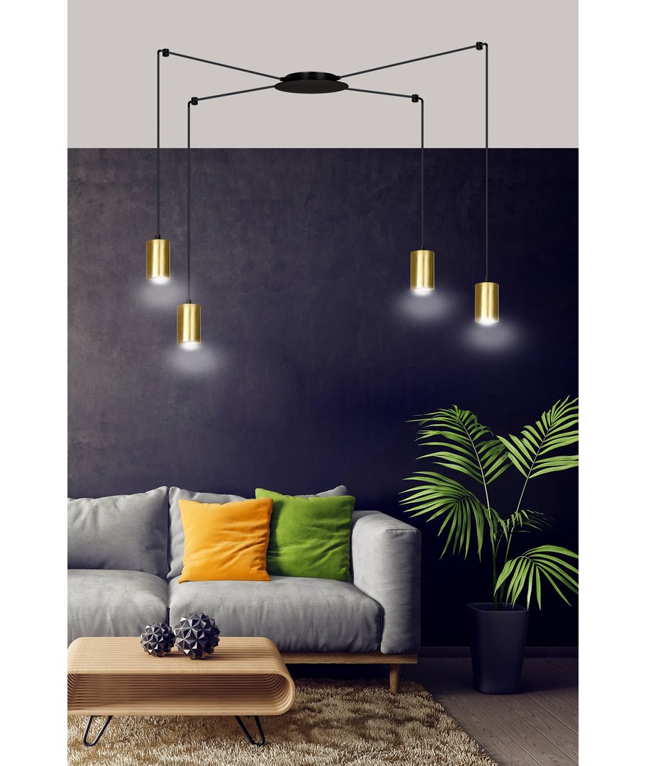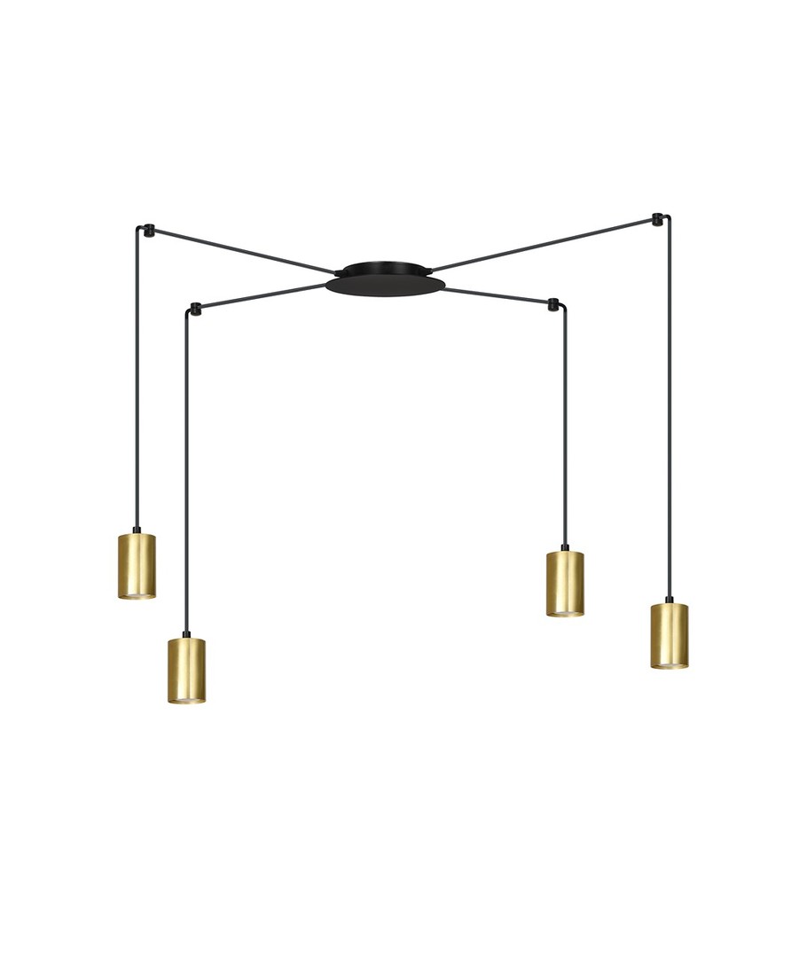 Traker 4 Sort/Gull pendellampen er en bemerkelsesverdig taklampe som kombinerer funksjonalitet med et stilfullt design. Dens edderkopplignende struktur gjør den ideell for høye takrom, hvor de lange ledningene kan arrangeres på mange måter. Lampens sort- og gullfargede metallrør tilfører et moderne touch som fremhever rommets karakter og skaper en fengslende belysning. Den enkle, men originale utførelsen gjør Traker-lampen til det perfekte valget for dem som verdsetter både design og funksjonalitet i deres innredning.