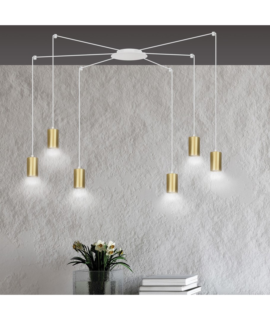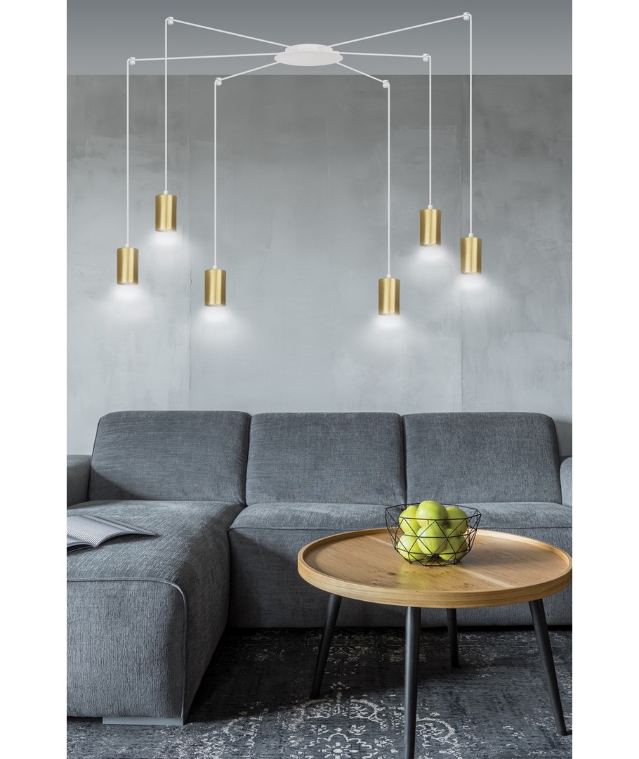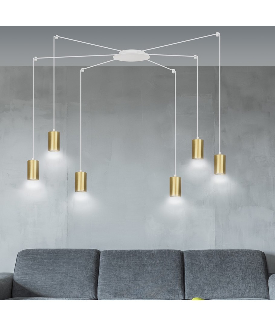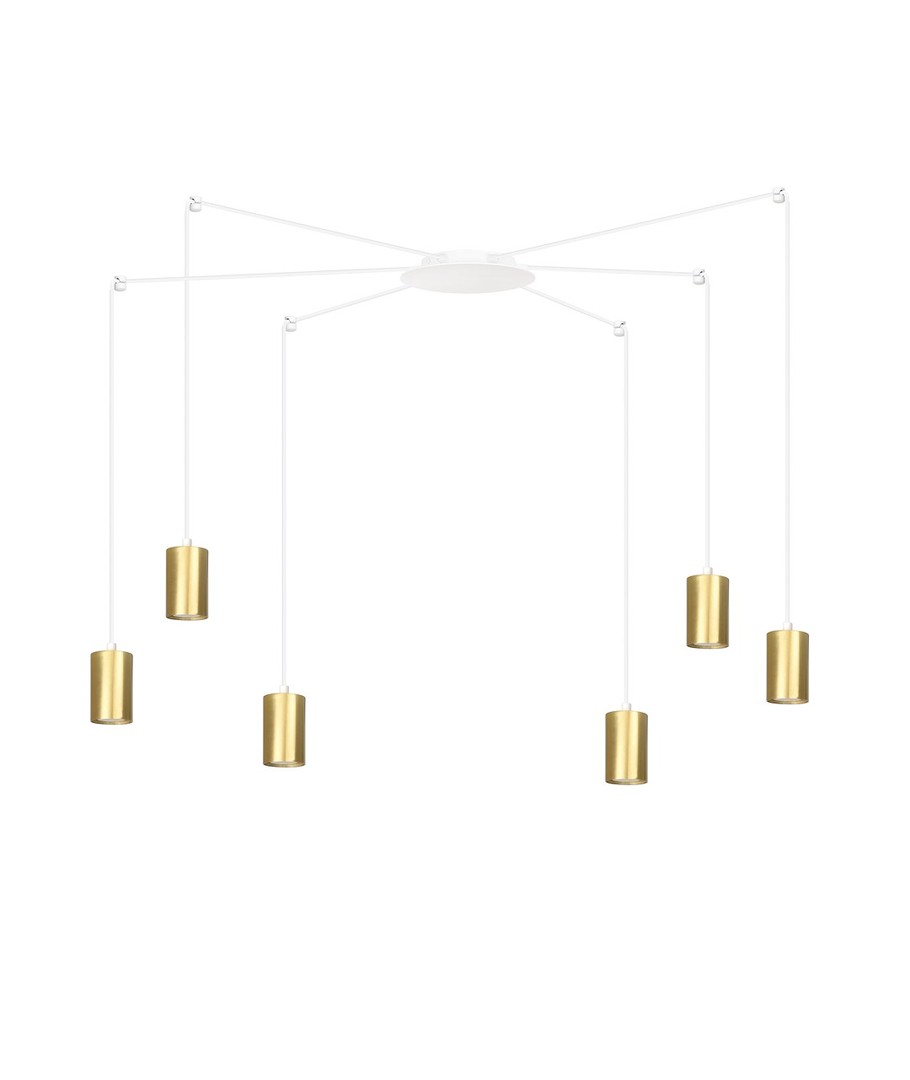 Traker 6 pendellampe i hvitt og gull er en unik tillegg til ethvert moderne hjem. Denne edderkopplignende taklampen imponerer med sine lange, justerbare ledninger, som gir utallige muligheter for ordning. Lampens design er ideelt for romslige lofts-hjem, hvor den fremhever den moderne innredningen og skaper en fengslende belysning. De stilige metallrørene tilfører rommet eleganse, mens den enkle, men originale stilen gjør lampen til et blikkfang.