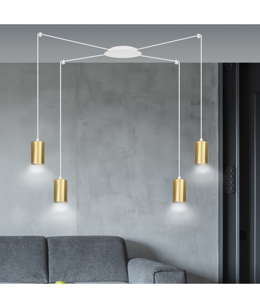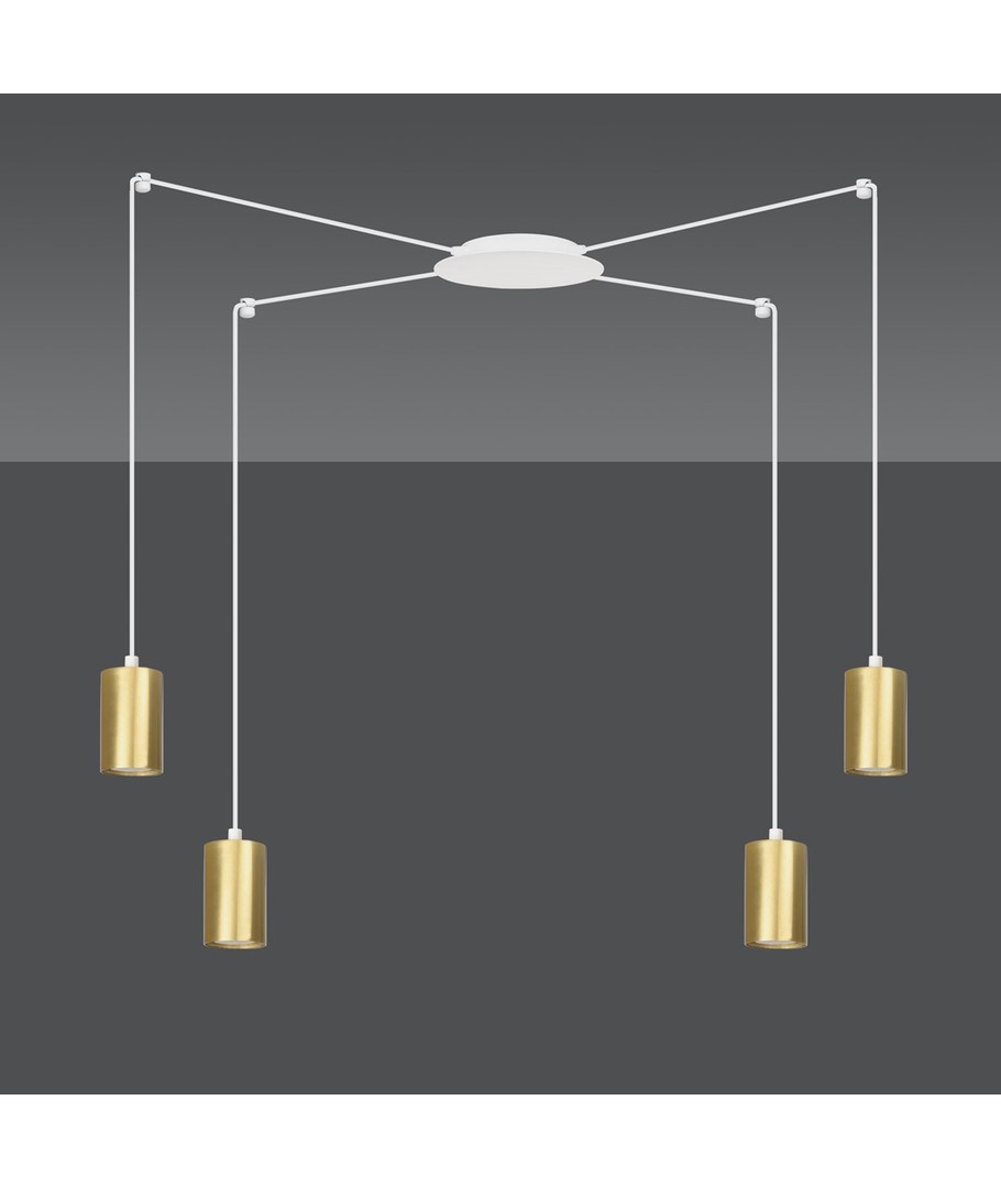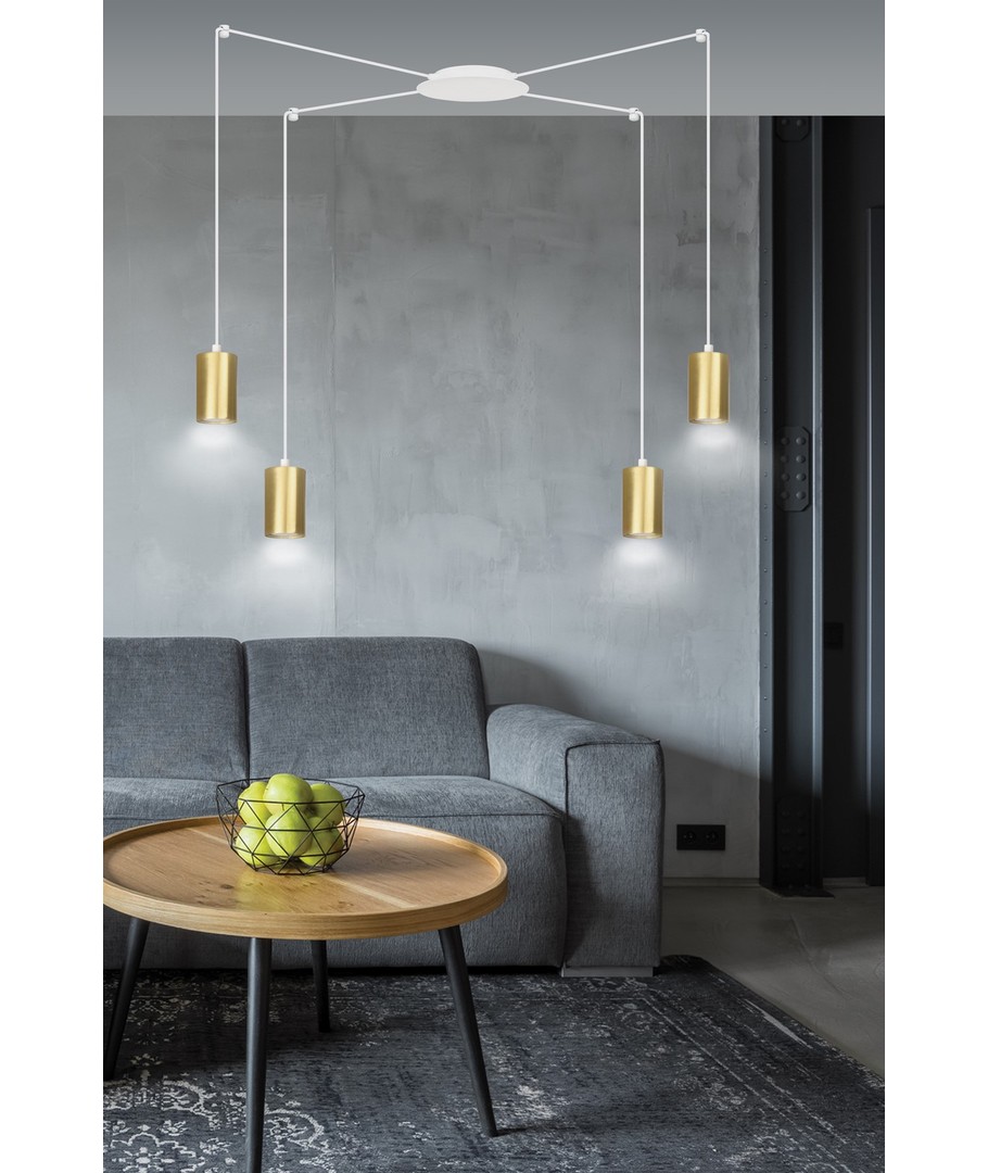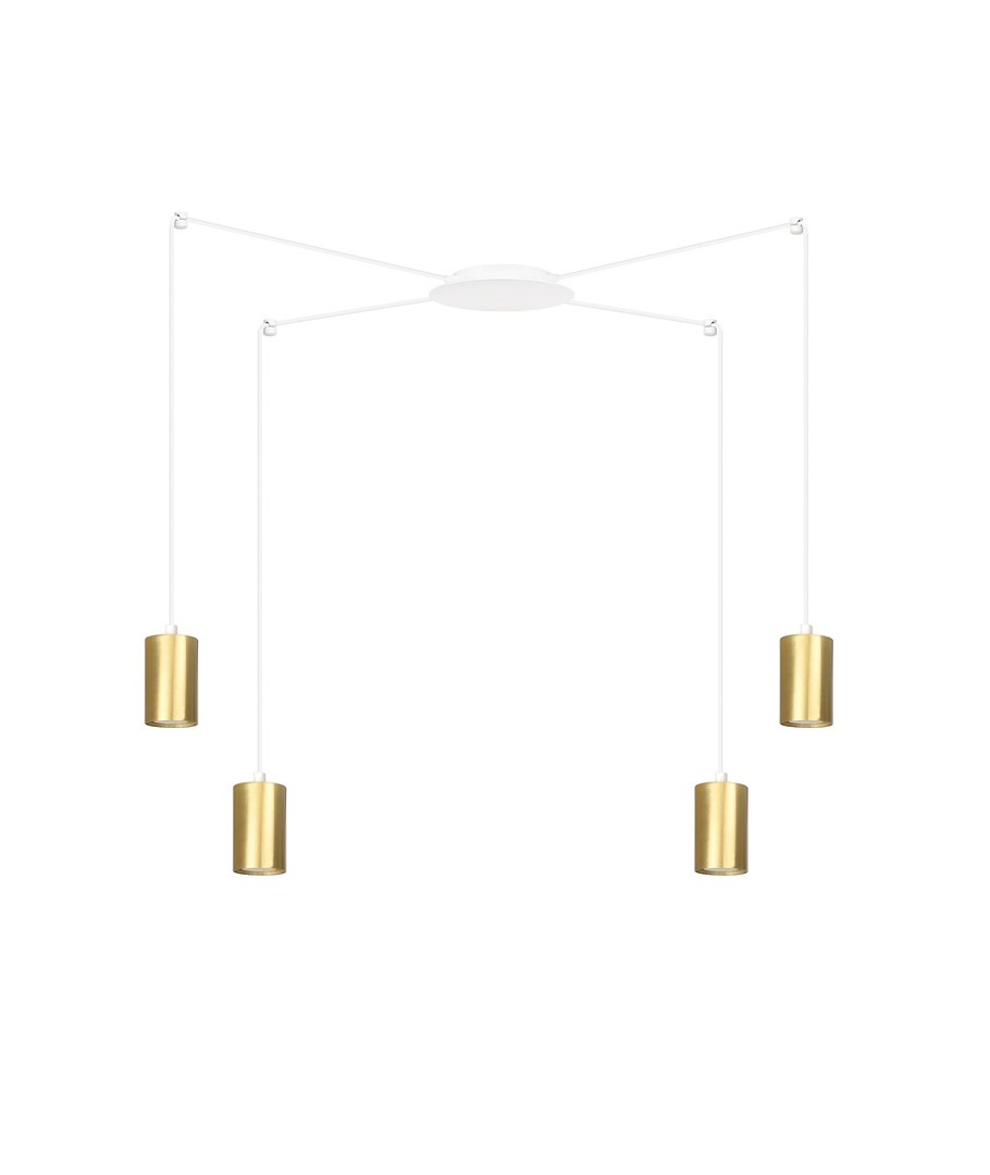 Traker 4 Hvit/Gull pendellampe er den perfekte løsningen for deg som ønsker å bringe moderne eleganse inn i ditt hjem. Med sitt unike edderkoppdesign og lange ledninger kan denne lampen tilpasses etter dine preferanser til enhver innredning. Den er ideell for høye takhøyder og vil gi en fornem belysning som fremhever rommets karakter. De stilige metaltrørene tilfører en sofistikert touch, mens det enkle designet skaper en unik visuell appell.