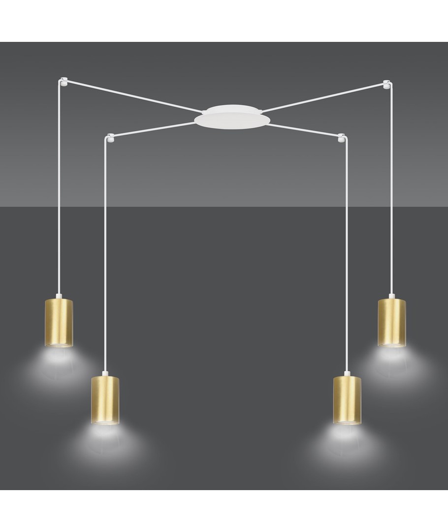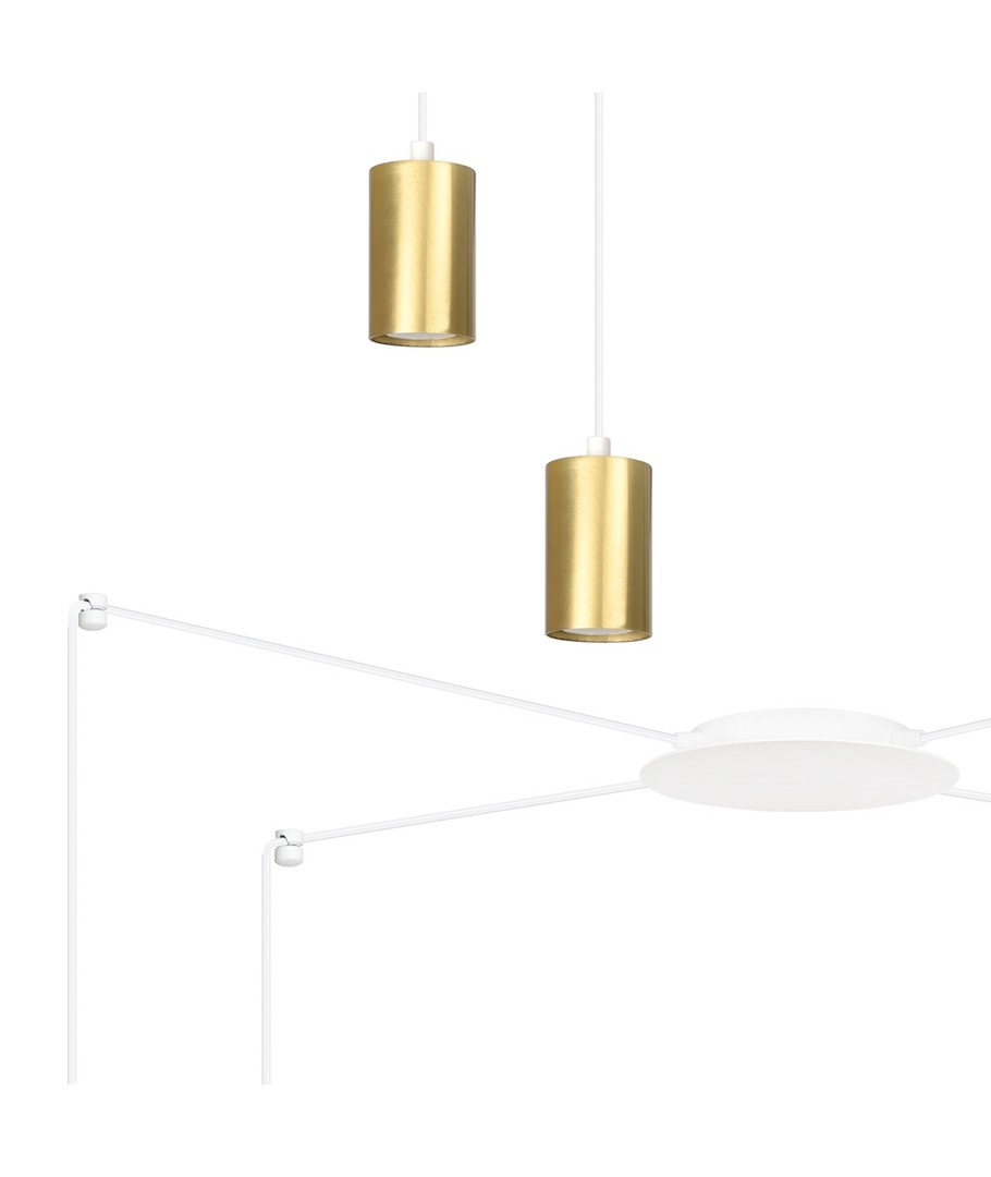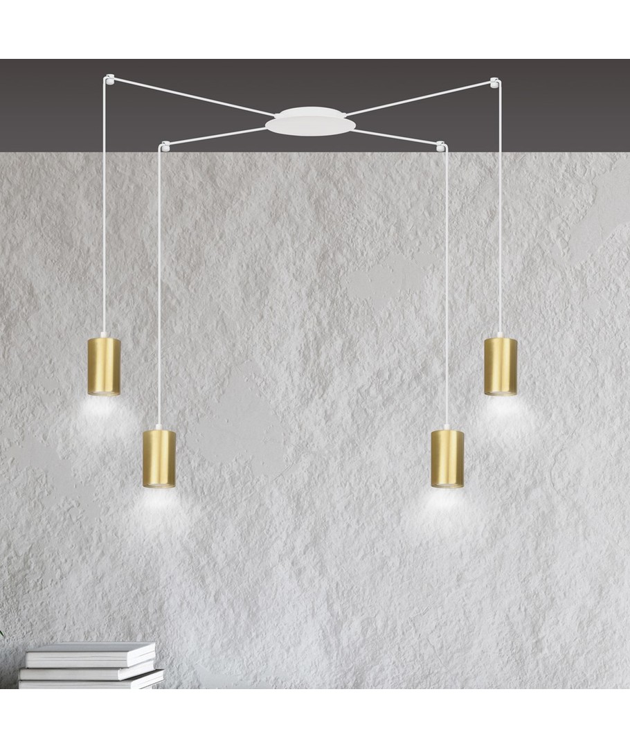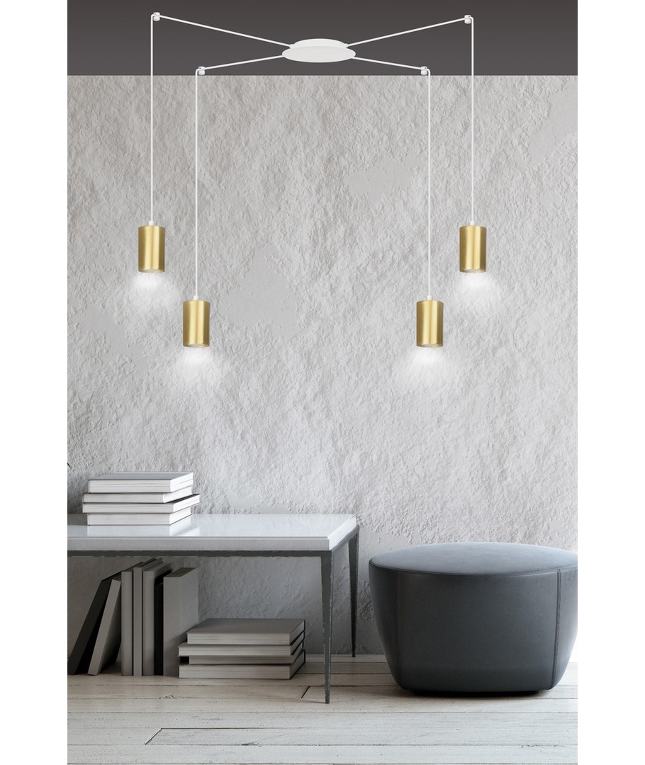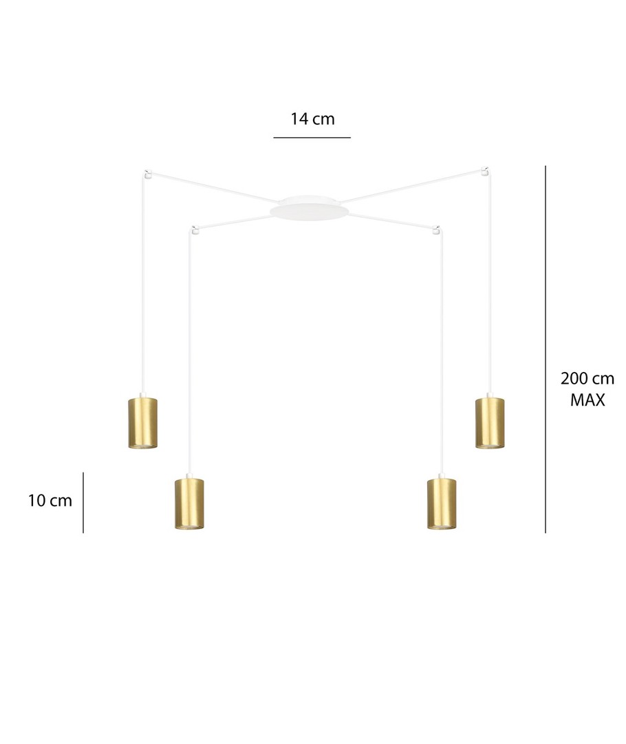 Traker 4 Hvit/Gull pendellampe er den perfekte løsningen for deg som ønsker å bringe moderne eleganse inn i ditt hjem. Med sitt unike edderkoppdesign og lange ledninger kan denne lampen tilpasses etter dine preferanser til enhver innredning. Den er ideell for høye takhøyder og vil gi en fornem belysning som fremhever rommets karakter. De stilige metaltrørene tilfører en sofistikert touch, mens det enkle designet skaper en unik visuell appell.