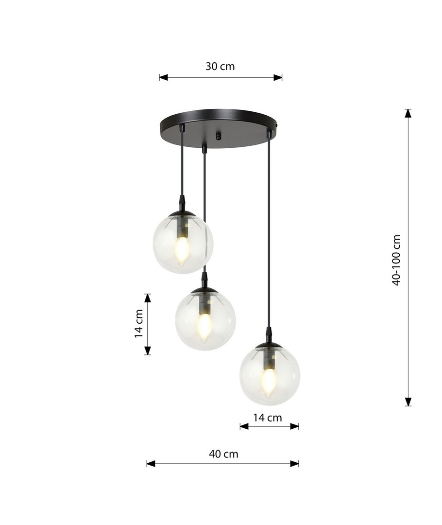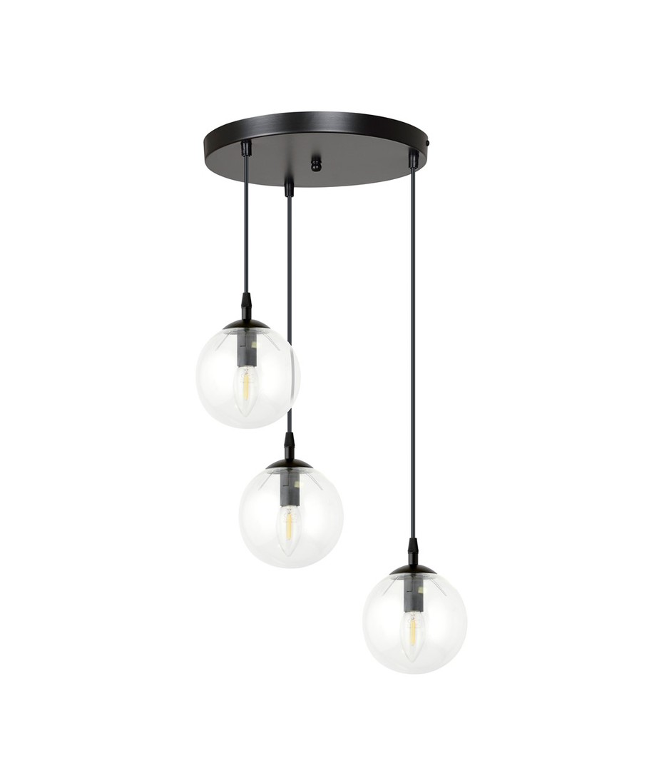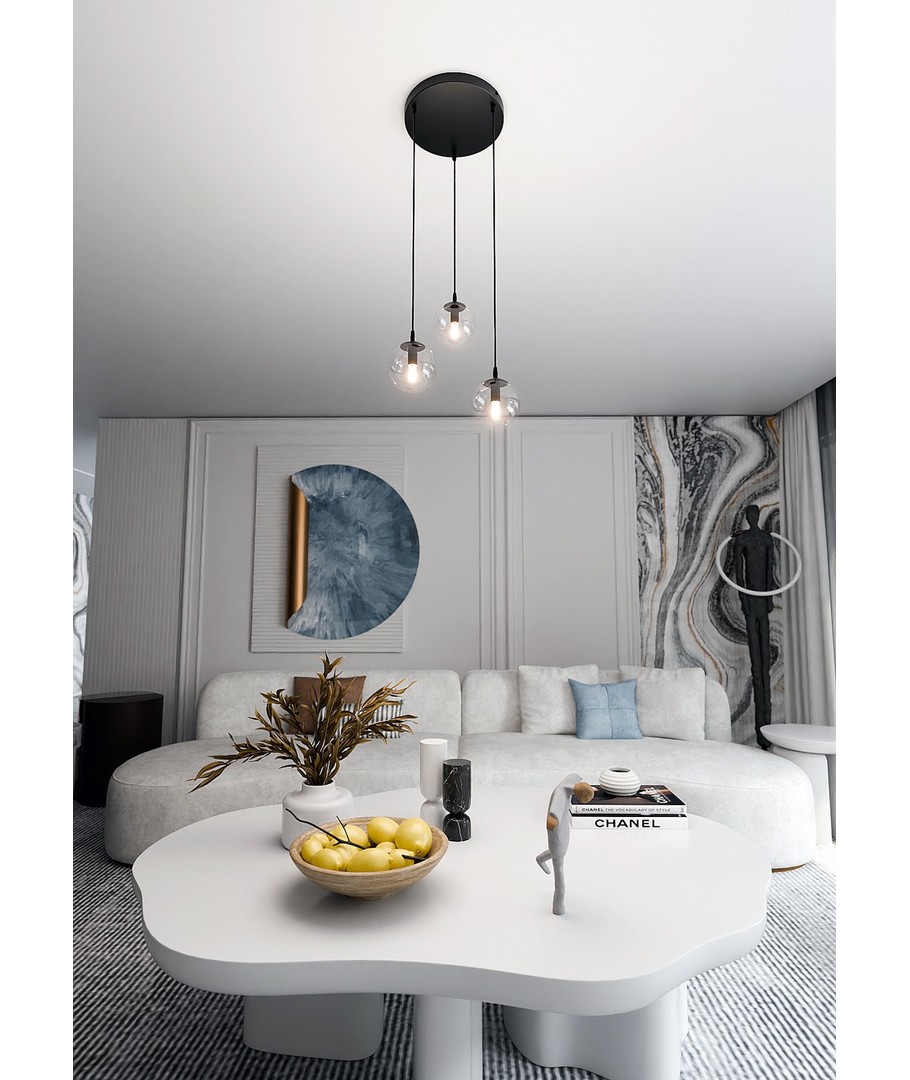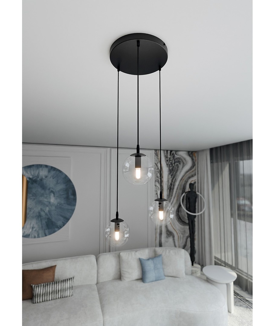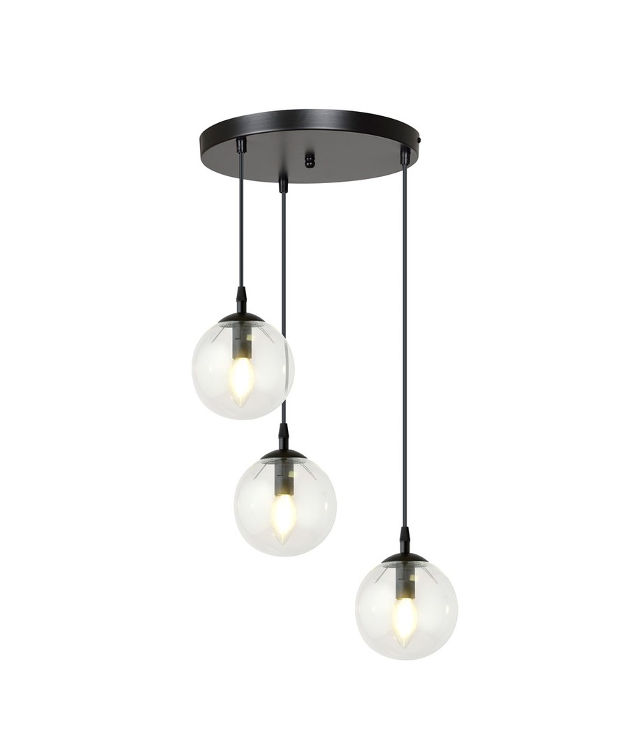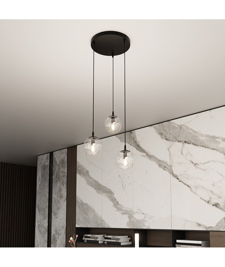Cosmo 3 Sort Premium Transparent pendellampe er en del av den allsidige og tidløse COSMO-serien. Denne lampens minimalistiske design passer perfekt til moderne innredningstrender samtidig som den bevarer en klassisk eleganse. De trendy glasskjermene sørger for en fremragende belysning i rommet.