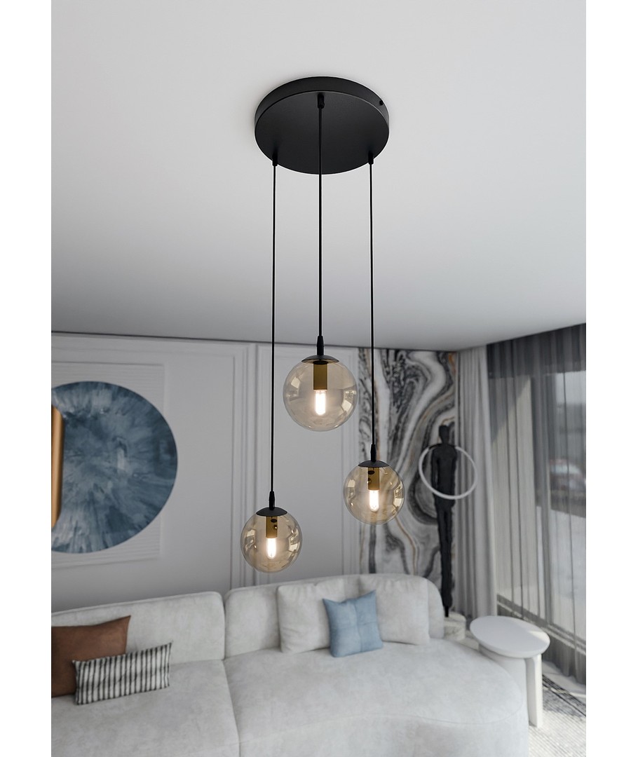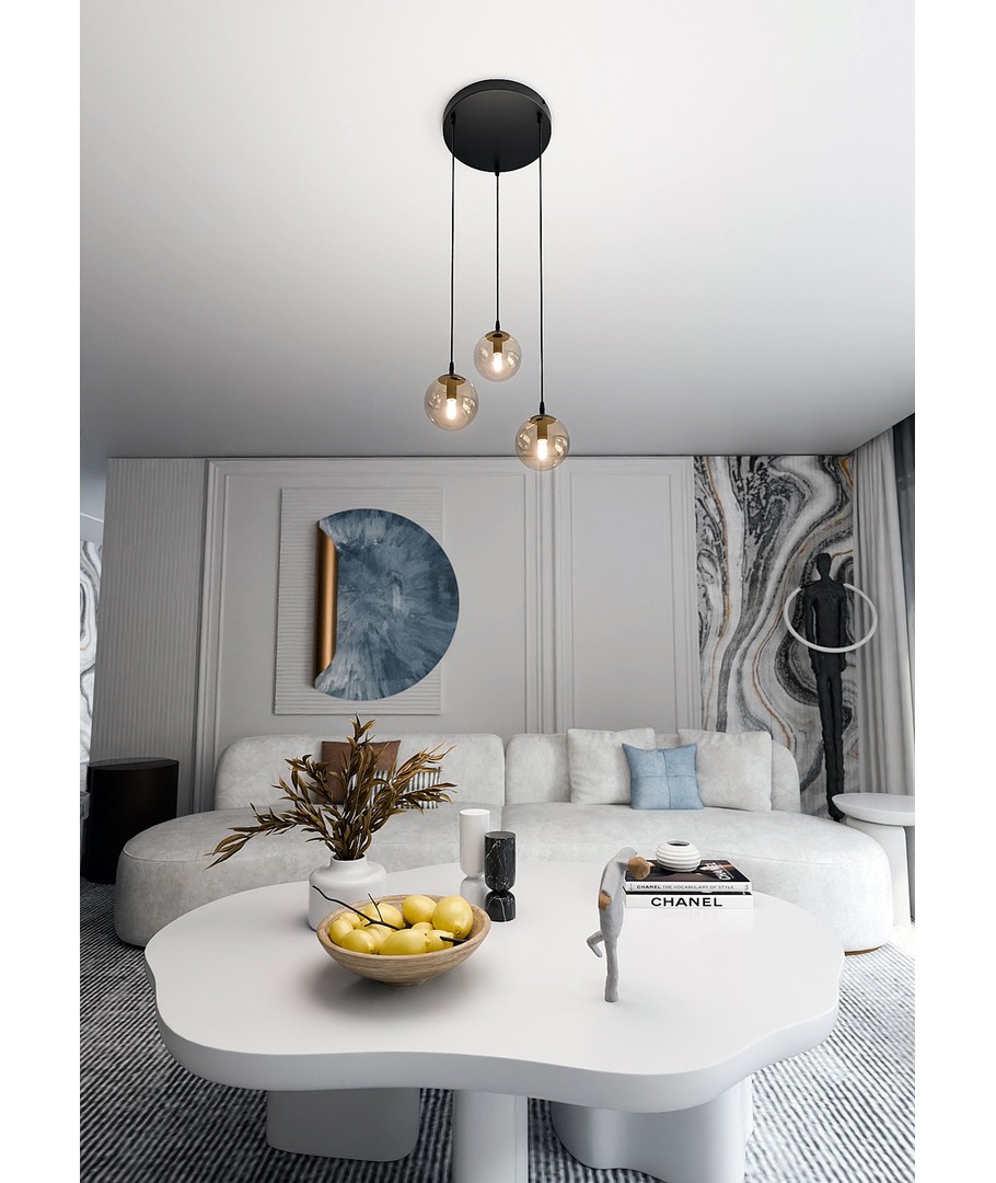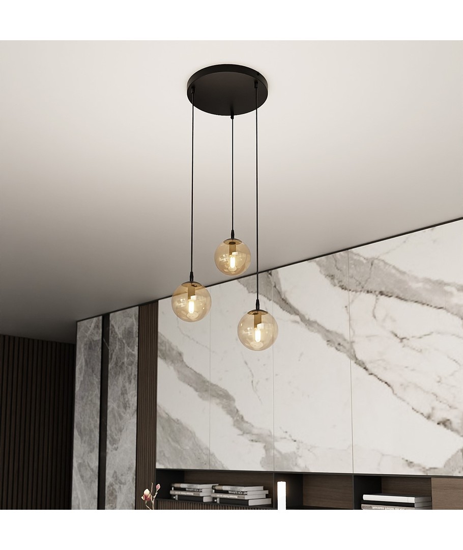 Oppdag den tidløse skjønnheten til Cosmo 3 Sort Premium Rav pendellampe, perfekt for å tilføre et sofistikert preg til ethvert rom. Med sitt slanke og moderne design er denne pendellampen ideell for både stue, spisestue eller kjøkken.