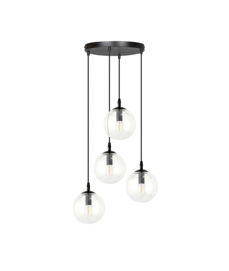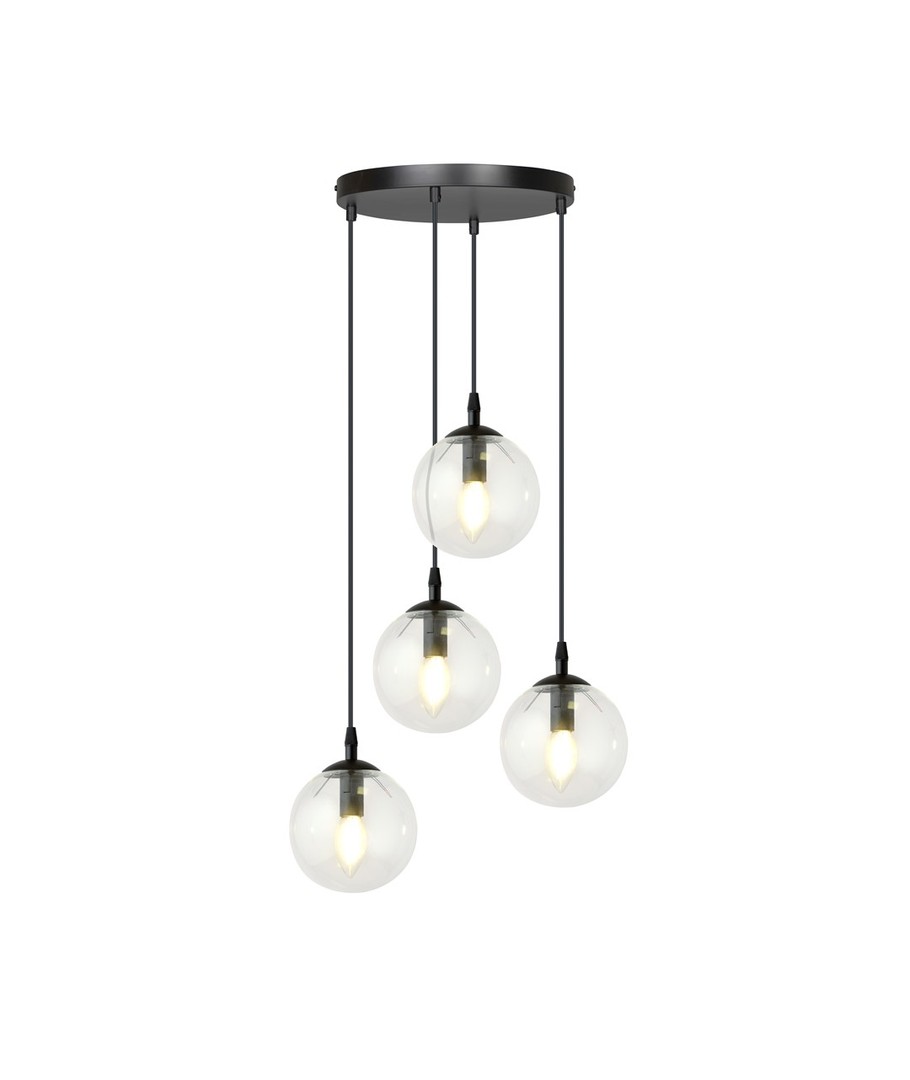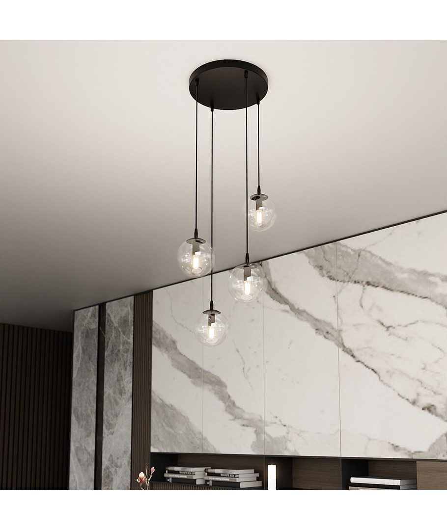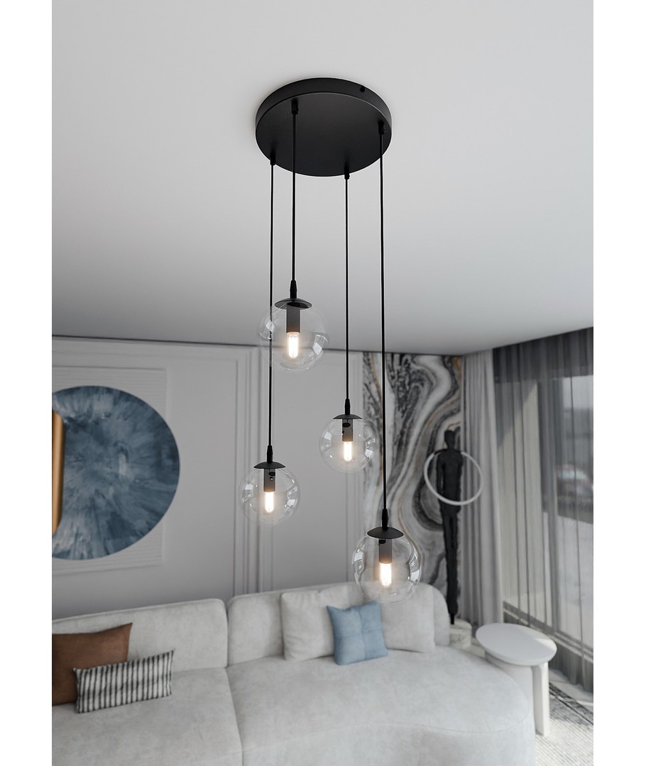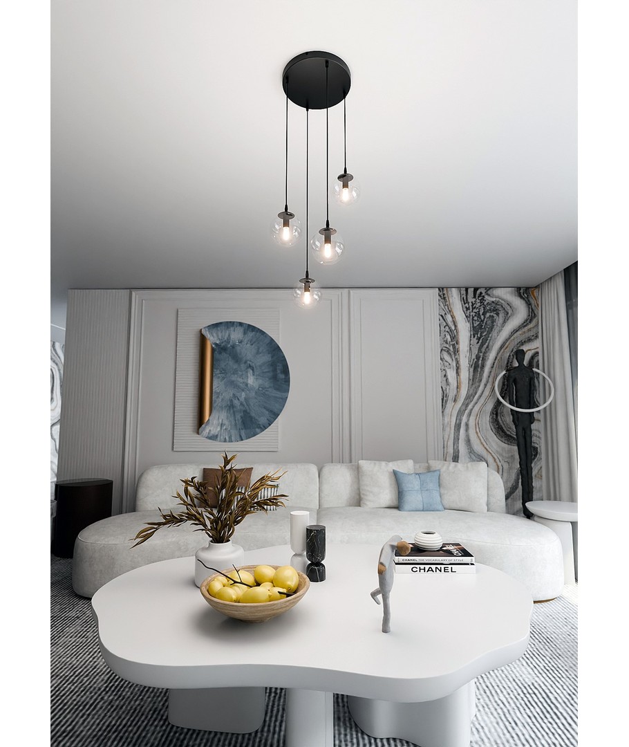 Cosmo 4 Sort Premium Transparent pendellampe er en del av den elegante COSMO-serien, som forener tidløs eleganse med moderne trender. Med sitt minimalistiske design passer lampen perfekt inn i enhver innredning og gir rommet en sofistikert belysning. De vakre, transparente lampeskjermene i glass sikrer et jevnt og behagelig lys, som løfter atmosfæren i ditt hjem. Denne pendellampen er ideell for både spisestue, stue og kjøkken, hvor den kan justeres i høyden etter behov.