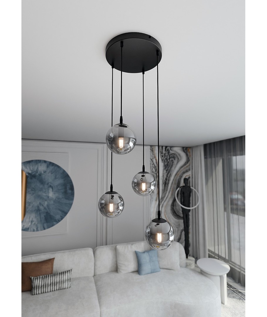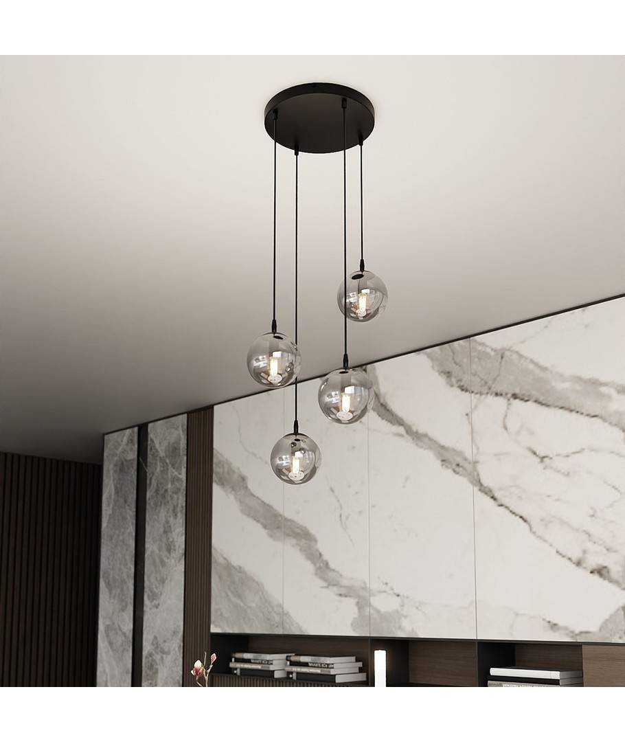Cosmo 4 Sort Premium Grafit pendellampe er en del av den allsidige og tidløse COSMO-serien, som komplementerer ethvert moderne hjem. Med sitt minimalistiske design følger lampen de nyeste trendene og bevarer samtidig en klassisk eleganse. De trendy glasskjermene sikrer en fremragende belysning som skaper en hyggelig atmosfære i rommet. Denne lampen er ideell for både stue og spisestue samt ethvert sted hvor stil og funksjonalitet skal gå hånd i hånd. Merk at lyskilde ikke er inkludert, noe som gir mulighet for å velge den perfekte pære etter dine behov. Lampehøyden kan justeres for å tilpasse belysningen til ditt rom.