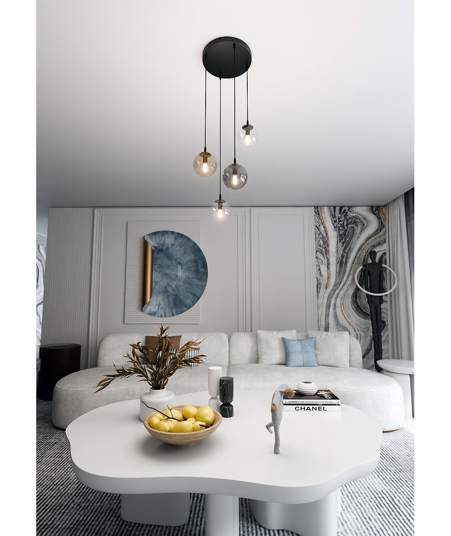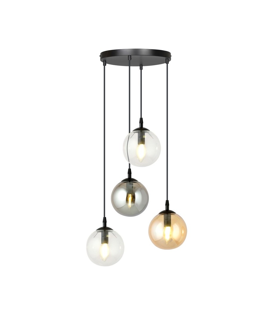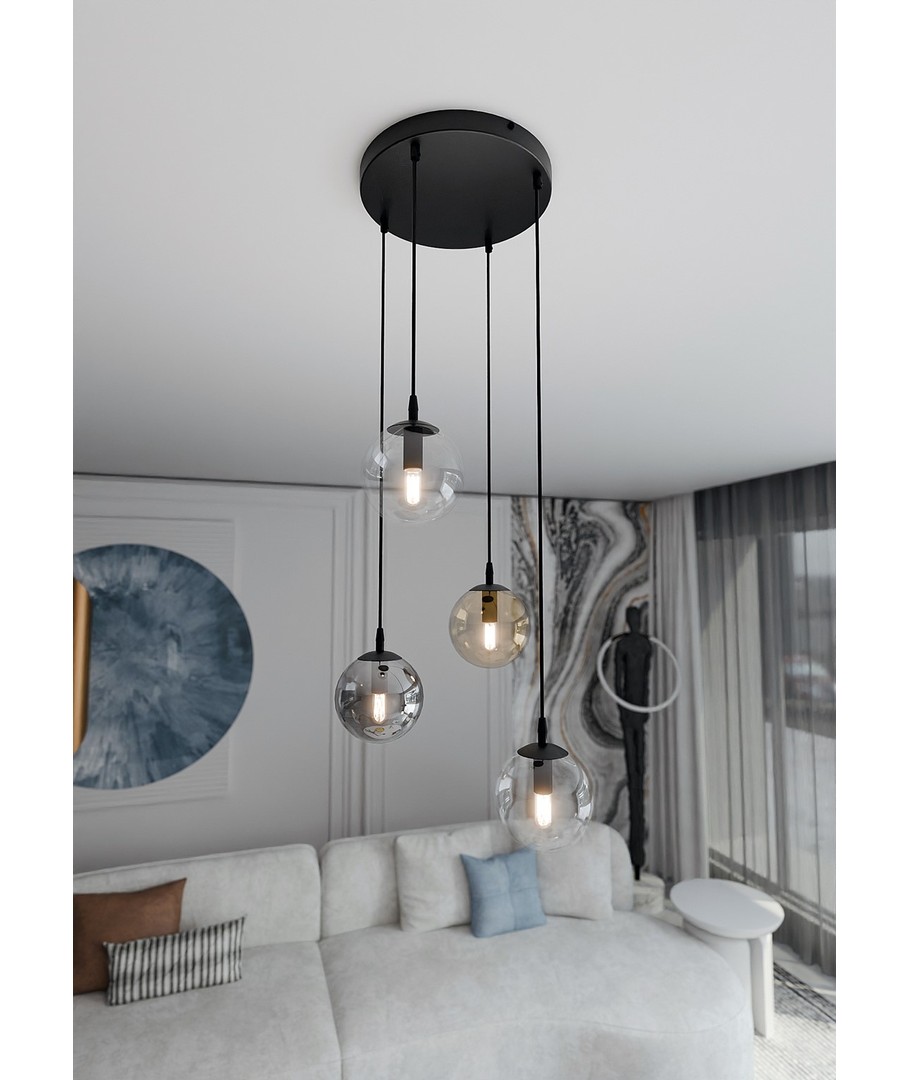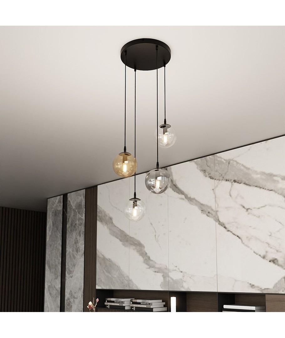 Opplev eleganse og funksjonalitet med Cosmo 4 Sort Premium Mix pendellampe. Denne imponerende lampe fra COSMO-serien kombinerer tidløs eleganse med moderne design, som passer perfekt inn i de nyeste trendene. De trendy glasskjermene sikrer ikke bare utmerket belysning, men tilfører også et stilfullt preg til ethvert rom. Den minimalistiske stilen gjør den allsidig, slik at den kan integreres i mange forskjellige interiørstiler. Enten det er over spisebordet eller i stuen, vil denne lampen skape en herlig atmosfære.