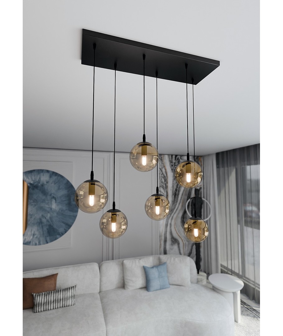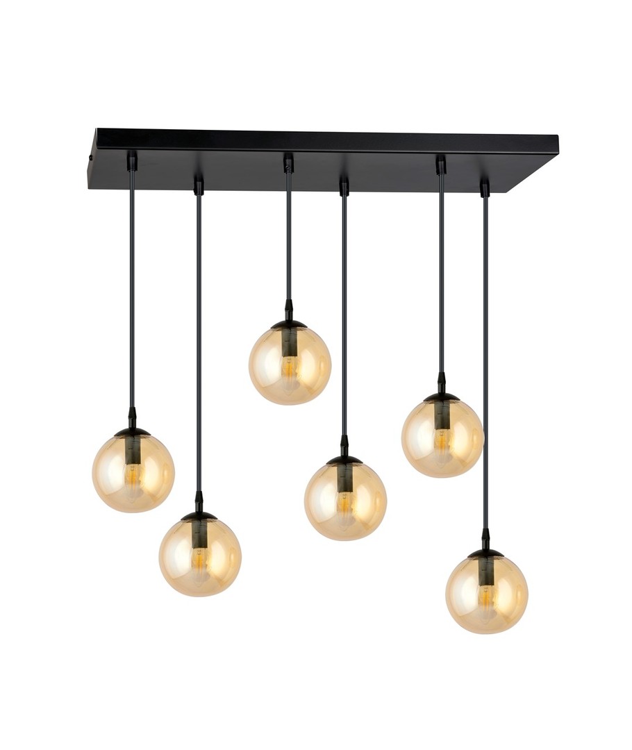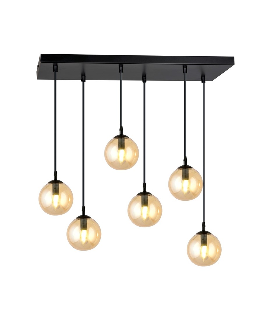 Oppgrader hjemmet ditt med den stilige og moderne Cosmo 6 Sort/Rav pendellampe. Denne elegante lampen er perfekt for å tilføre et snev av sofistikasjon og samtidsstil til ethvert rom.
