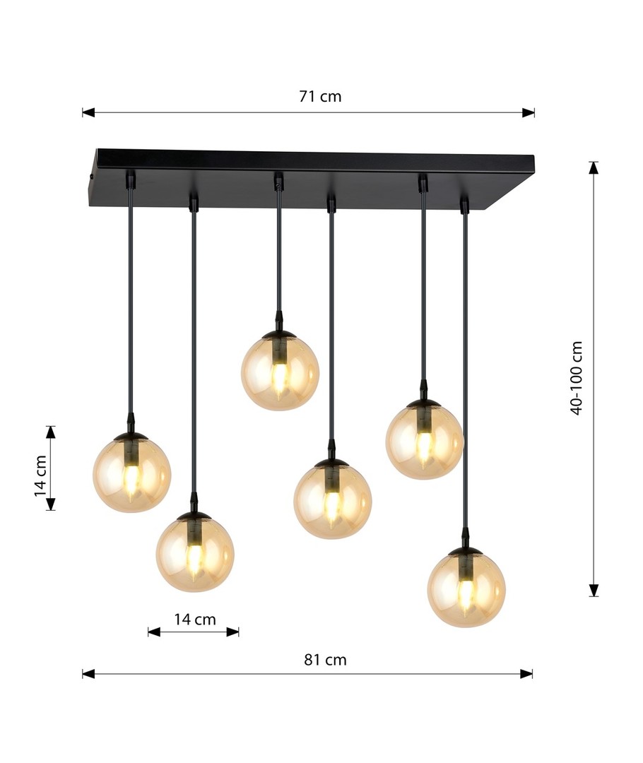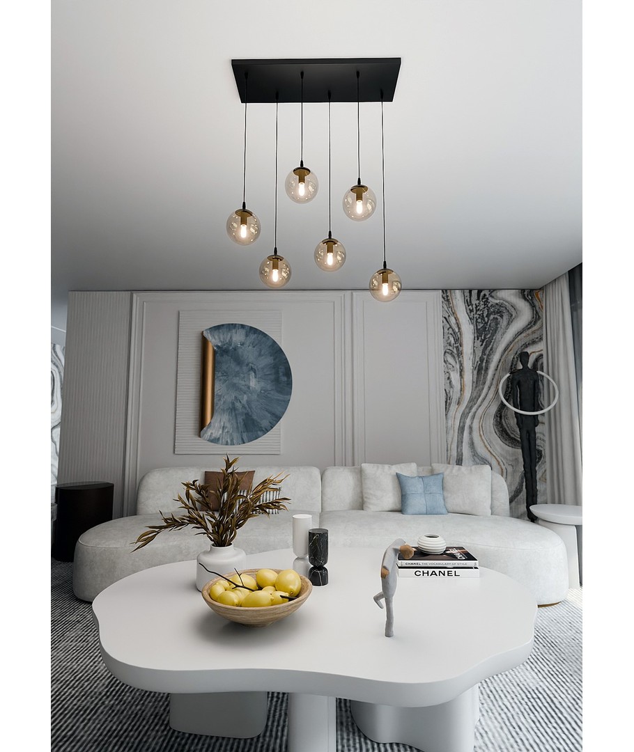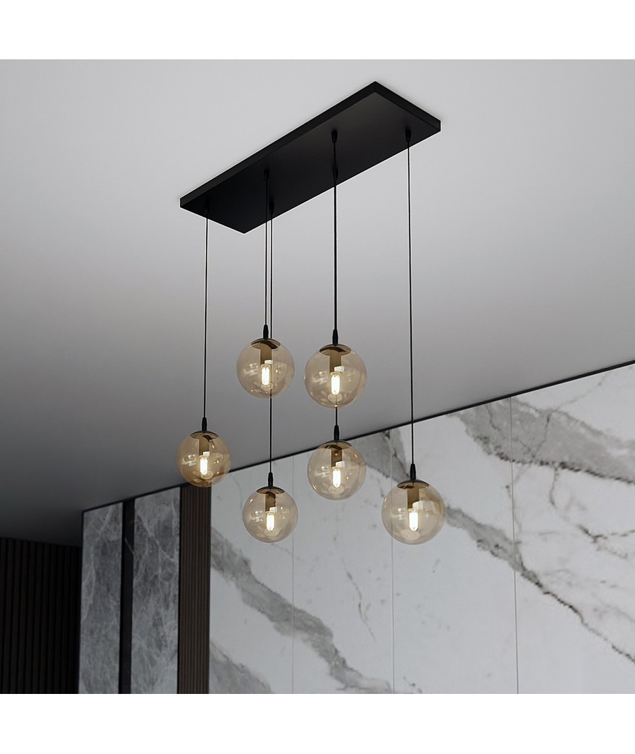 Skap den perfekte atmosfæren i hjemmet ditt med Cosmo 6 Sort/Rav pendellampe, og nyt den ultimate kombinasjonen av funksjonalitet og stil.