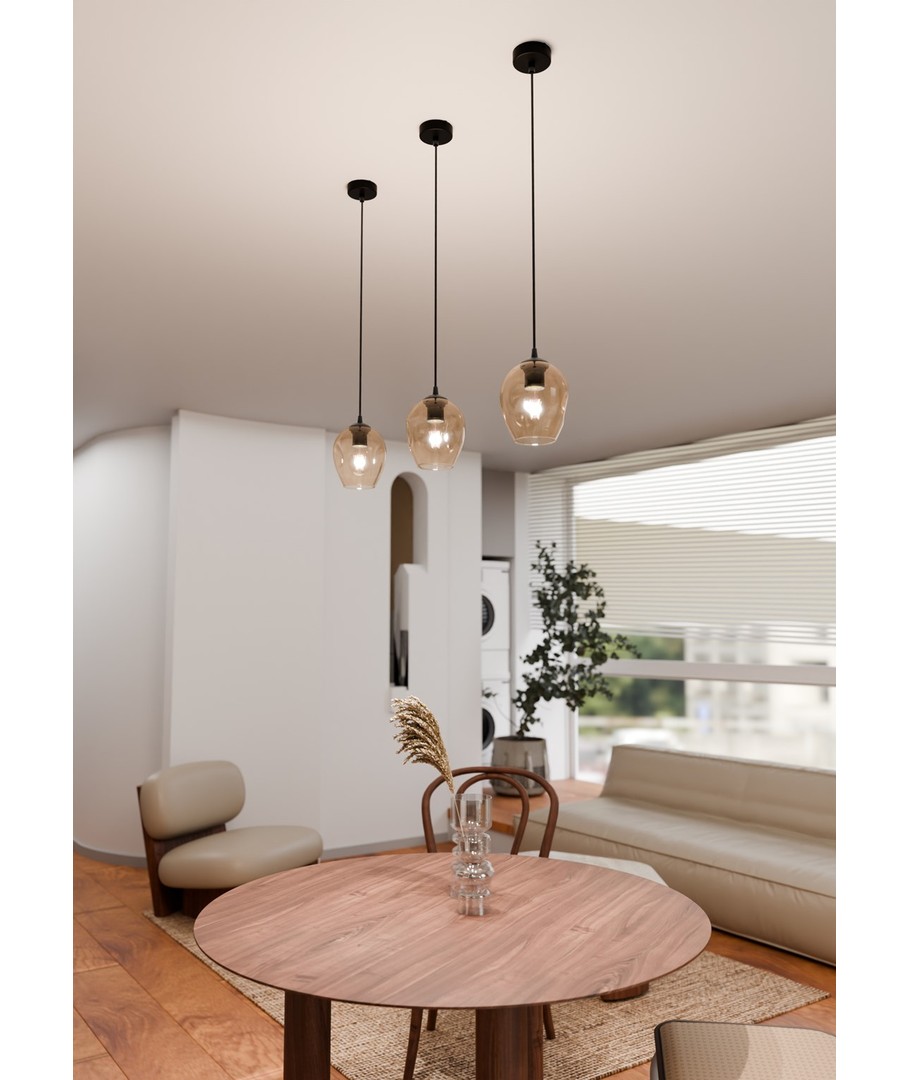 Den iøynefallende kontrasten mellom sort og amber finish gir pendellampen en unik karakter. Dens kompakte design med en diameter på Ø140 mm gjør den ideell for både større og mindre rom.