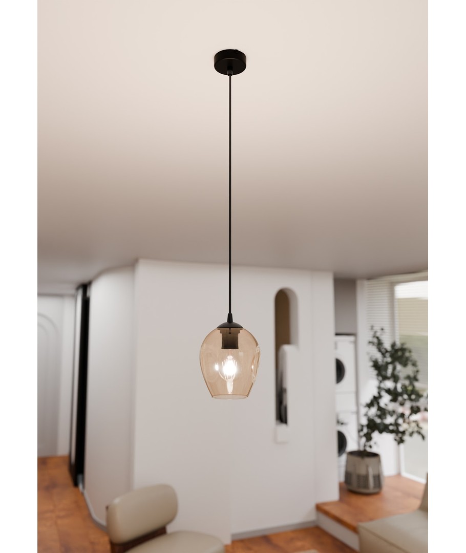Legg til et snev av eleganse i ditt hjem med vår stilfulle pendellampe i sort og amber. Denne lampen er designet for å gi en varm og innbydende atmosfære i ethvert rom. Med sin slanke og moderne form gir den et tidløst uttrykk som passer perfekt inn i din innredning.
