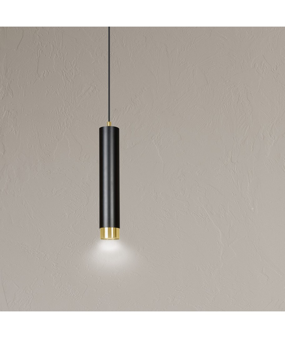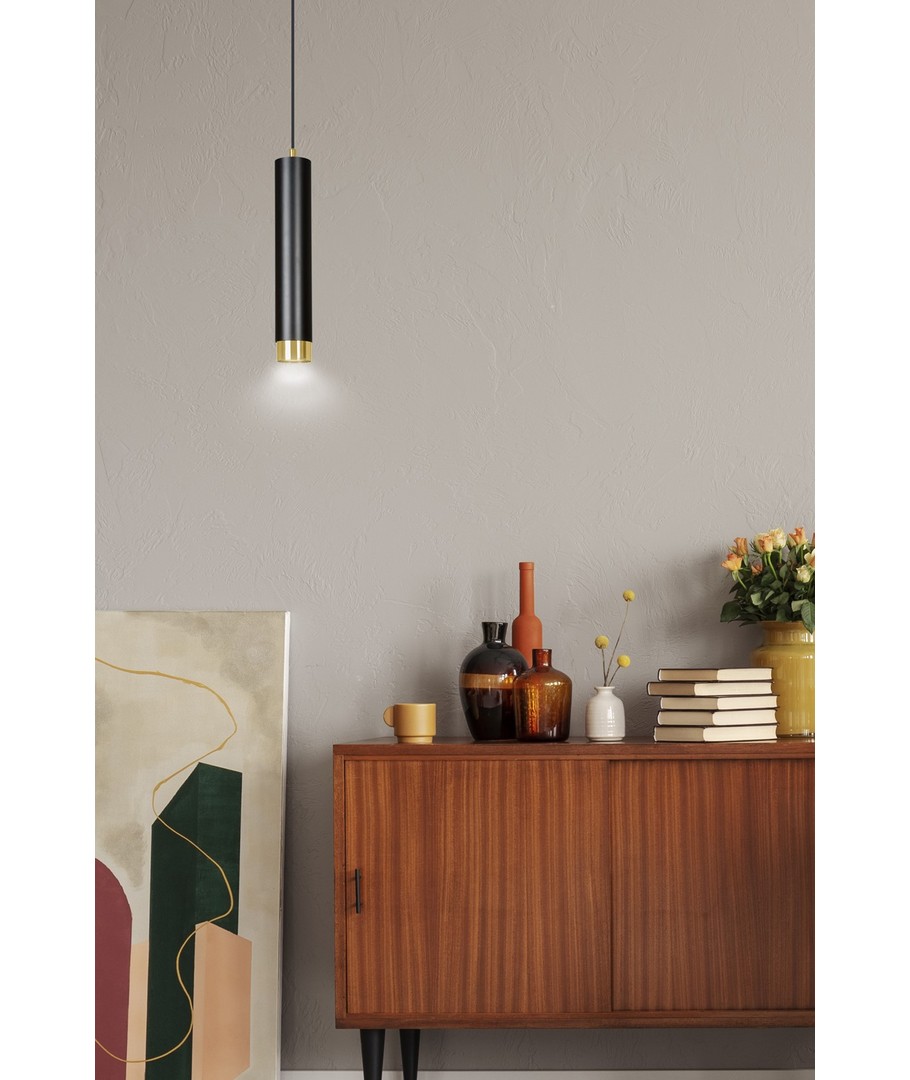 Denne pendellampen er utformet med en iøynefallende sort og gull finish, som gir et sofistikert uttrykk. Med sin slanke og minimalistiske design passer den perfekt over spisebordet, på kjøkkenet, eller i stuen. Den fungerer også utmerket som belysning i korridorer og entreer.