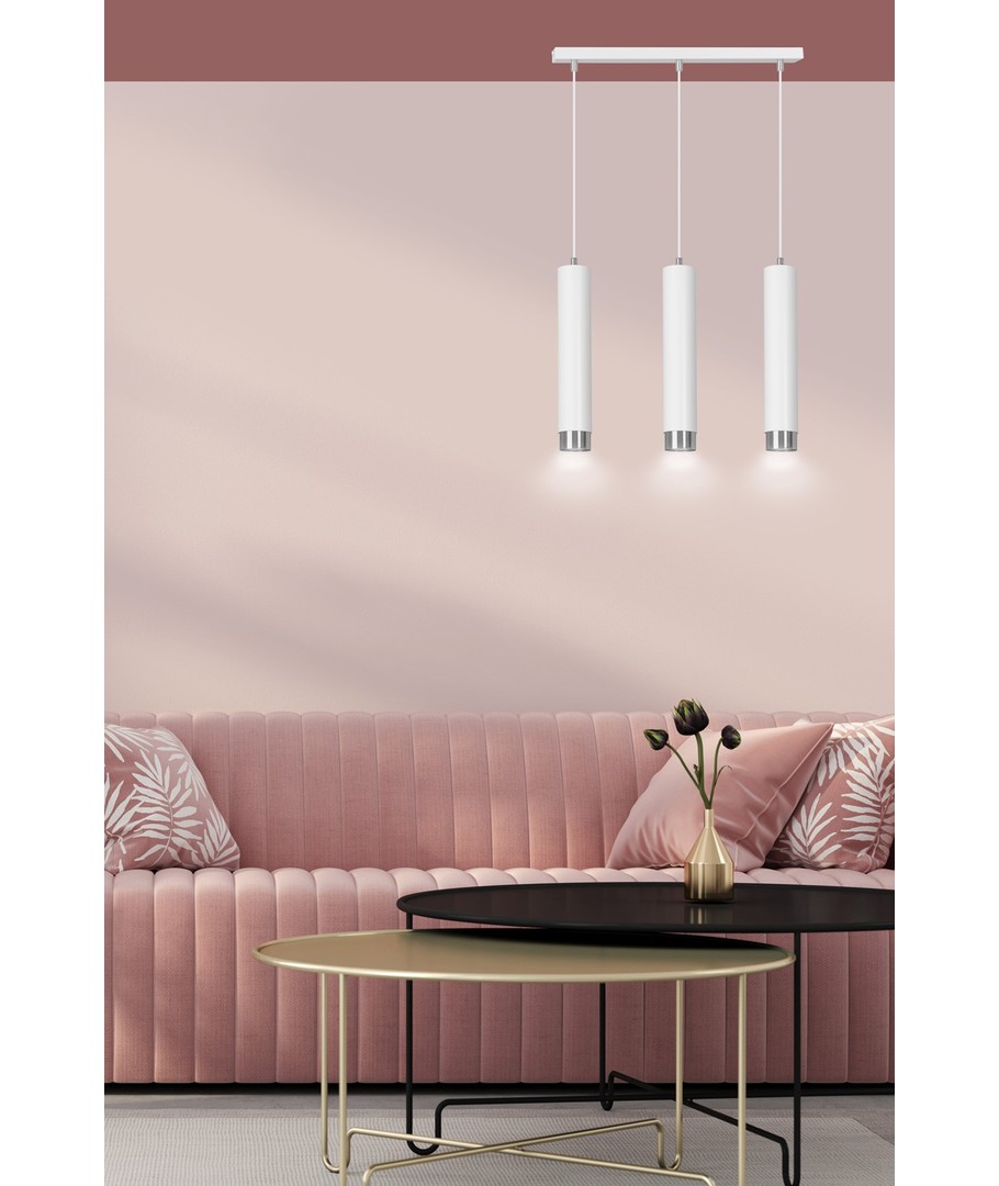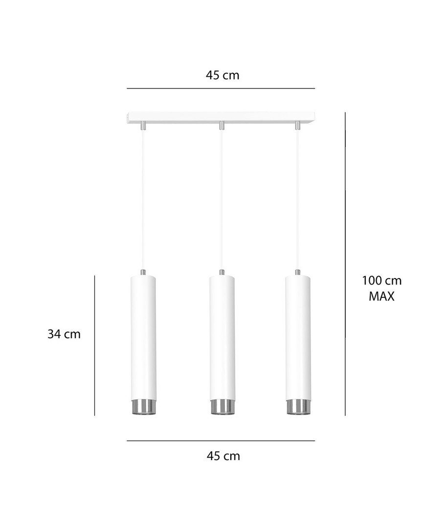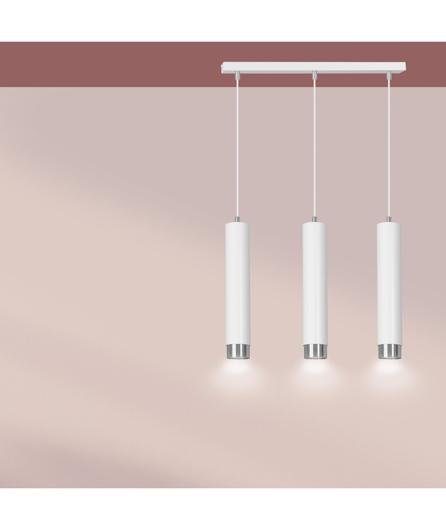 Kibo 3 pendellampe i hvitt og krom er en stilfull belysningsløsning som passer perfekt til ethvert moderne hjem. Med sin rørlignende konstruksjon i pulverlakkert stål tilbyr denne lampen et minimalistisk utseende som fremmer en elegant atmosfære i både stue, kjøkken eller hjemmekontor. Dens hvite og sølv detaljer tilfører en sofistikert touch, som gjør det enkelt å integrere lampen i din eksisterende innredning. Lampehøyden er justerbar, noe som gir deg fleksibilitet til å tilpasse den til dine spesifikke behov.