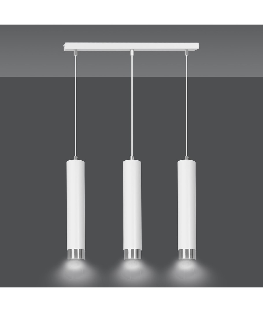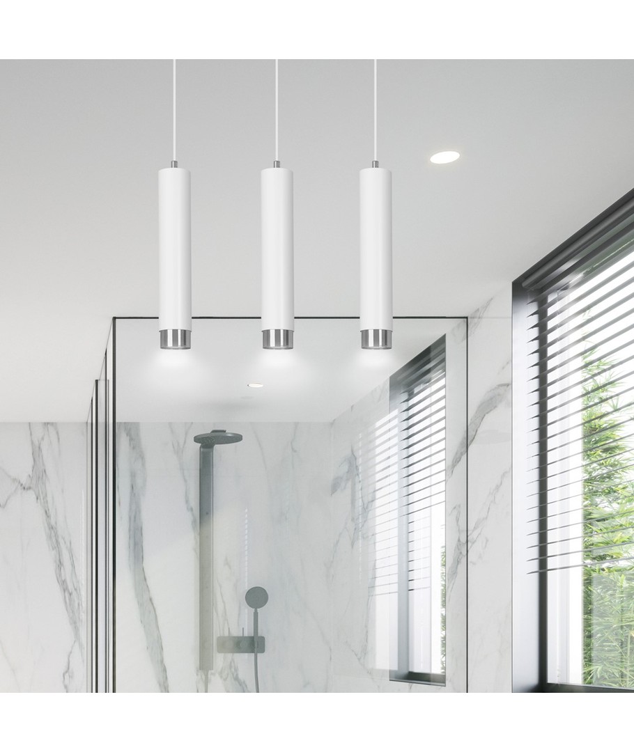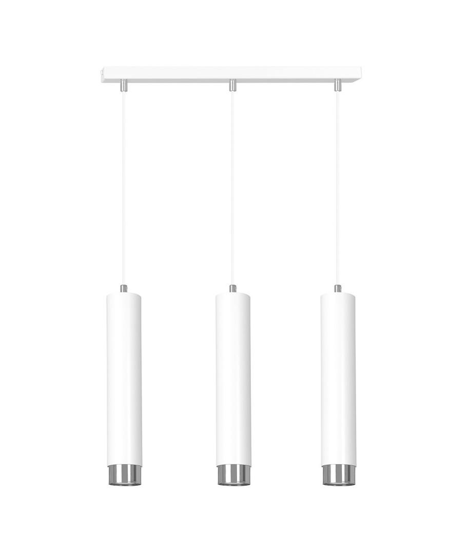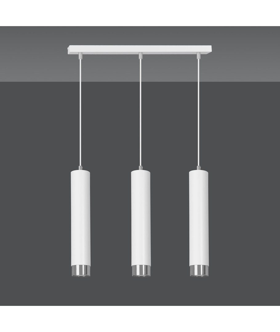 Kibo 3 pendellampe i hvitt og krom er en stilfull belysningsløsning som passer perfekt til ethvert moderne hjem. Med sin rørlignende konstruksjon i pulverlakkert stål tilbyr denne lampen et minimalistisk utseende som fremmer en elegant atmosfære i både stue, kjøkken eller hjemmekontor. Dens hvite og sølv detaljer tilfører en sofistikert touch, som gjør det enkelt å integrere lampen i din eksisterende innredning. Lampehøyden er justerbar, noe som gir deg fleksibilitet til å tilpasse den til dine spesifikke behov.