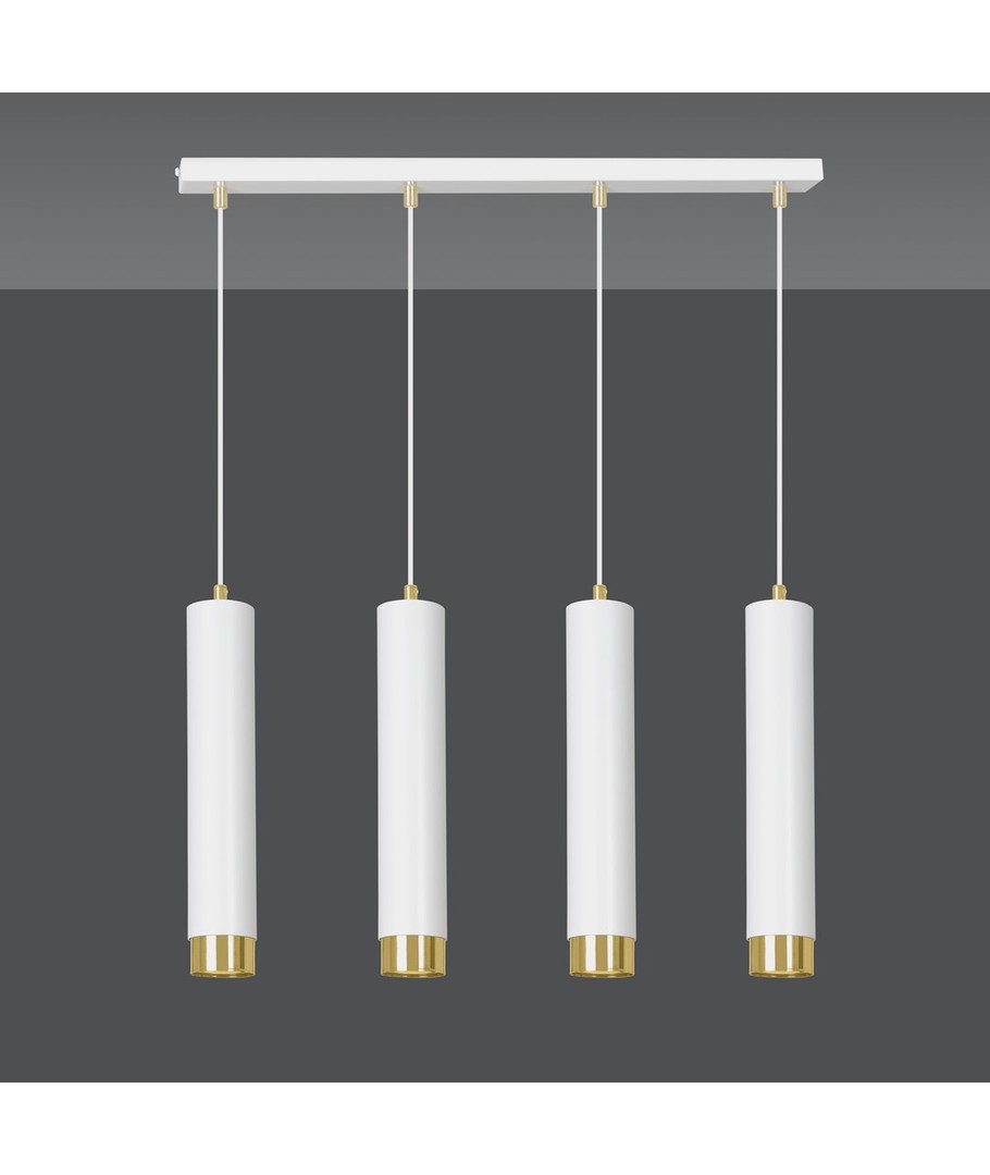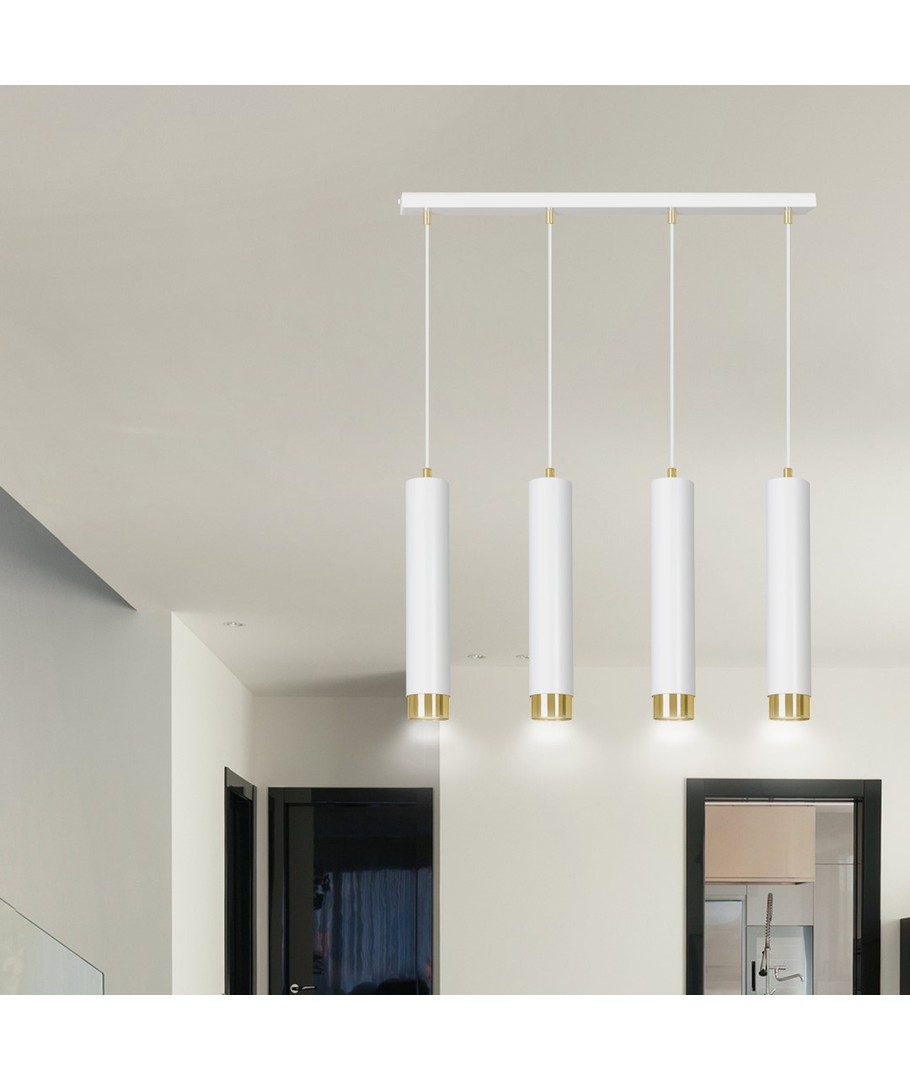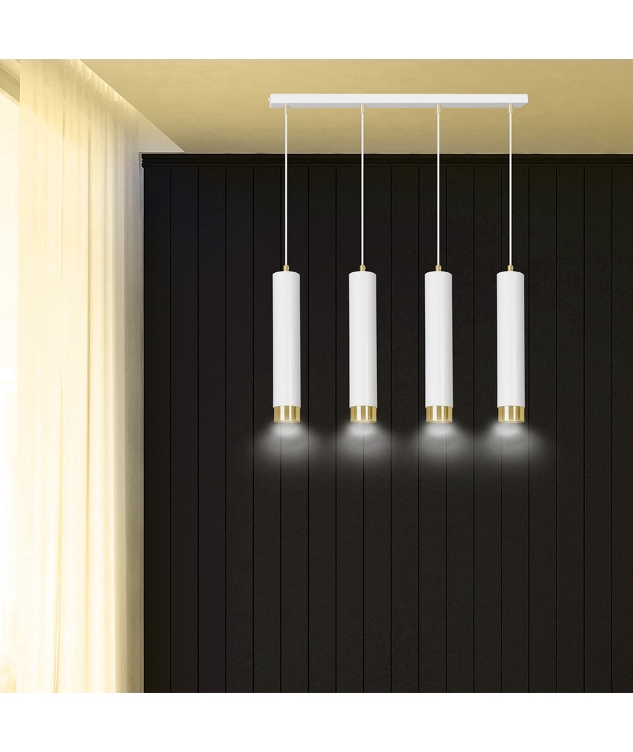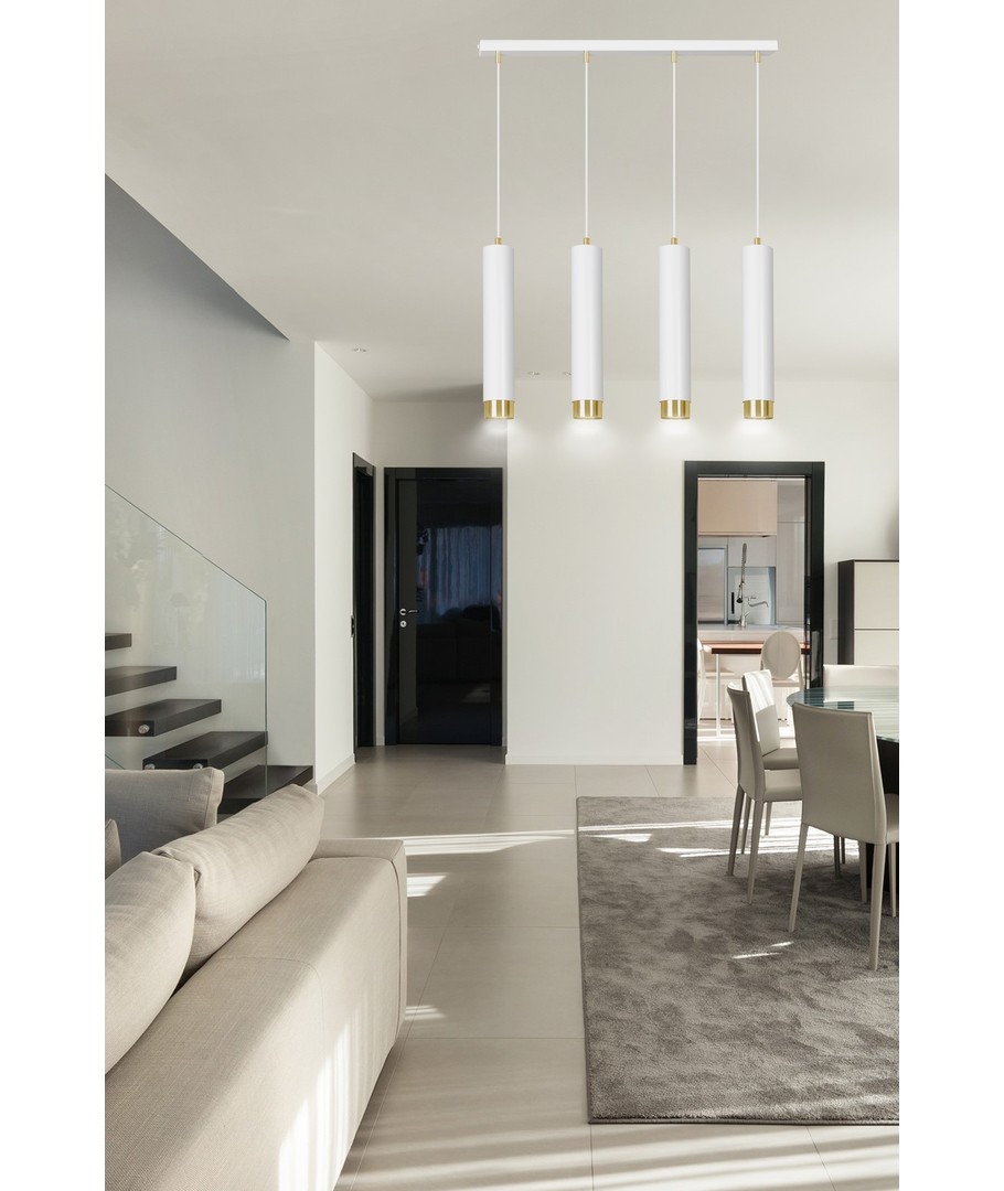 Kibo 4 Hvit/Gull pendellampen representerer et stilfullt valg med sitt moderne rørformede design, som elegant kombinerer hvitt og gull. Denne pendellampen er laget av pulverlakkert stål, noe som gir den en både robust og elegant finish, som passer perfekt inn i enhver innredning. Med sitt allsidige design kan Kibo-lampen lett brukes i både stue, kjøkken eller hjemmekontor, hvor den tilfører et sofistikert preg. Lampen er designet for å kunne tilpasses med justerbar høyde, slik at den kan tilpasses dine spesifikke behov.