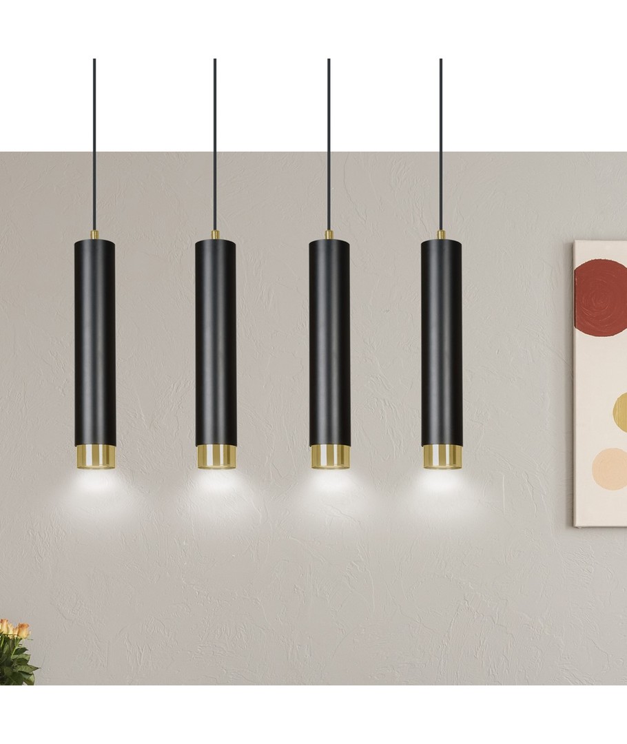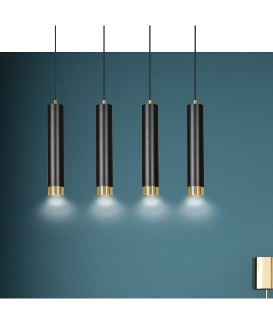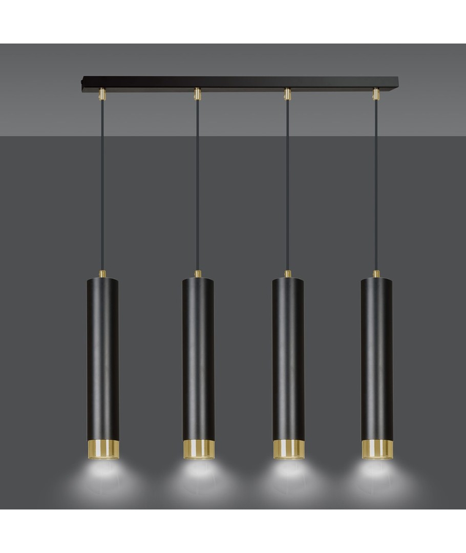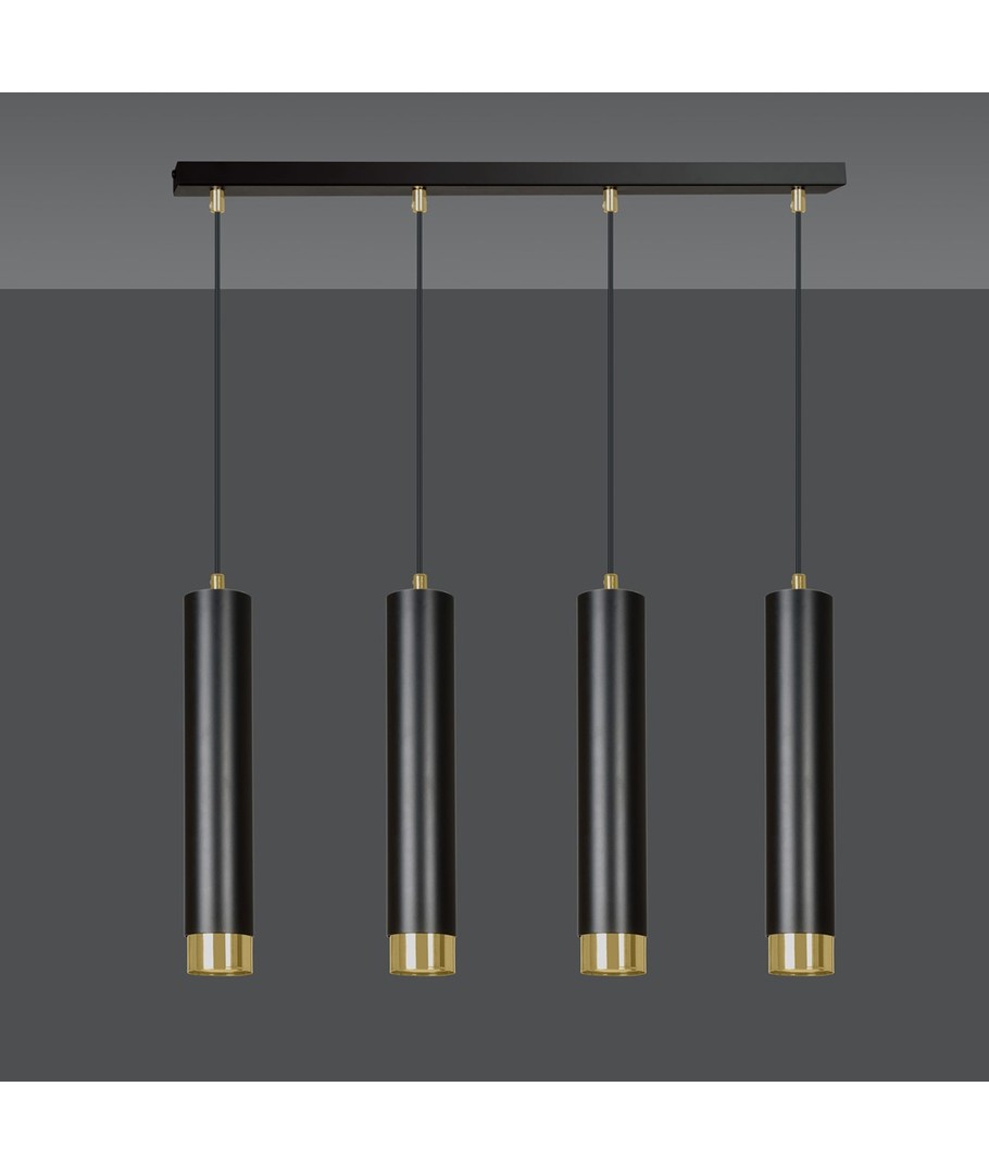 Gi ditt interiør et løft med Kibo 4 Sort/Gull pendellampe, som kombinerer form, funksjon og stil.