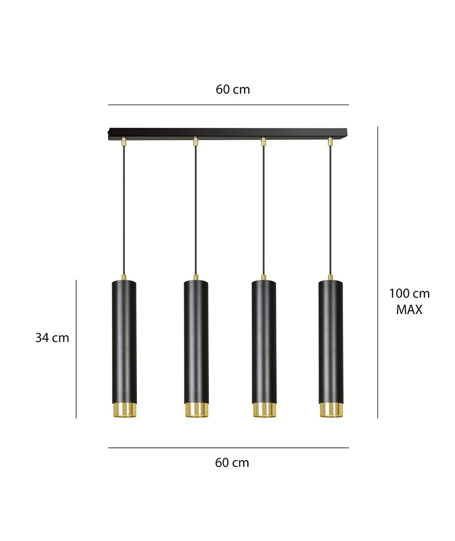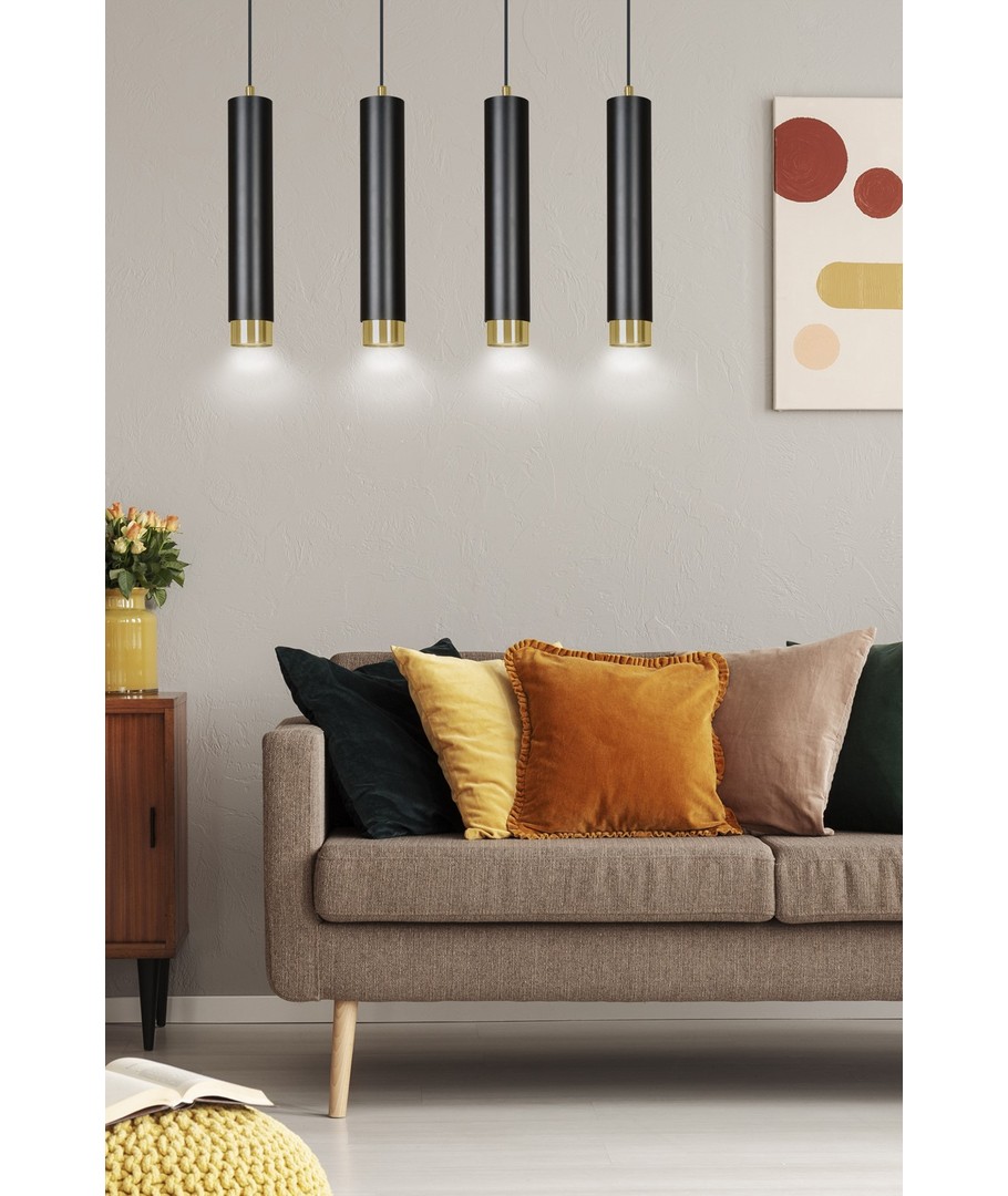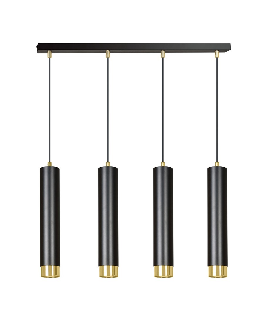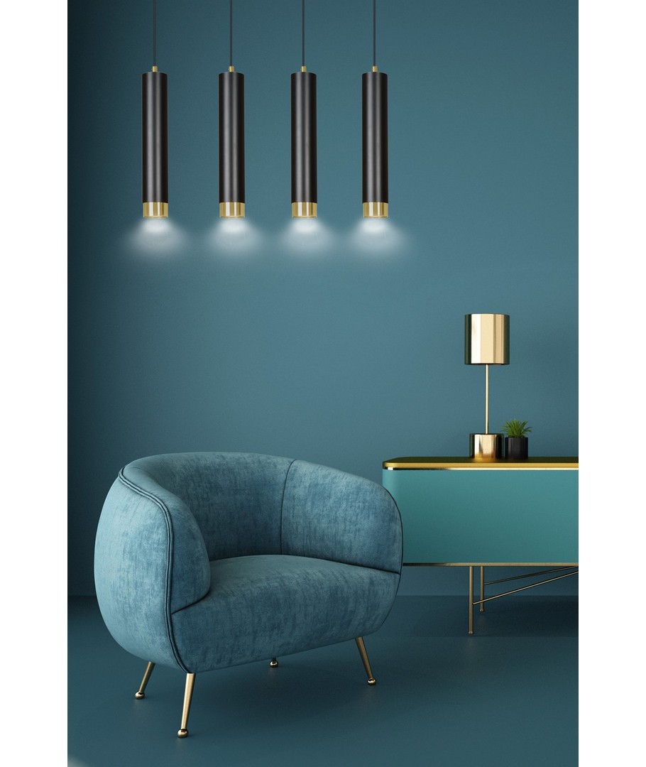 Gi ditt interiør et løft med Kibo 4 Sort/Gull pendellampe, som kombinerer form, funksjon og stil.