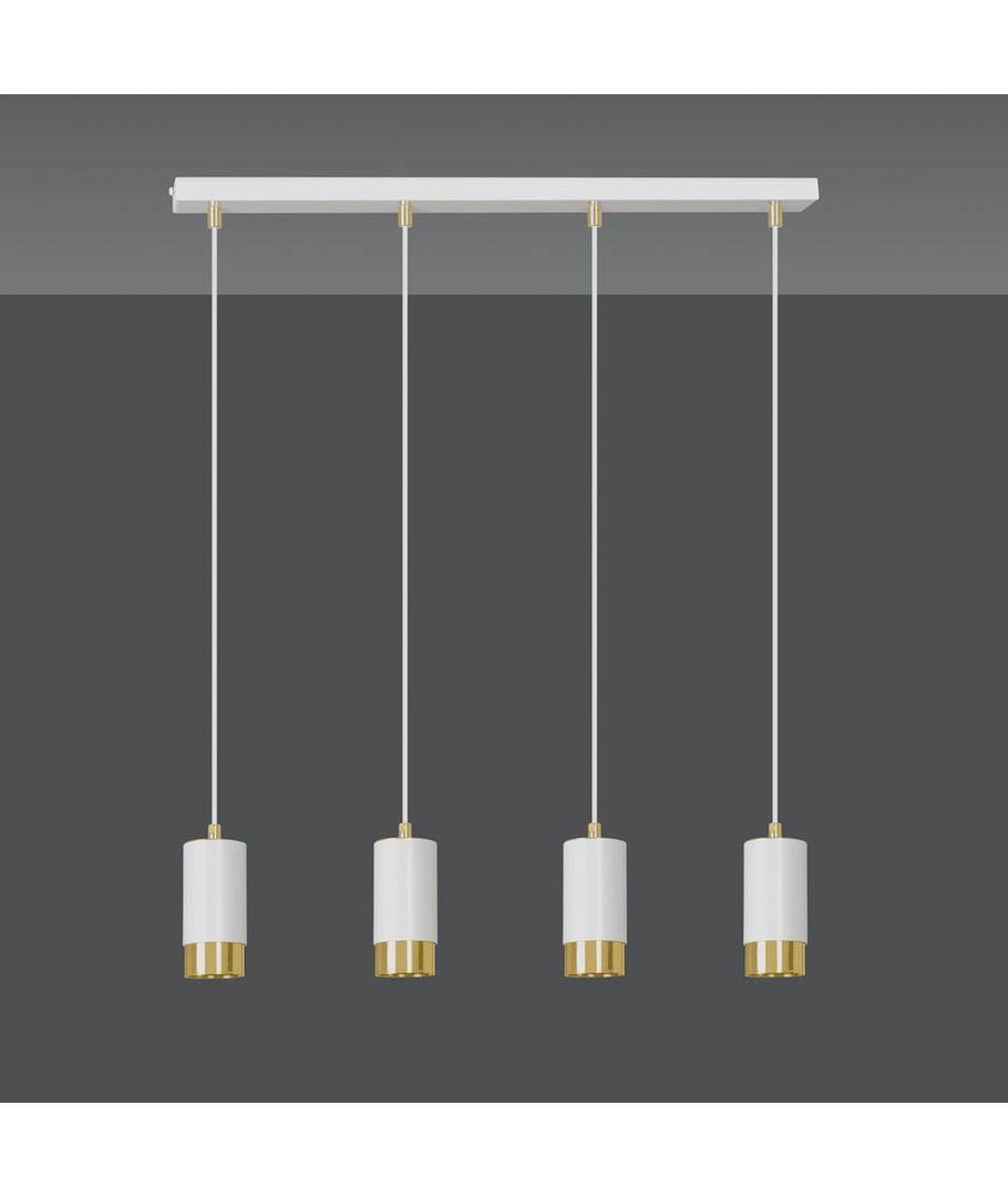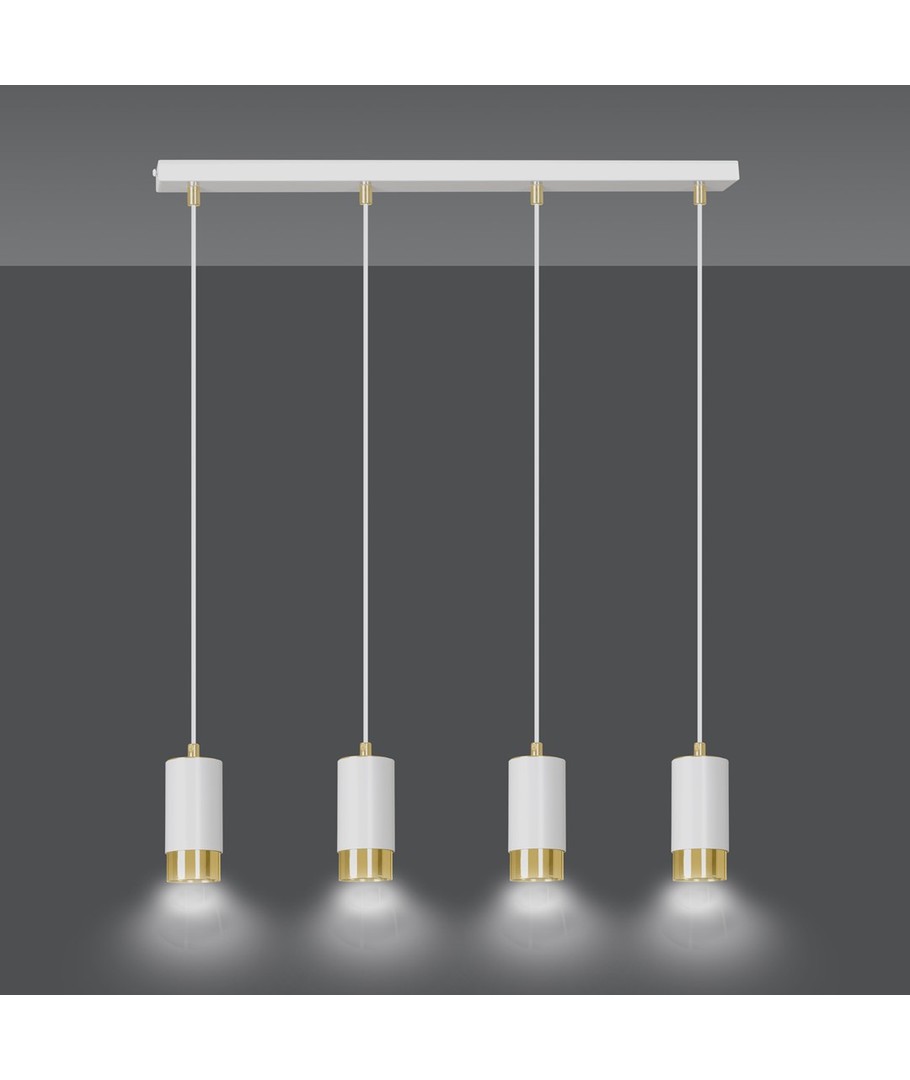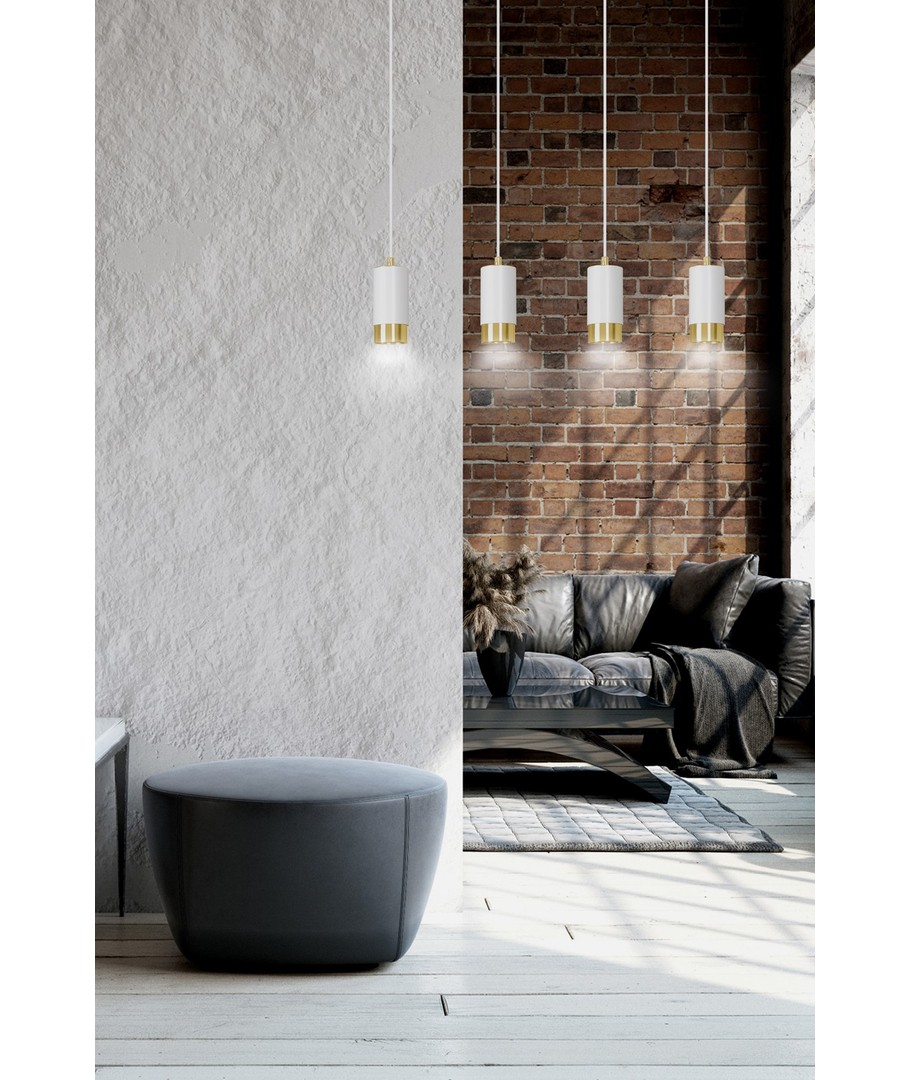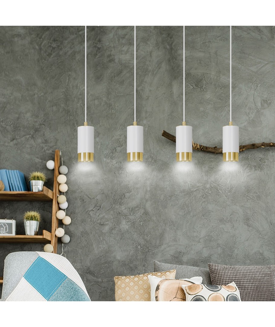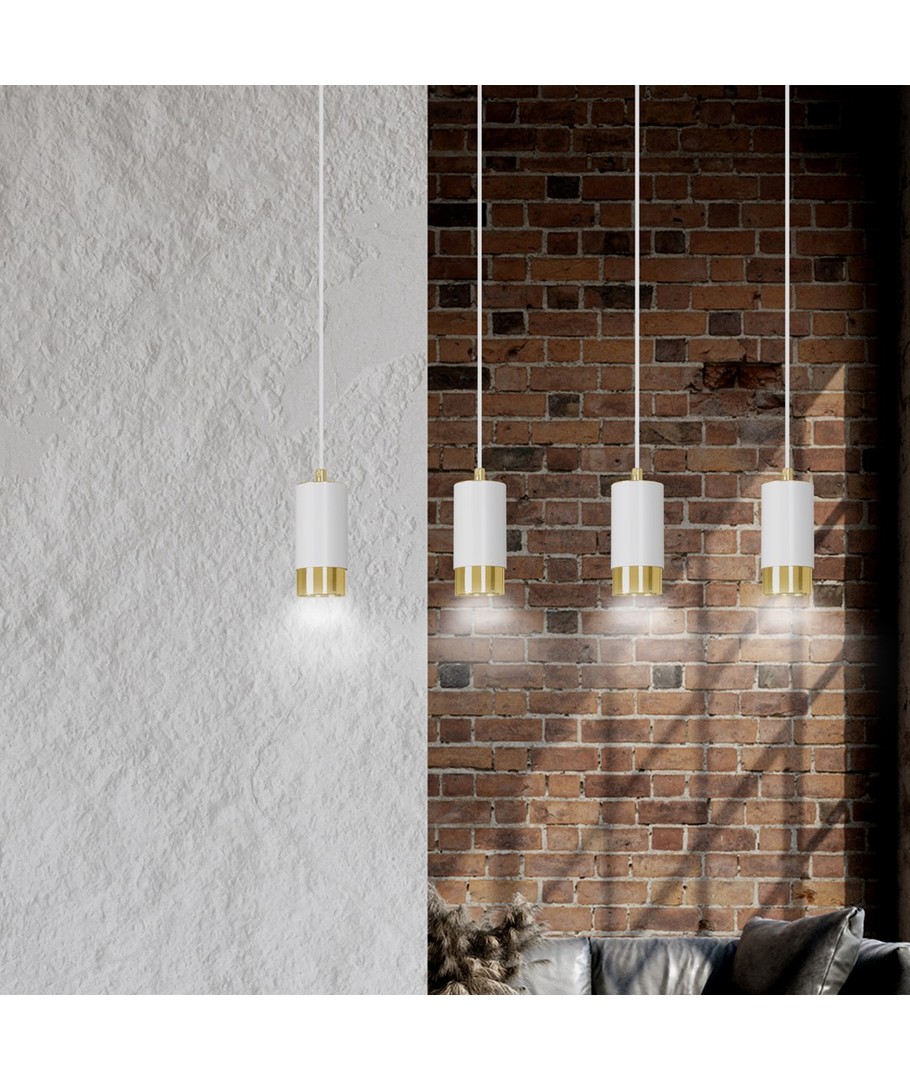 Kombinasjonen av hvite lamper med delikate gullelementer gir denne pendellampen et rent og luksuriøst utseende. Enkel, men elegant, det passer perfekt i stuer, spisestuer eller på kjøkkenet over en øy.