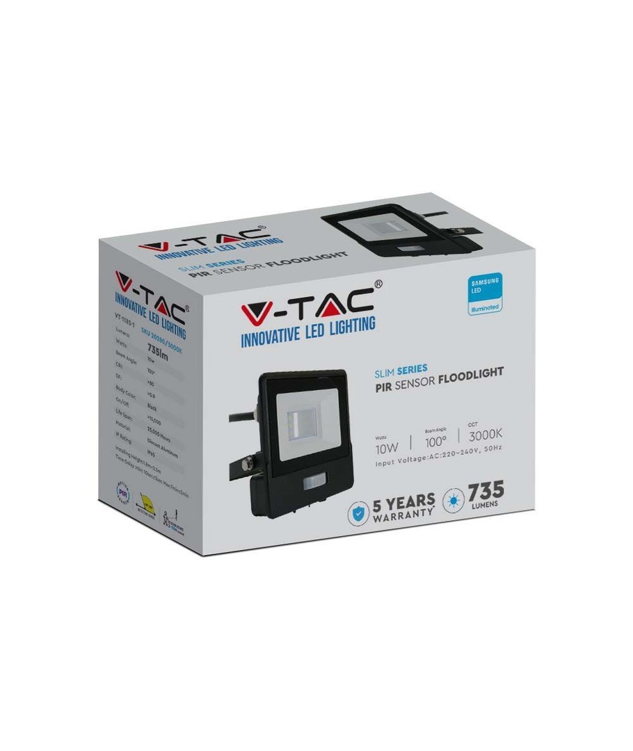 Opplev kraftig belysning i et kompakt design med V-Tac 10W Lyskaster med sensor, utstyrt med Samsung LED chip. Denne lyskasteren er ideell for både private og kommersielle områder, og er skapt for å gi langvarig og pålitelig belysning.